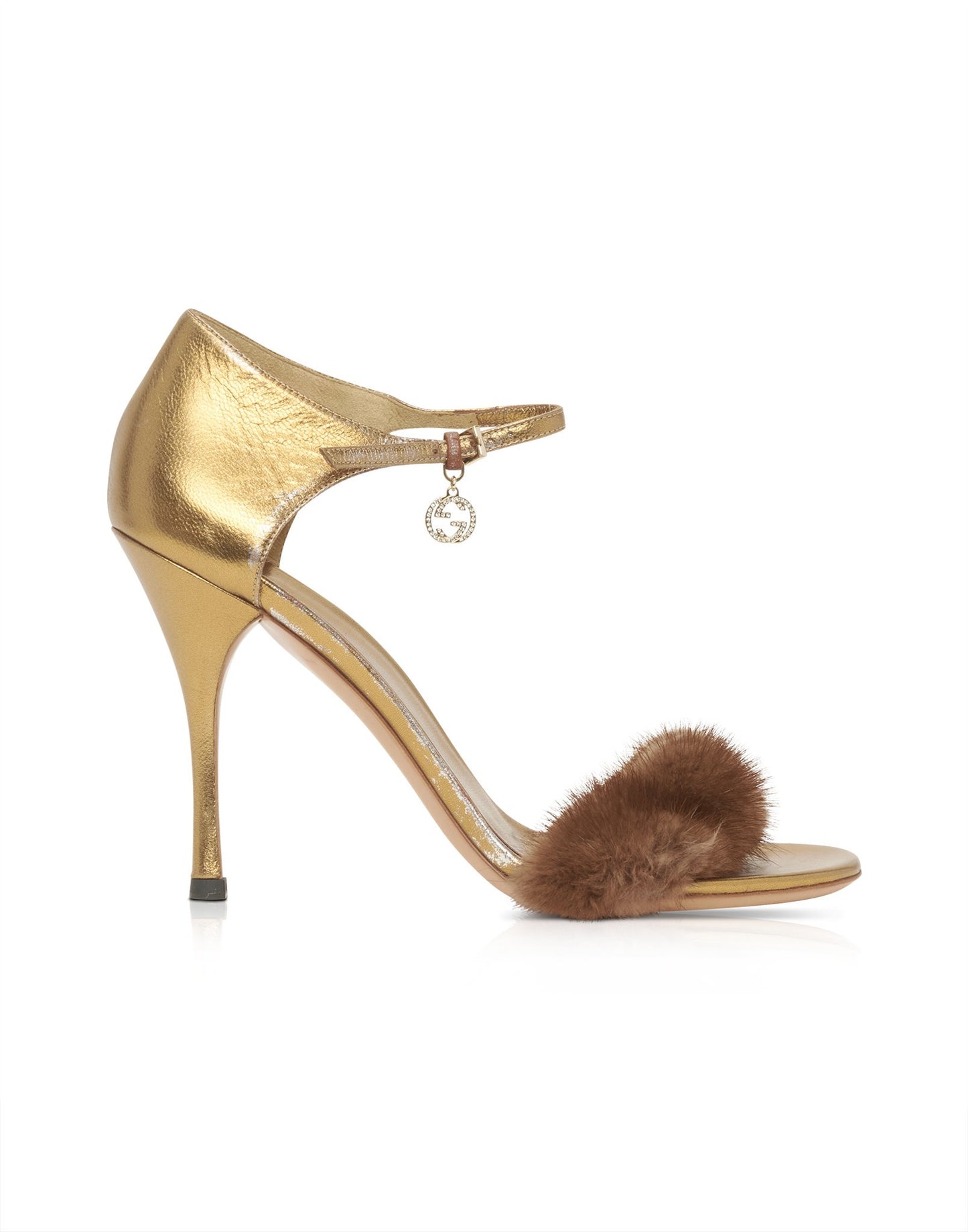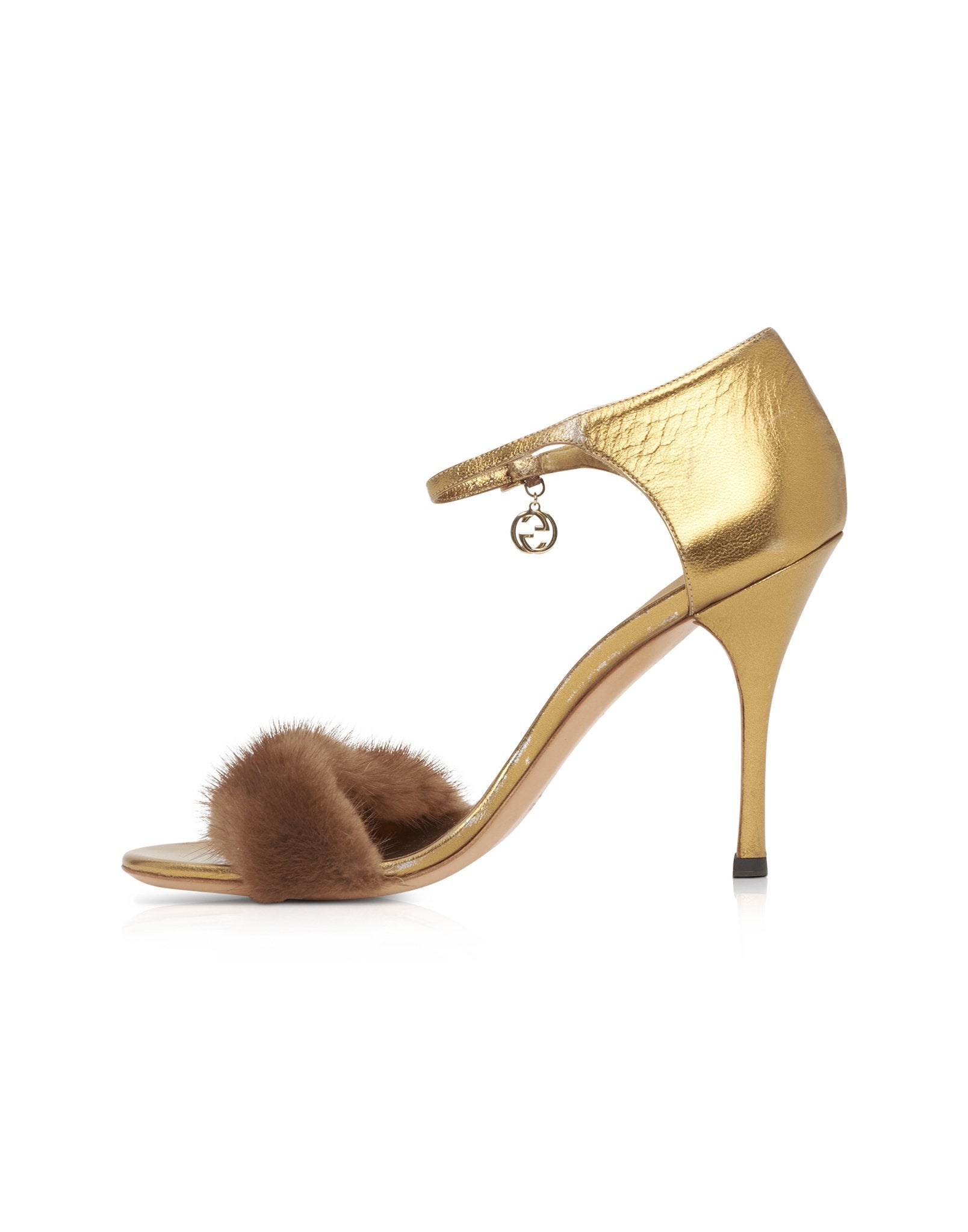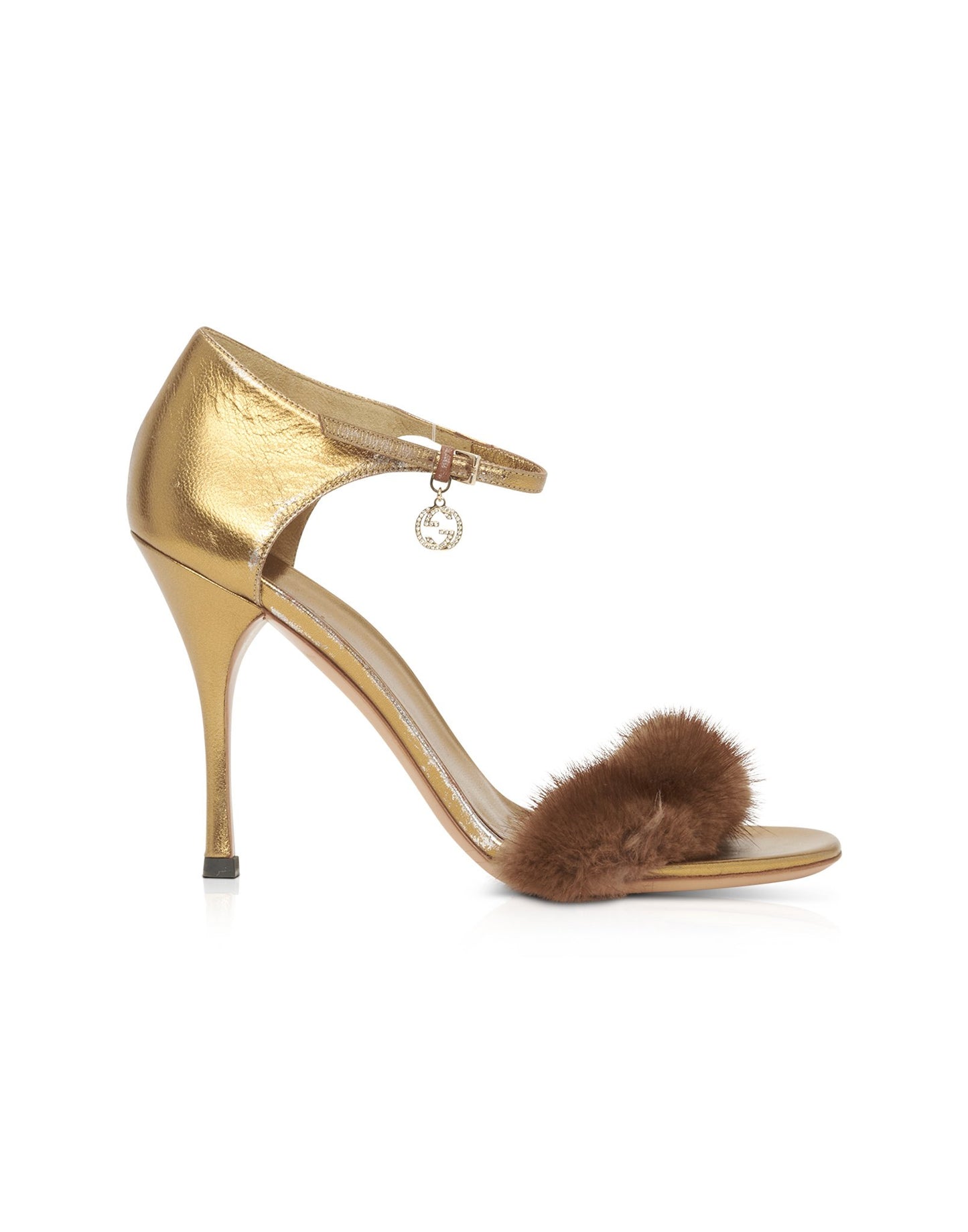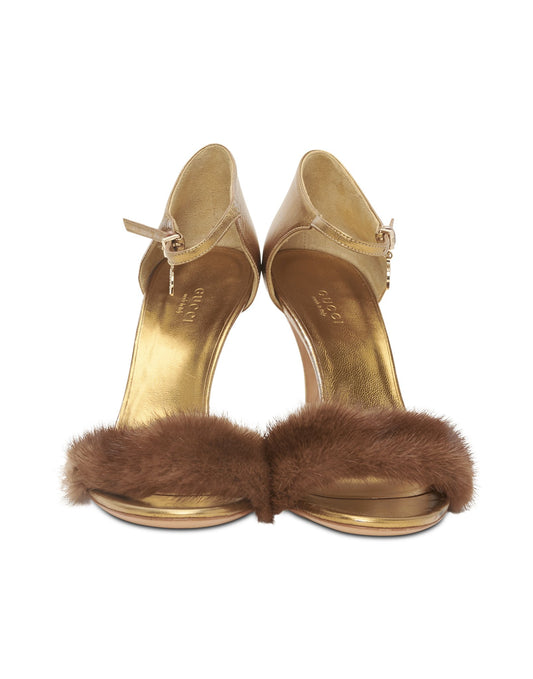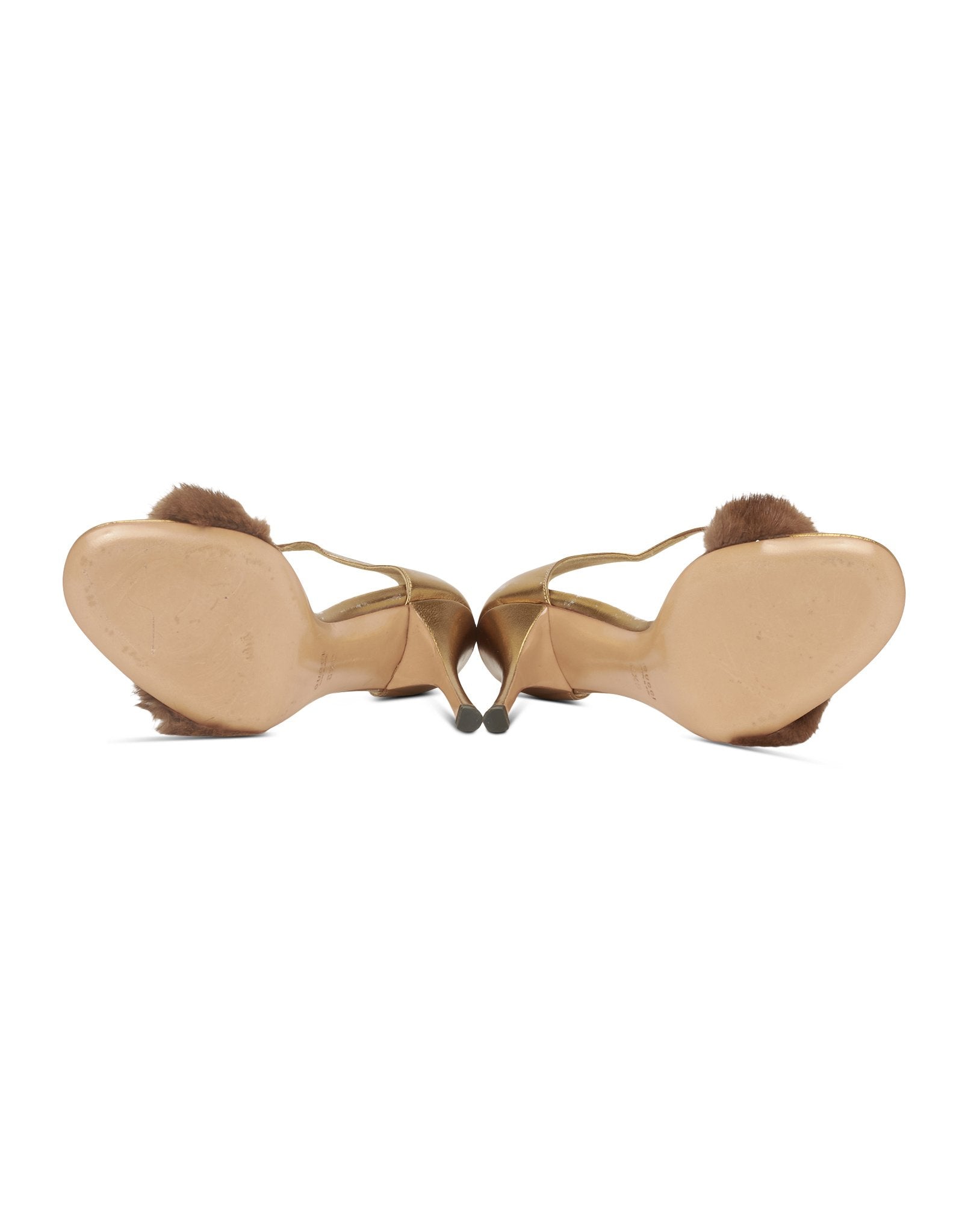 Gold "Tom Ford Era" Brown Fur Open Toe Heeled Sandals - 8.5B