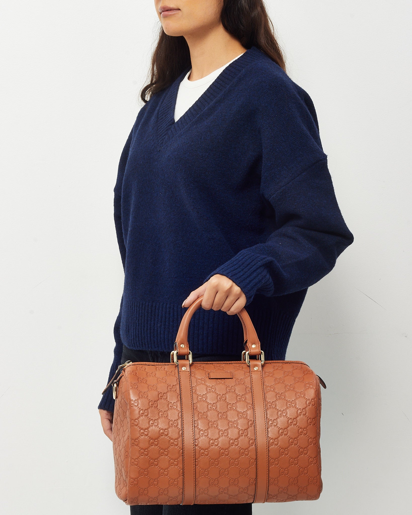 Brighten your accessories rotation with this pre-loved authentic Gucci Orange Tan Signature GG Monogram Leather Medium Joy Boston Bag. Crafted from embossed GG monogram leather in a vibrant orange-tan hue, this structured silhouette features gold-tone hardware, rolled leather top handles, and a spacious interior perfect for everyday essentials. The zip-top closure ensures secure storage, while the sleek, compact shape adds a polished finish to any look. Timeless yet playful, it’s a standout piece that captures Gucci’s iconic heritage with bold flair.
