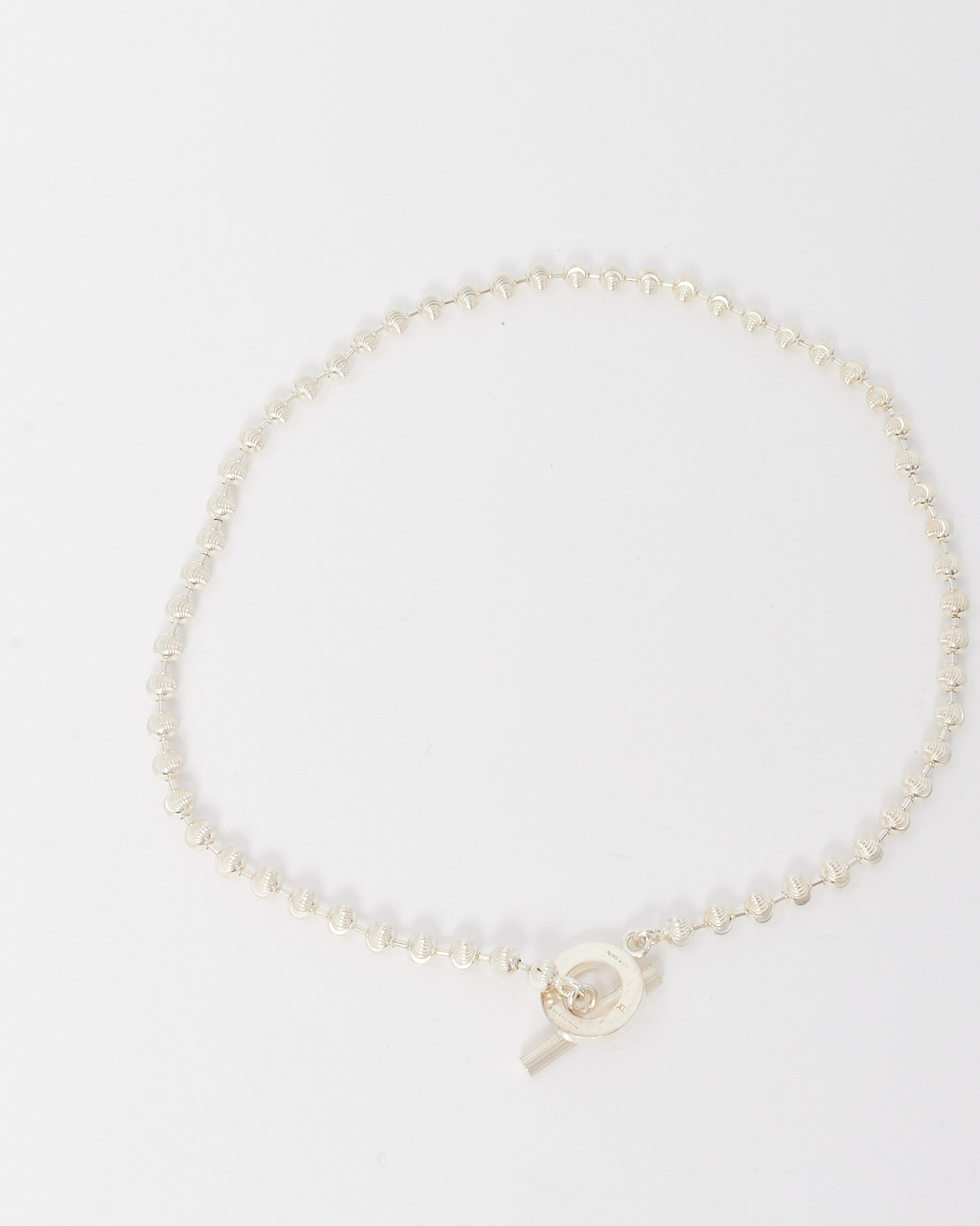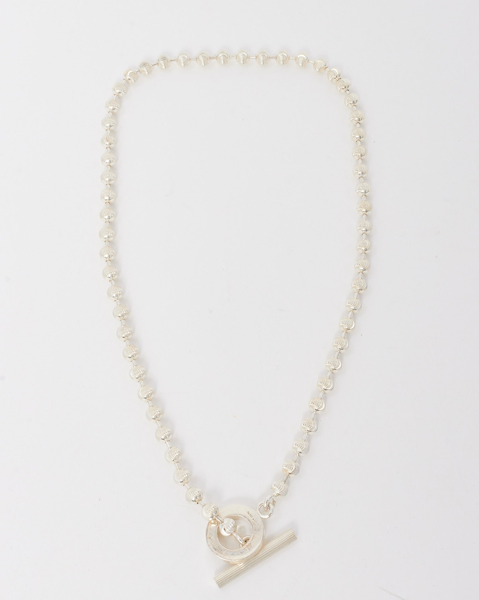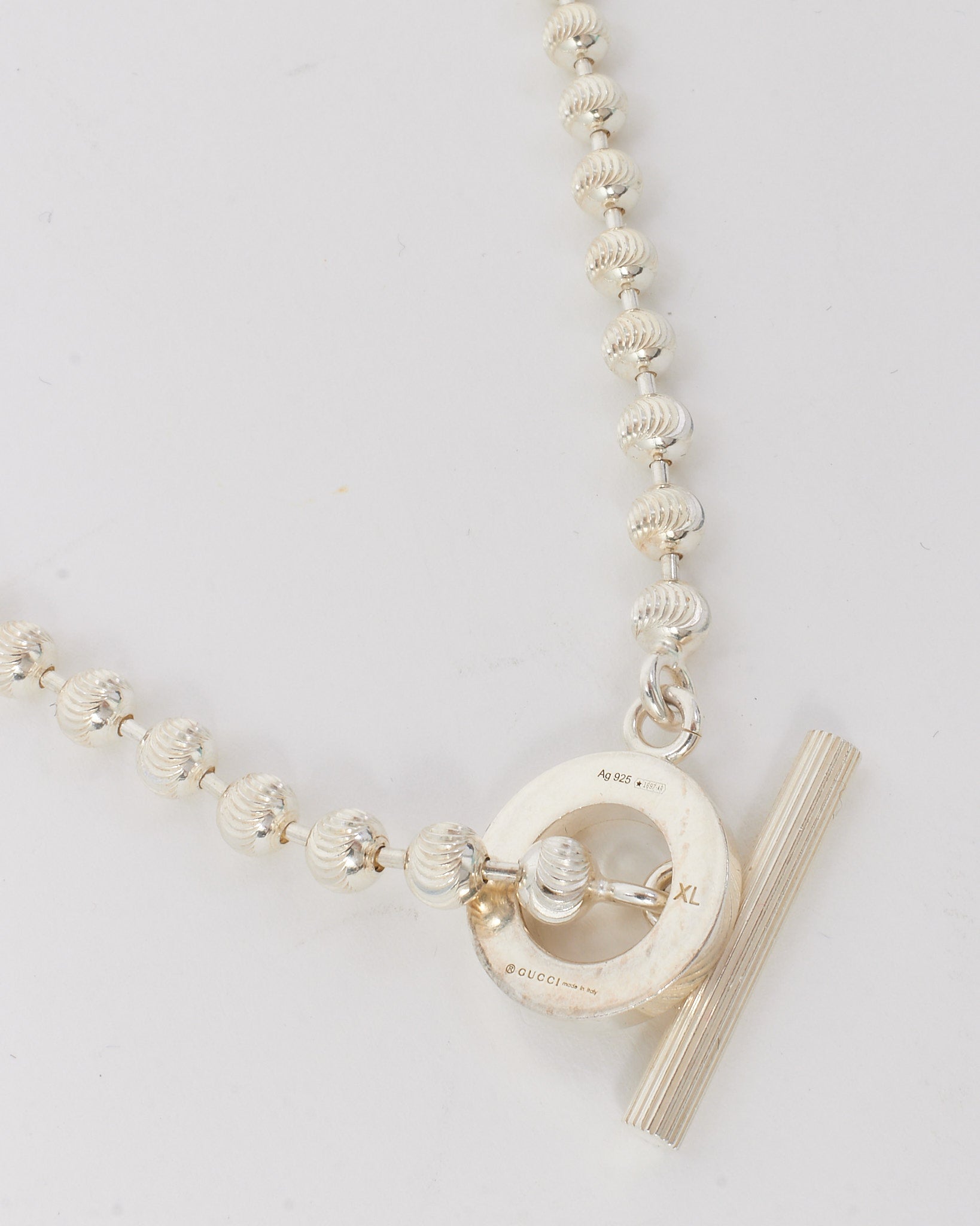 Add distinctive edge to your accessories collection with this pre-loved authentic Gucci Sterling Silver Boule Beaded Toggle Necklace. Crafted in polished sterling silver, this necklace showcases a strand of spherical boule beads and is finished with a statement toggle clasp engraved with the iconic Gucci logo. Versatile and gender-neutral, it offers effortless elegance whether worn solo or layered. A timeless piece that captures the house’s sleek, modern aesthetic, perfect for both everyday wear and elevated styling.