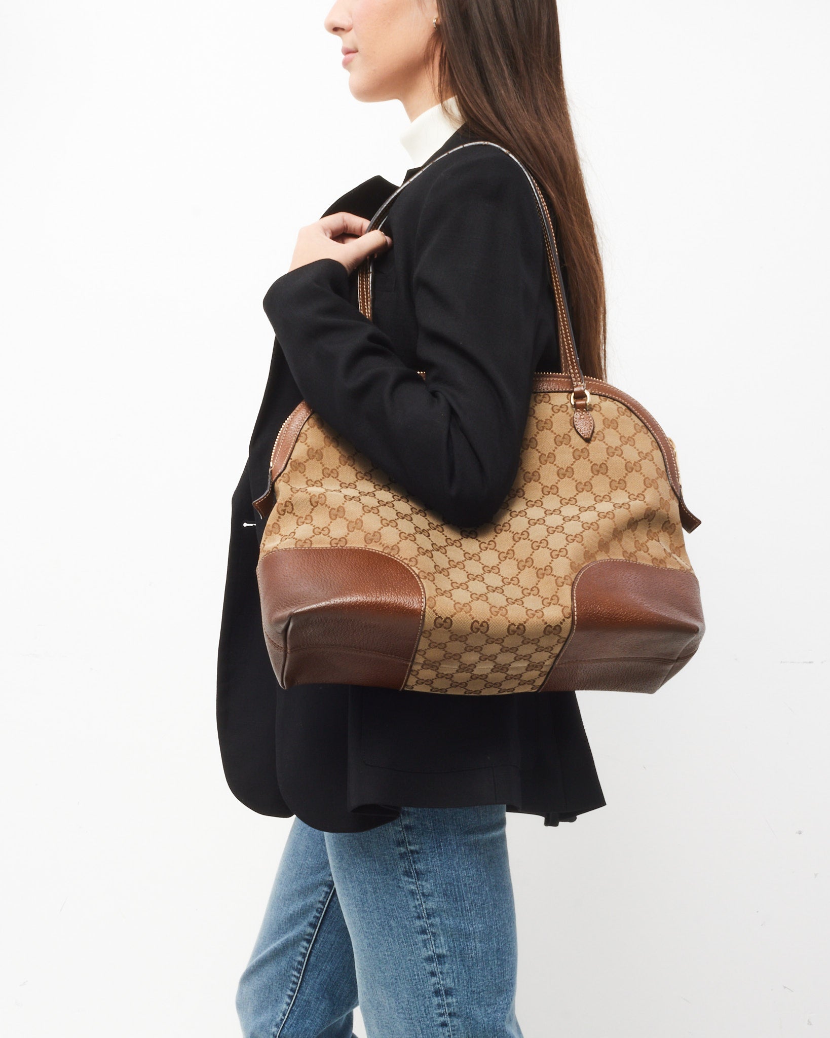 Tan Leather Beige and Ebony GG Monogram Canvas Medium Bree Shoulder Bag