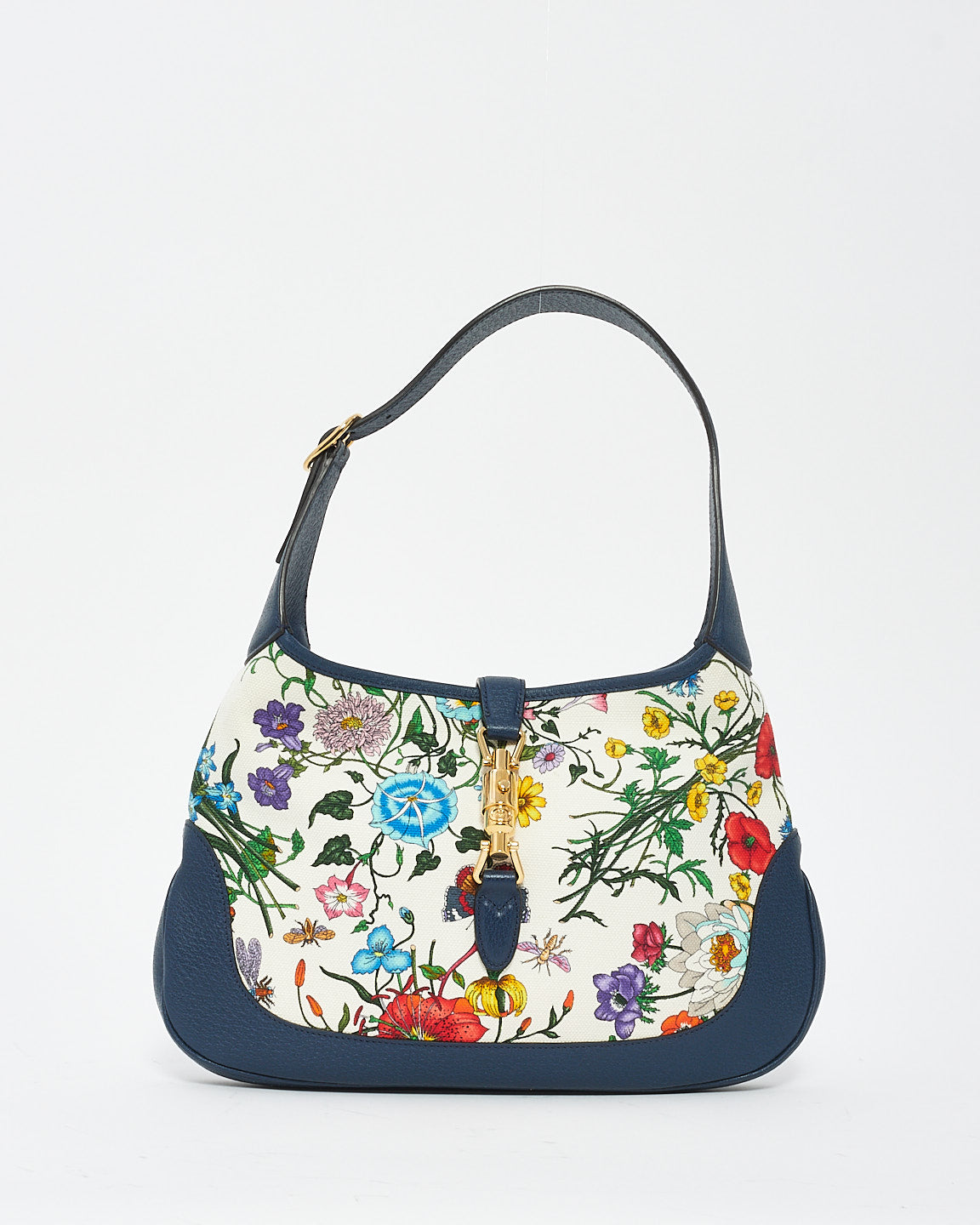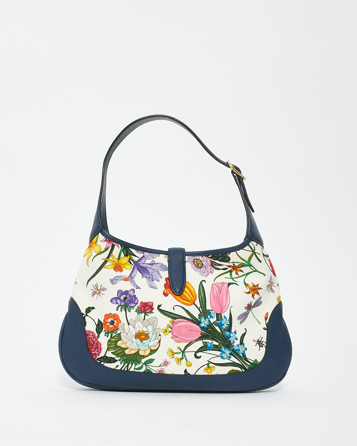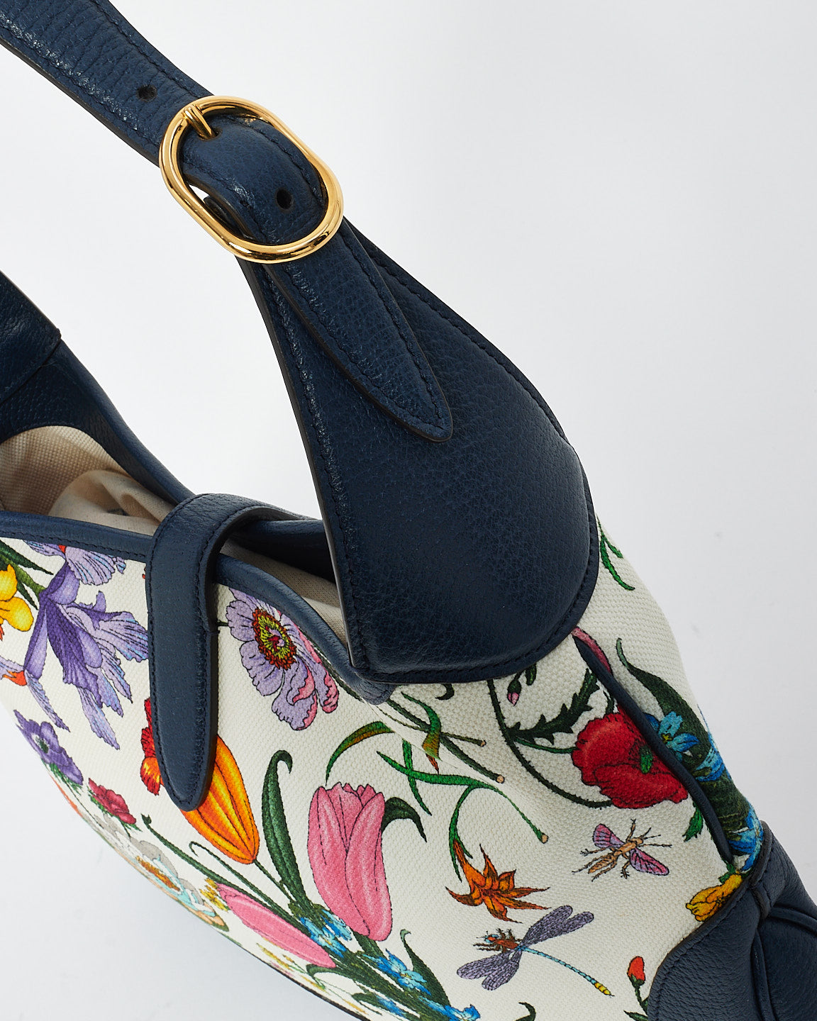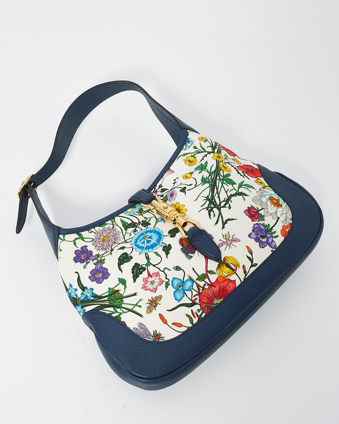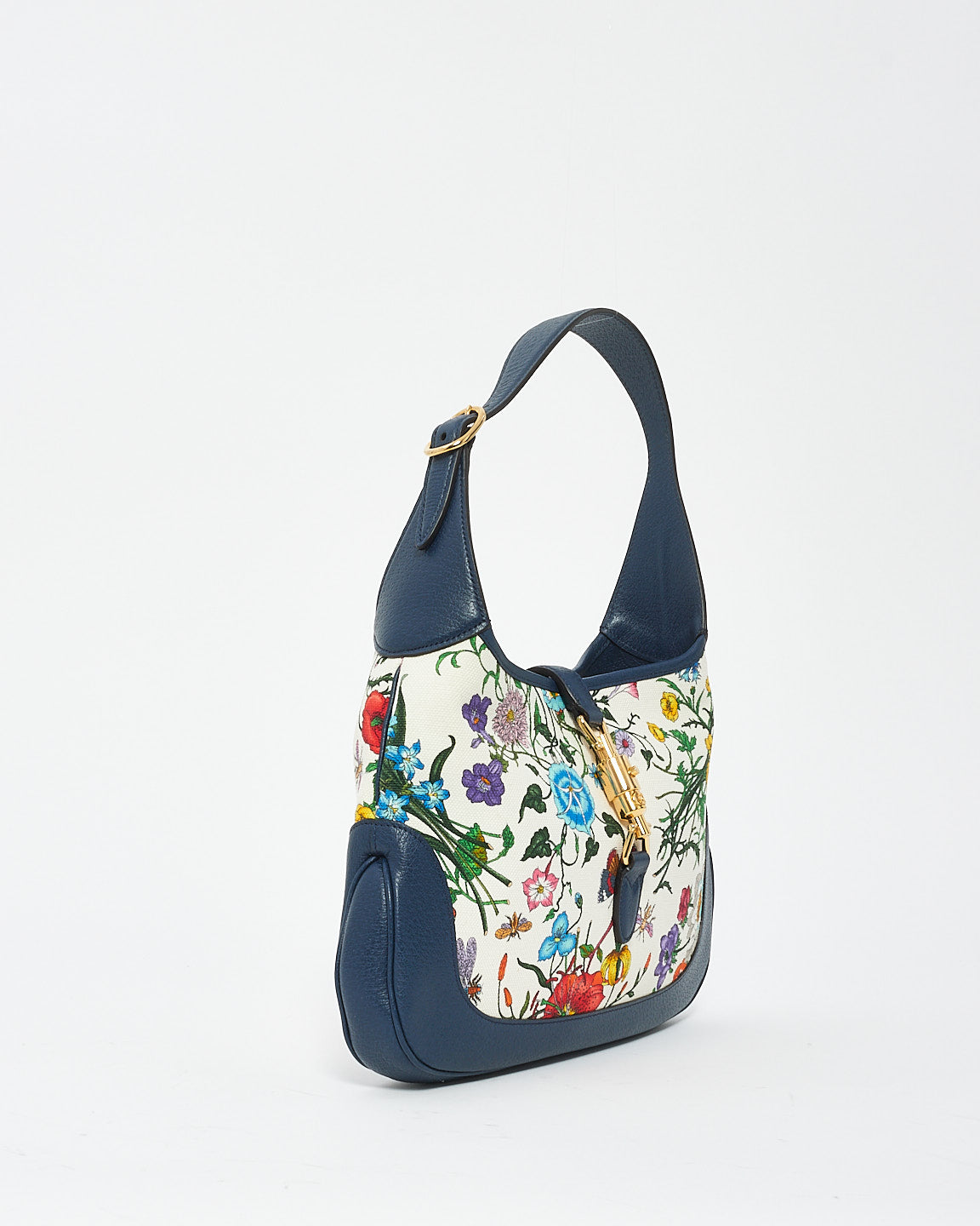 White/Blue Flora Print Medium Jackie Hobo Bag