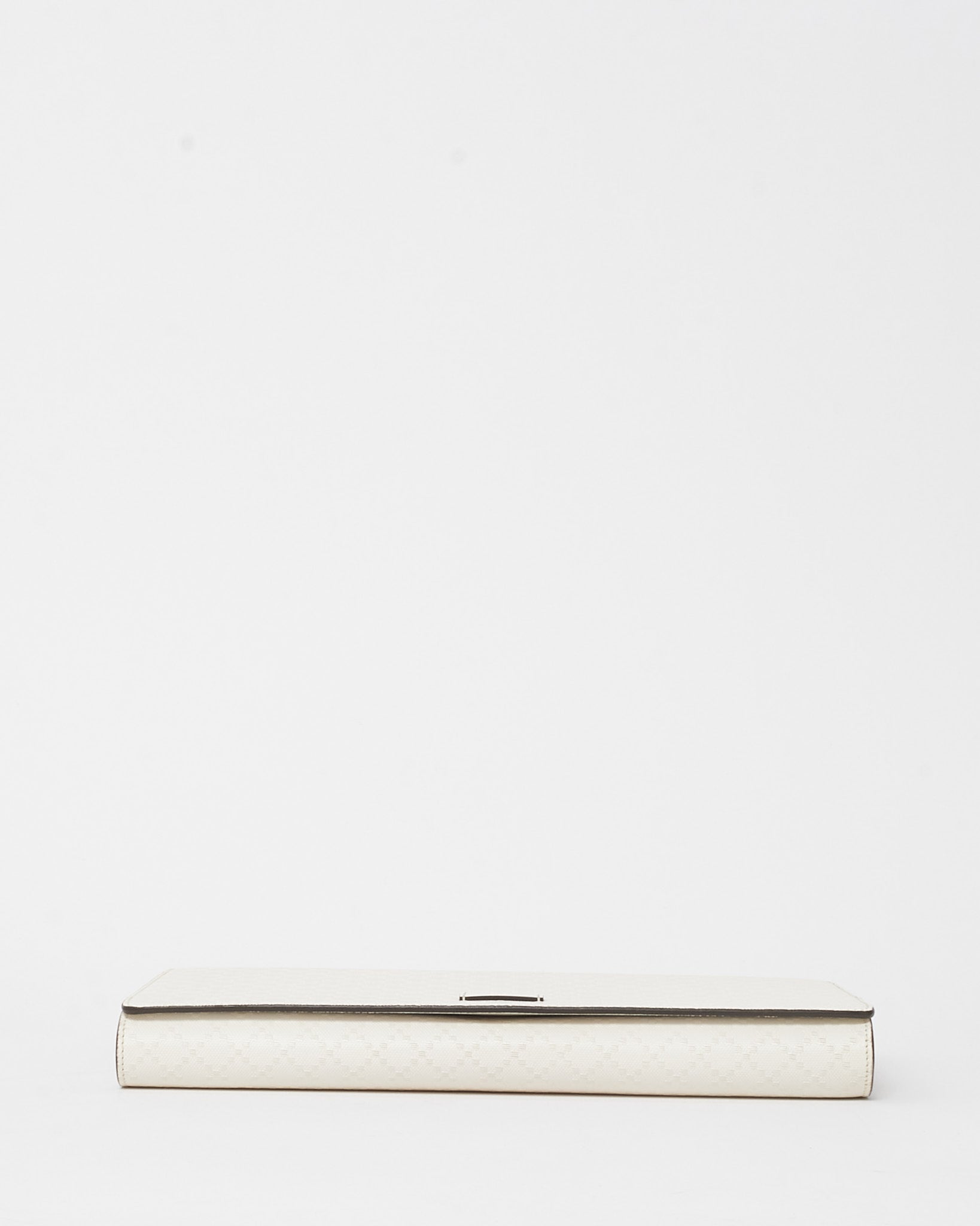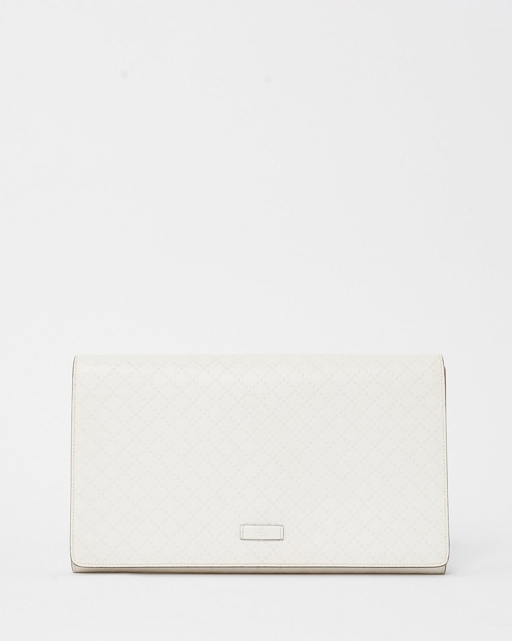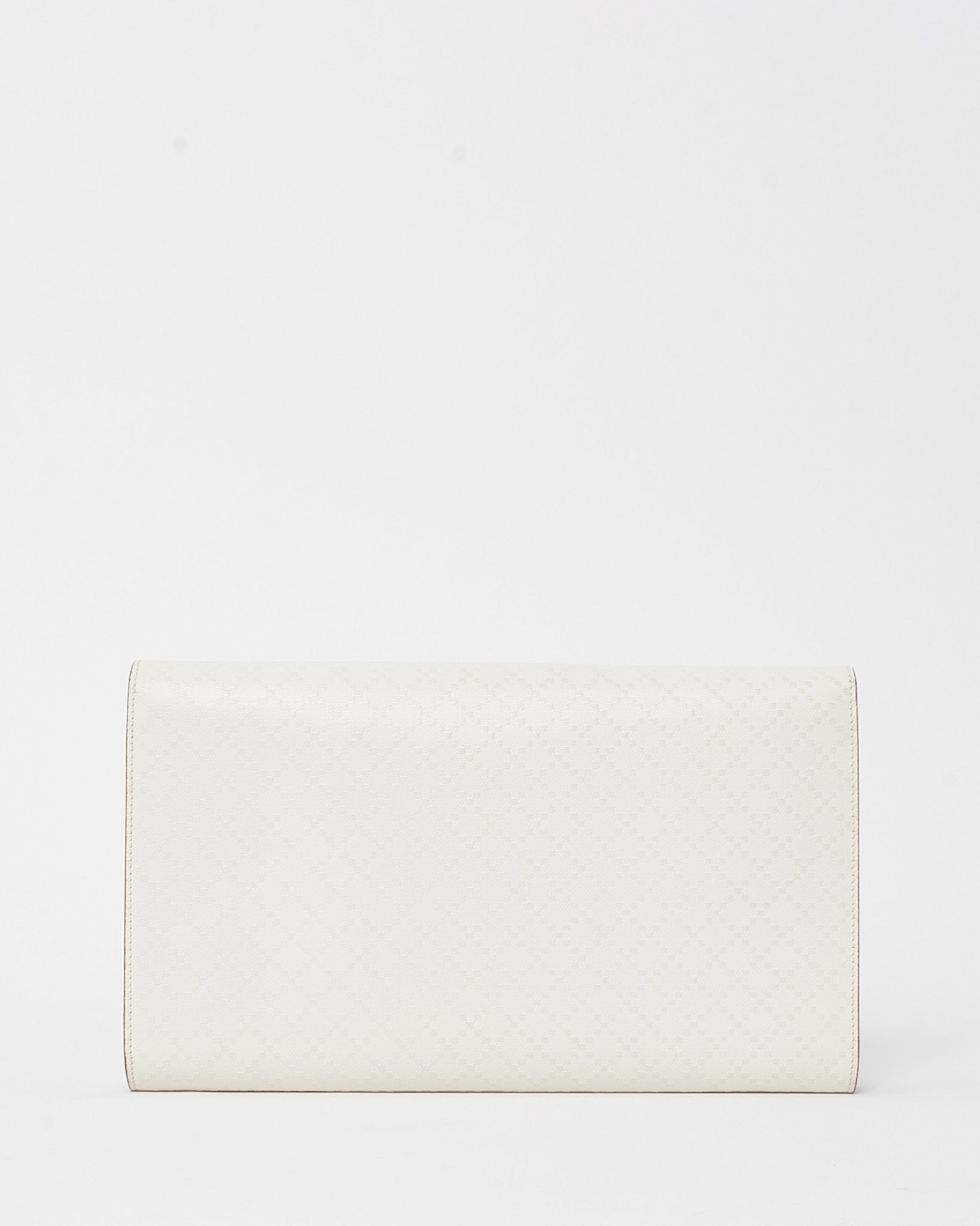 Refined and effortlessly chic, this pre-loved authentic Gucci Hilary clutch is crafted from white Lux Bright Diamante coated canvas with smooth leather trim. The structured silhouette features a fold-over flap with snap closure, subtle Gucci branding, and a sleek interior perfect for daily essentials. Lightweight yet sophisticated, this versatile clutch transitions seamlessly from day to evening, making it an ideal accessory for polished, modern styling.