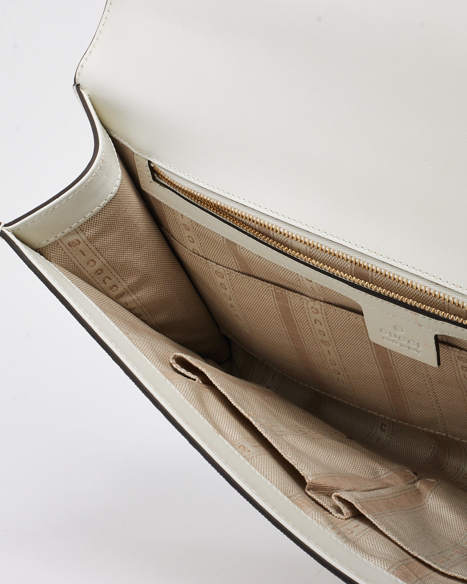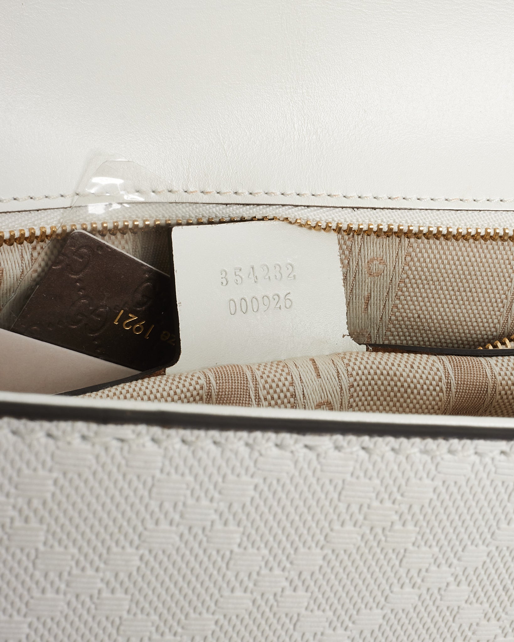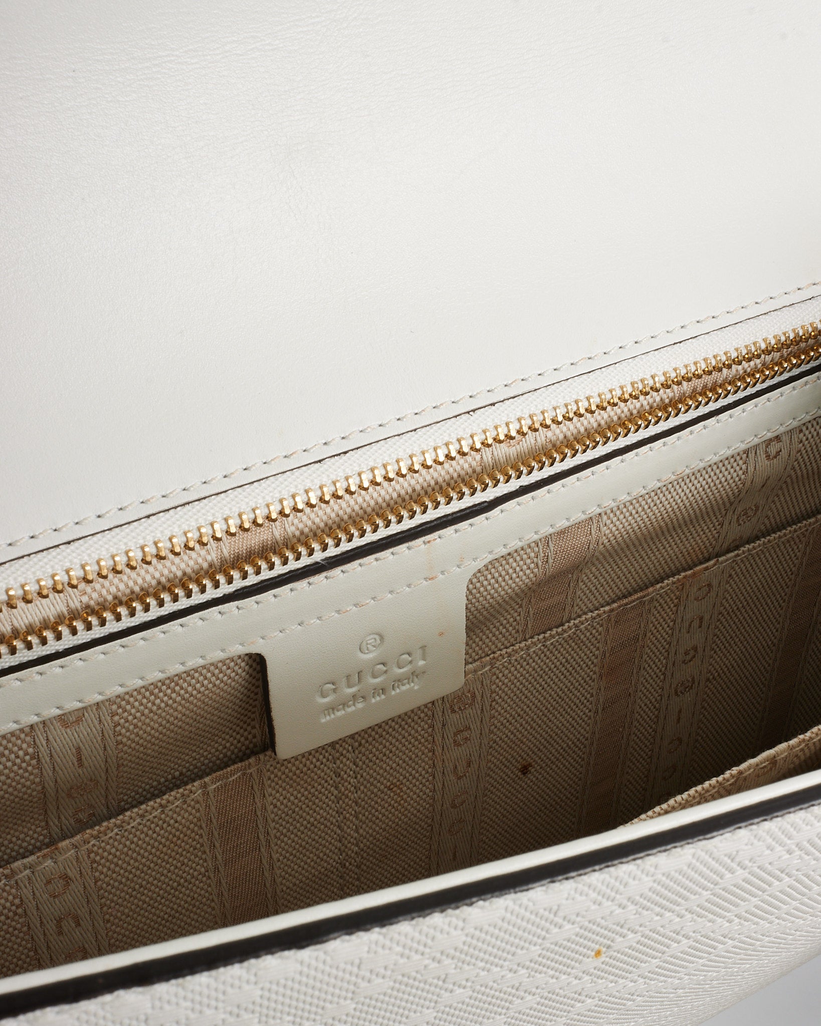 Refined and effortlessly chic, this pre-loved authentic Gucci Hilary clutch is crafted from white Lux Bright Diamante coated canvas with smooth leather trim. The structured silhouette features a fold-over flap with snap closure, subtle Gucci branding, and a sleek interior perfect for daily essentials. Lightweight yet sophisticated, this versatile clutch transitions seamlessly from day to evening, making it an ideal accessory for polished, modern styling.