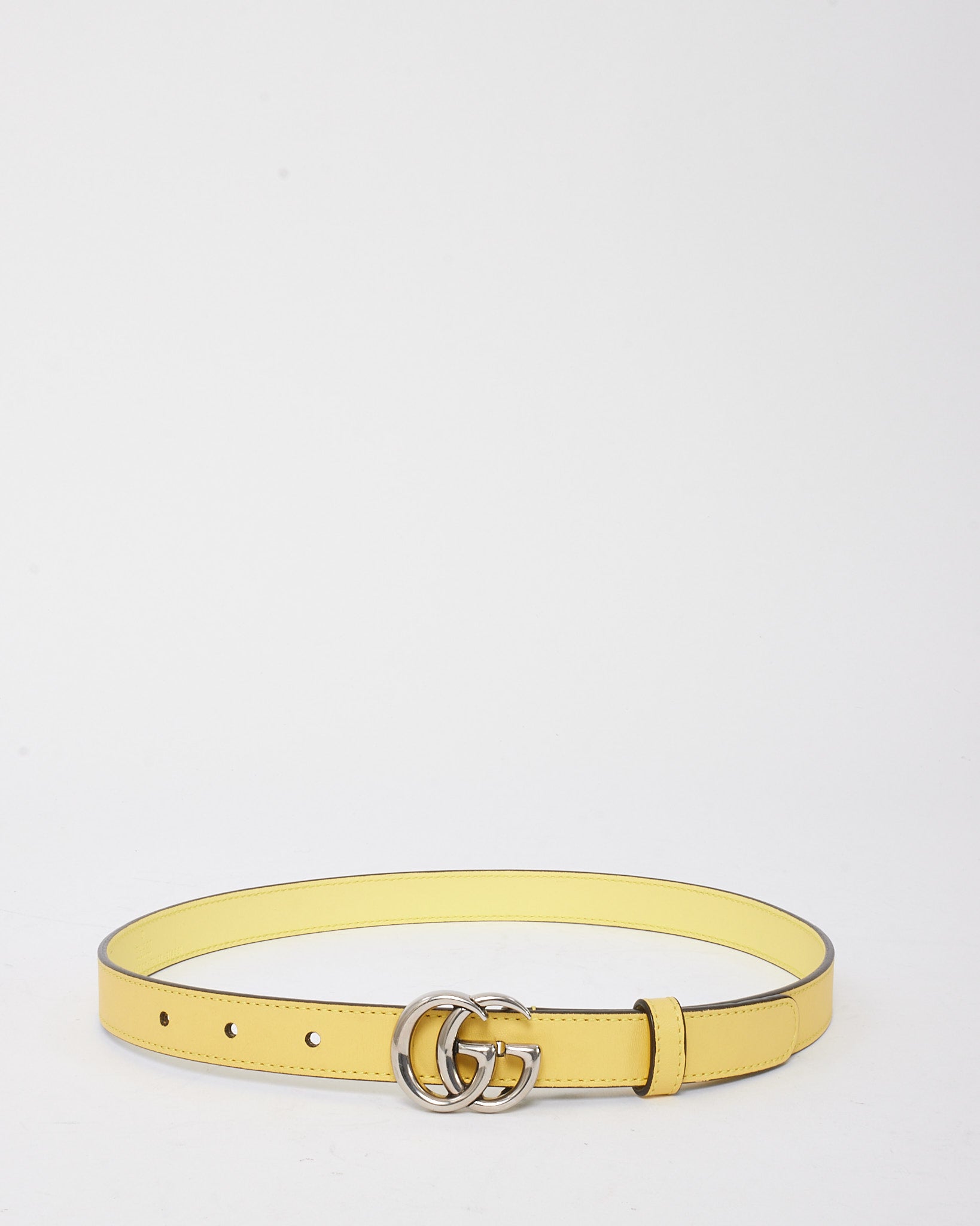 Brighten your accessories collection with this pre-loved authentic Gucci GG Marmont belt, crafted from smooth yellow leather. The slim profile adds a subtle yet statement pop of color, while the silver-tone interlocking GG buckle provides a refined logo finish. Designed for versatile wear, it can cinch the waist of dresses or elevate high-rise denim with a polished touch. This belt blends playful sophistication with Gucci’s signature elegance.
