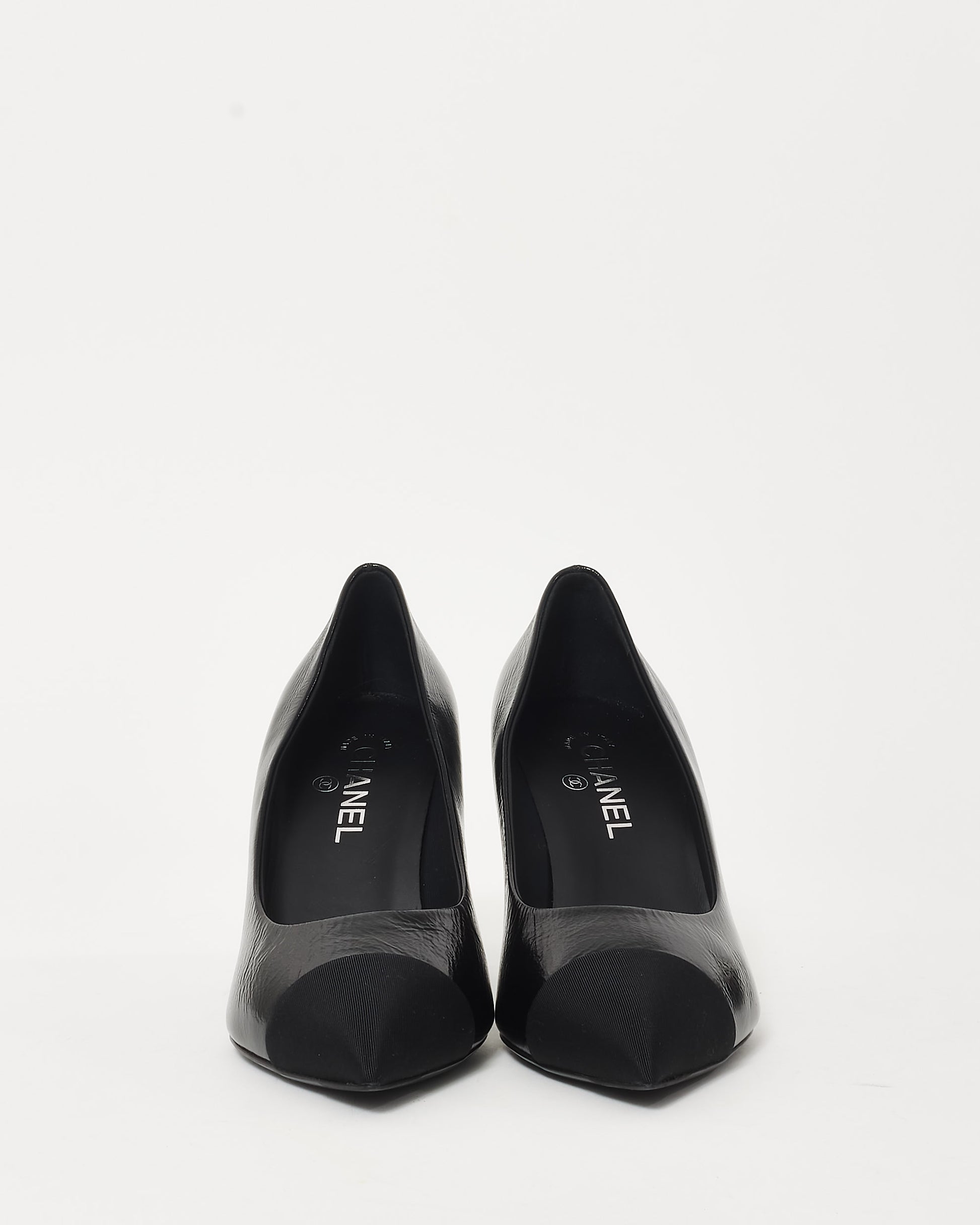 Black Shiny Goatskin Grosgrain Cap Toe Pearl Pumps - 41C