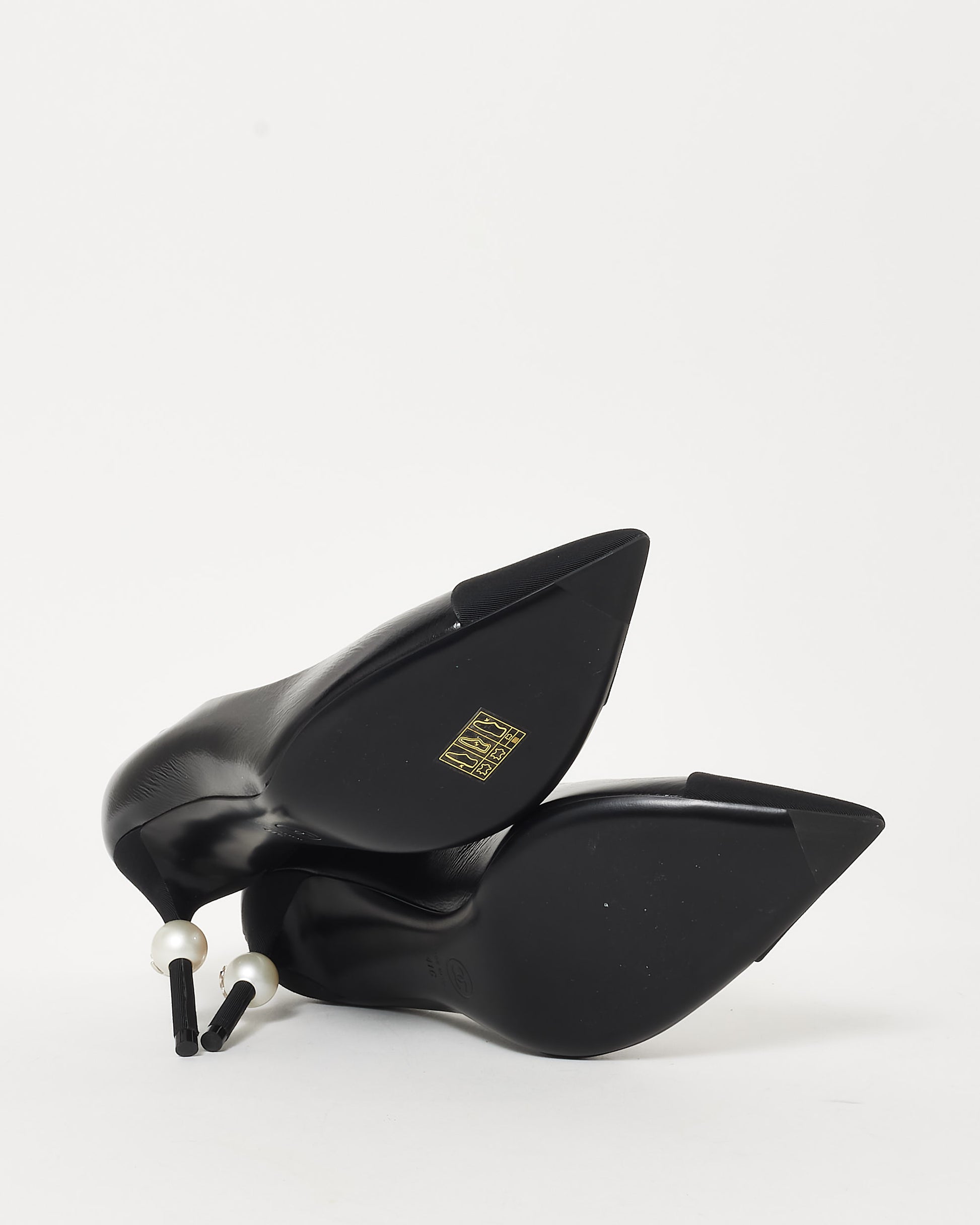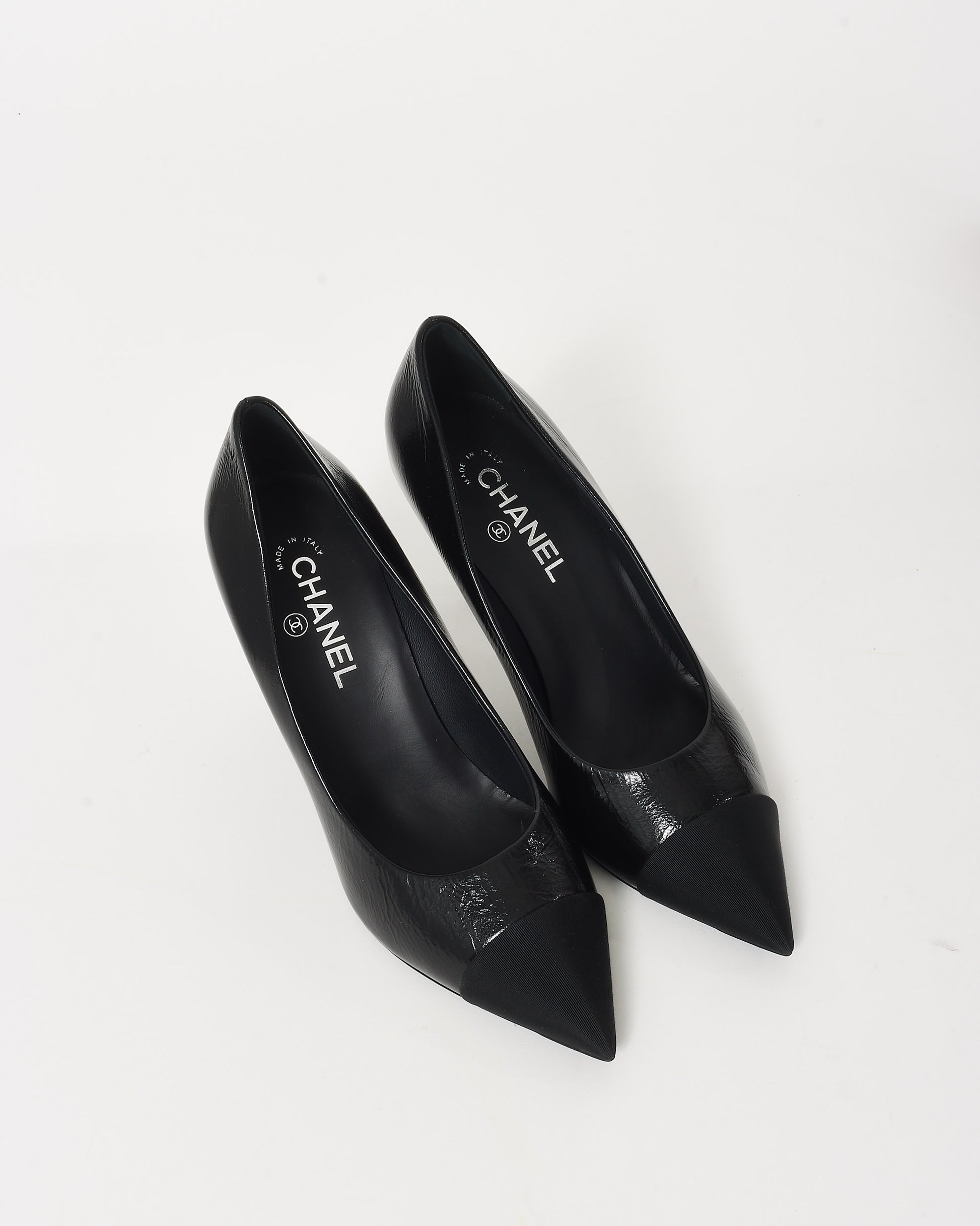 These authentic pre-owned Chanel Black Shiny Goatskin Grosgrain Cap Toe Pearl Pumps are a sophisticated blend of classic elegance and luxurious detail, perfect for those who appreciate timeless style. Crafted from high-shine black goatskin, these pumps feature a contrasting grosgrain cap toe and are accented with delicate pearls along the heel—a signature Chanel touch that exudes grace and femininity. Shiny black goatskin leather with grosgrain cap toe, elegant pearls along the heel for a luxurious embellishment and classic pump silhouette with a rounded toe and mid-height heel. Shop authentic pre-owned Chanel pumps at Retyche.
