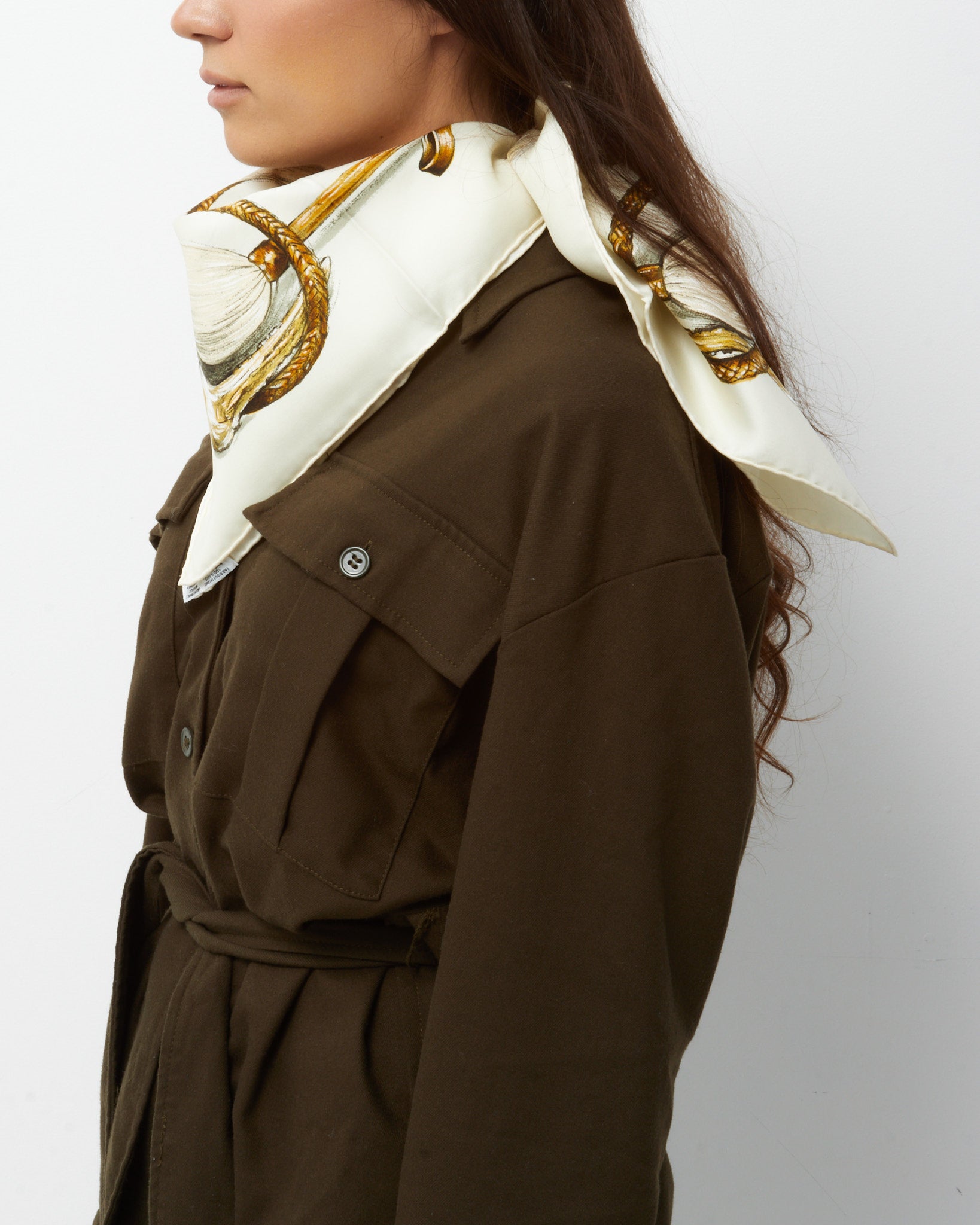 Elevate your accessory collection with this pre-loved authentic Hermès Beige/Cream/Gold/Brown Multi “A Propos de Bottes” 90cm Silk Scarf, crafted in luxurious silk with a smooth, fluid drape. Showcasing the intricate A Propos de Bottes equestrian motif in an elegant neutral palette of beige, cream, gold, and brown, this iconic 90cm Hermès carré highlights the house’s heritage craftsmanship and refined artistry. The hand-rolled edges and classic square silhouette allow for versatile styling—tied at the neck, worn over the shoulders, or accented on your favorite handbag. A timeless Hermès silk scarf that blends understated sophistication with collectible appeal.