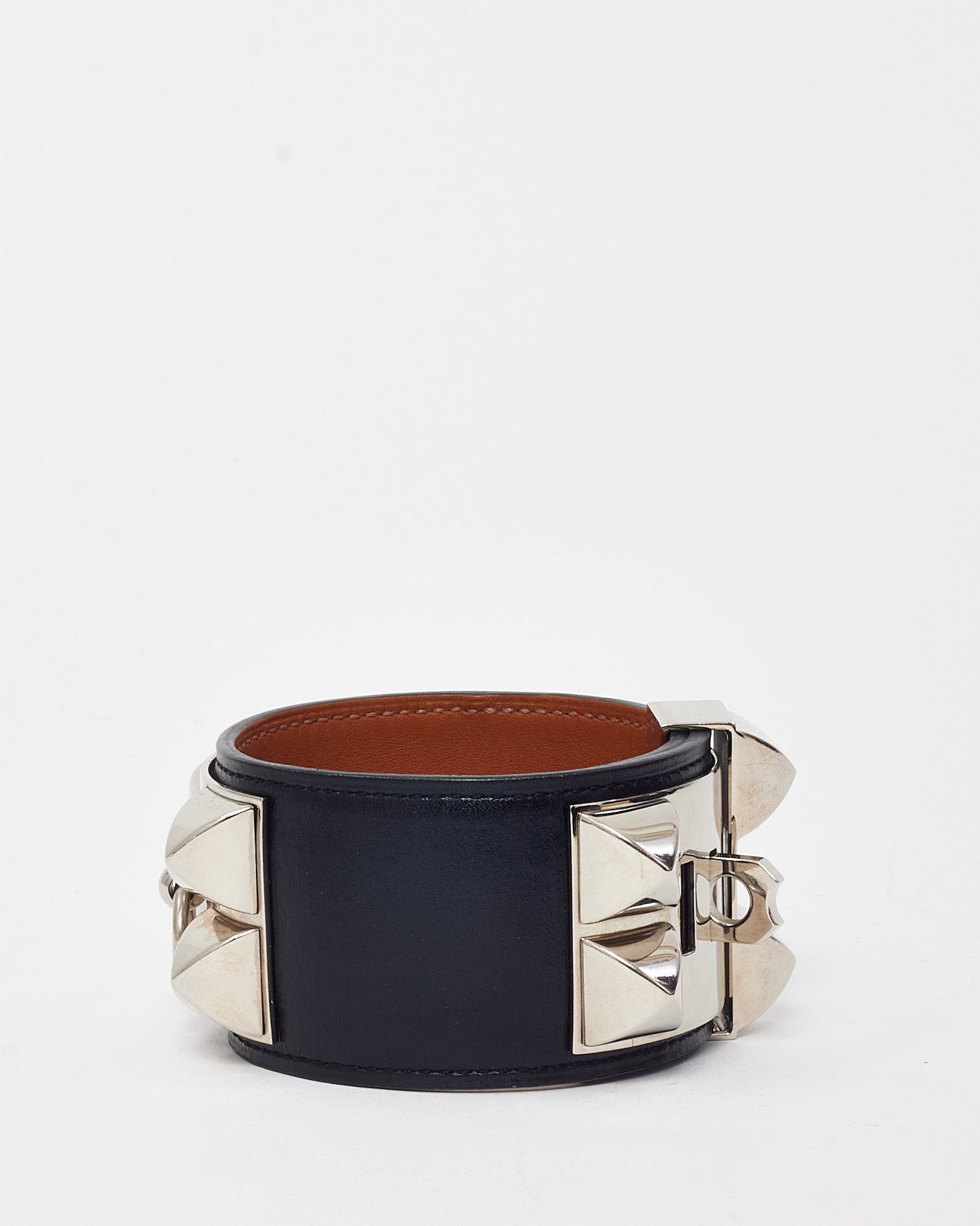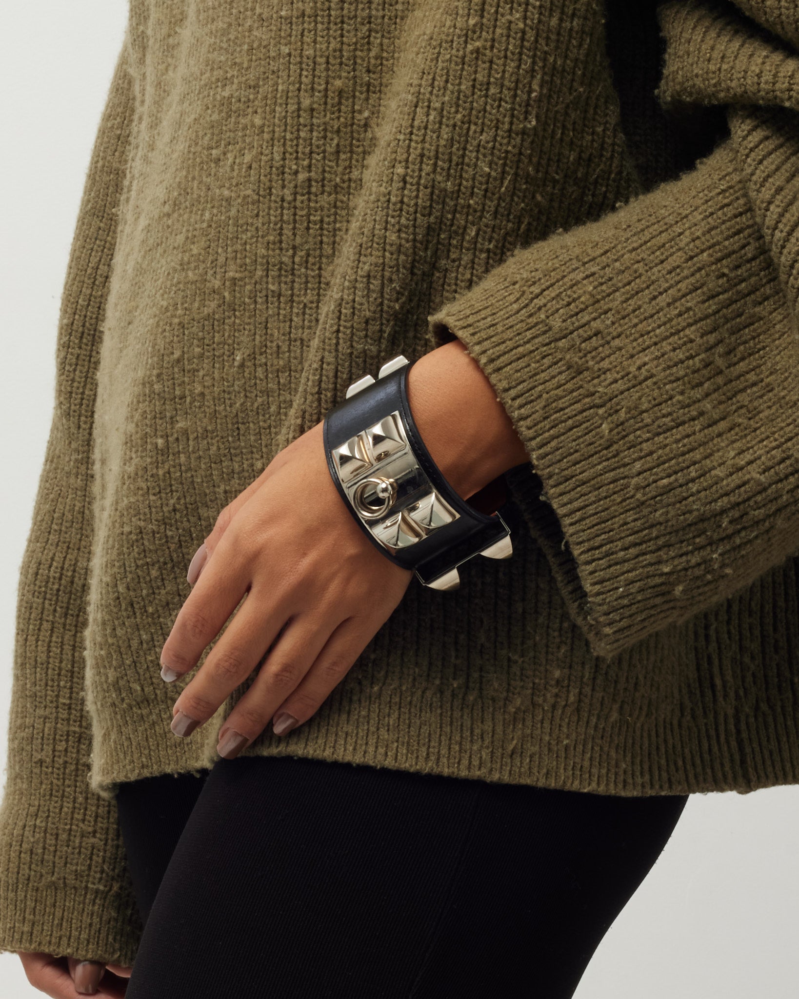 Add a bold, equestrian-inspired edge to your accessories lineup with this pre-loved authentic Hermès Black Leather SHW CDC Collier de Chien Bracelet in size L. Crafted from luxurious black leather, this iconic cuff features signature palladium-plated pyramid studs and a centered ring detail—hallmarks of the Collier de Chien design. Adjustable and structured, it wraps the wrist with statement-making style and unmistakable Hermès sophistication. A cult-favorite piece, it effortlessly elevates both casual and elevated looks with modern Parisian flair.