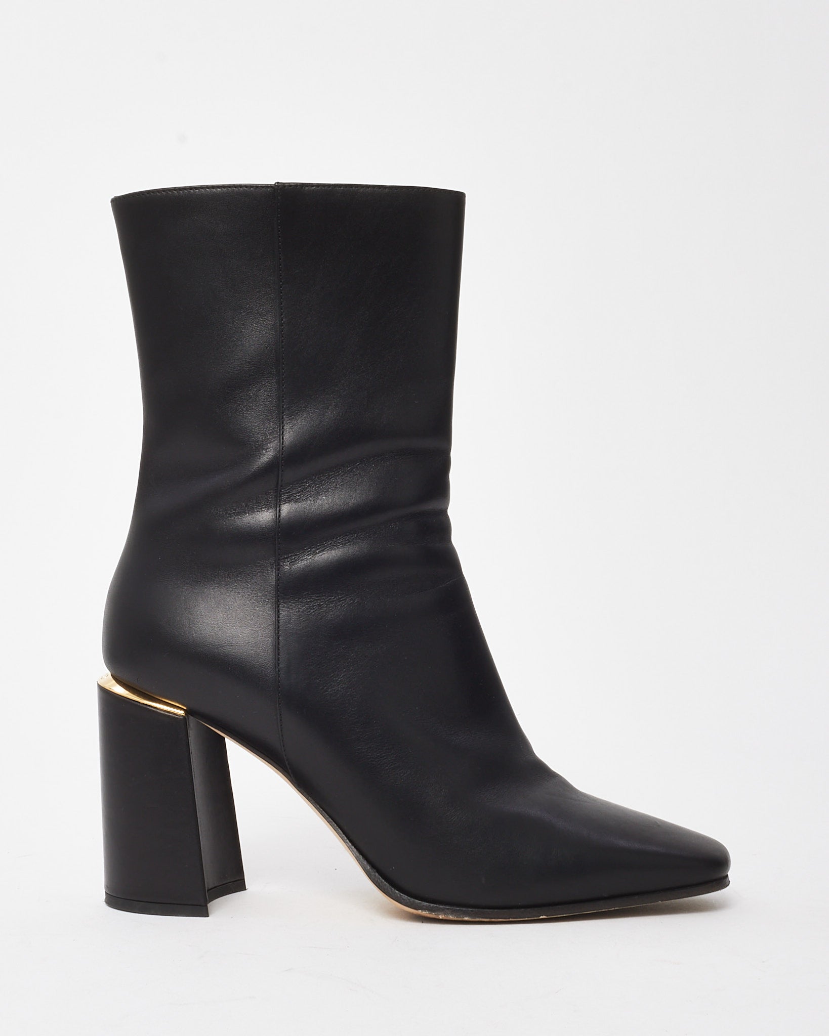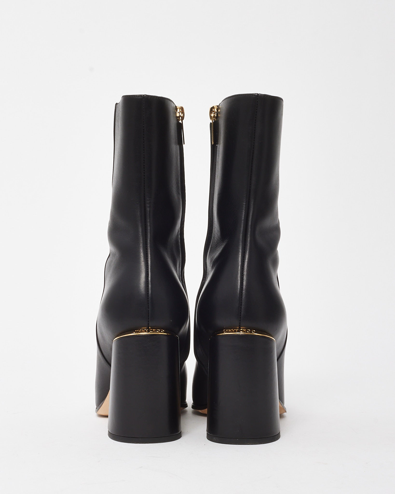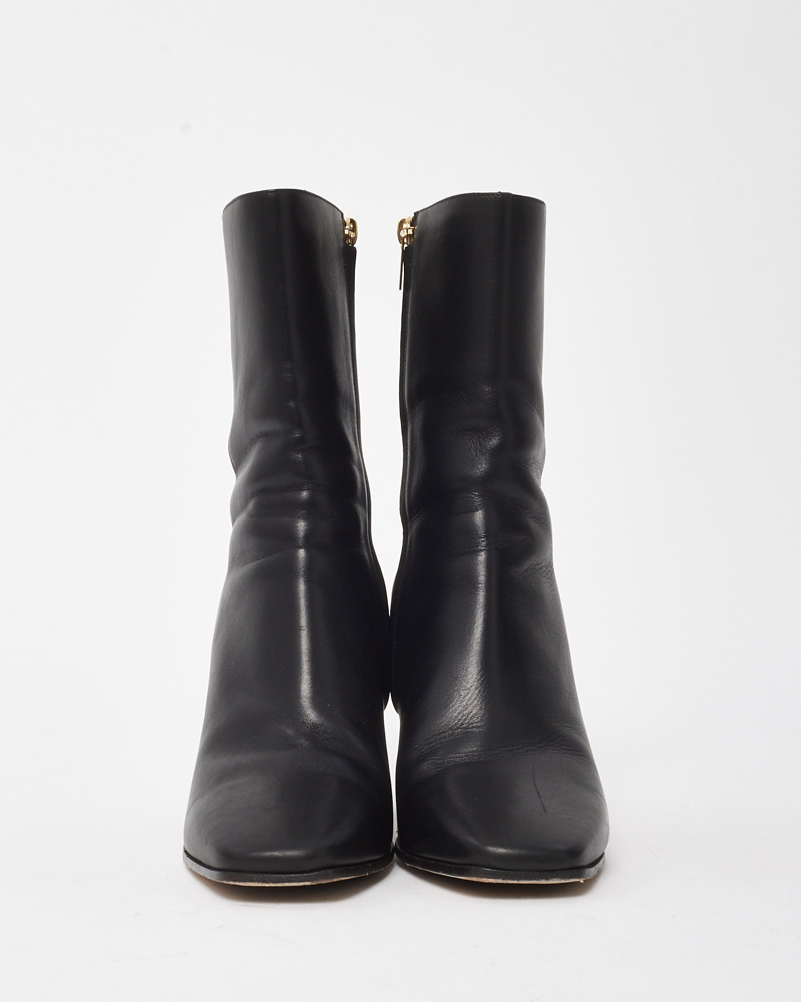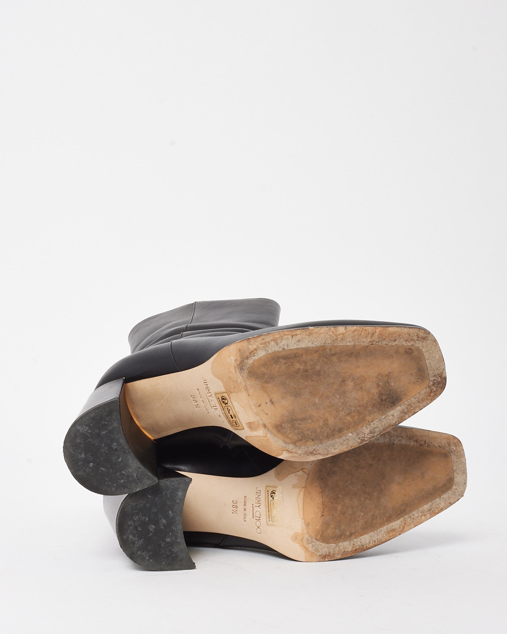 Step into sleek sophistication with these pre-loved authentic Jimmy Choo Loren 85 ankle boots. Crafted in smooth black leather, this streamlined silhouette is defined by its pointed toe and sculpted 85mm heel, offering a perfect balance of elegance and edge. A side zip closure ensures ease of wear, while the minimal design makes these boots endlessly versatile. Ideal for both polished daytime looks and evening refinement, they’re a wardrobe staple with timeless appeal.