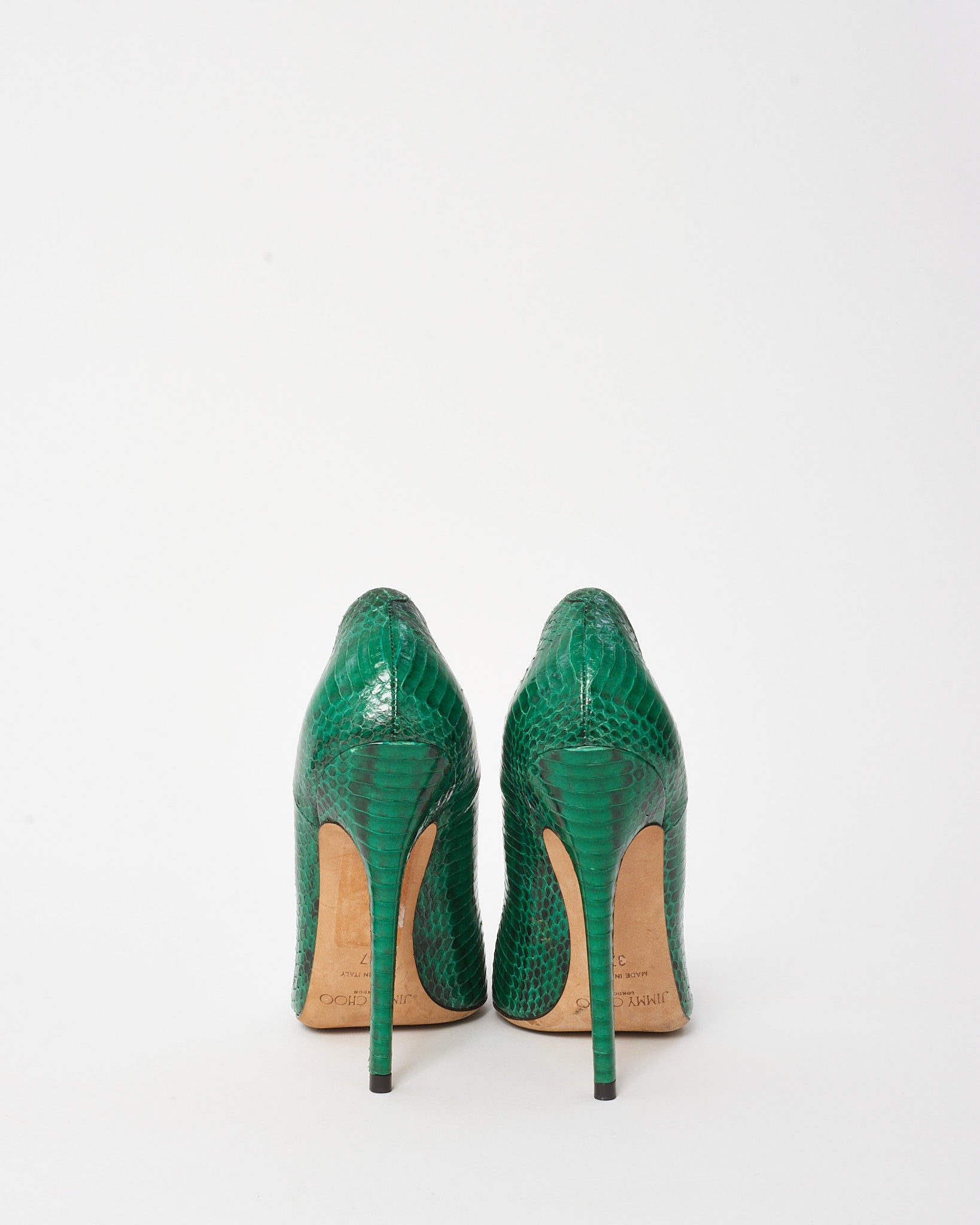 Striking and sophisticated, these pre-owned authentic Jimmy Choo Anouk Pumps are crafted from green python-effect leather in a sleek pointed toe silhouette. Set on a soaring stiletto heel, the design exudes bold elegance with its exotic texture and razor-sharp lines.