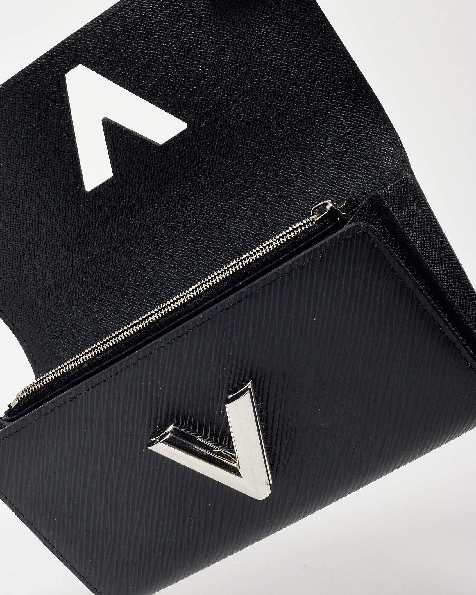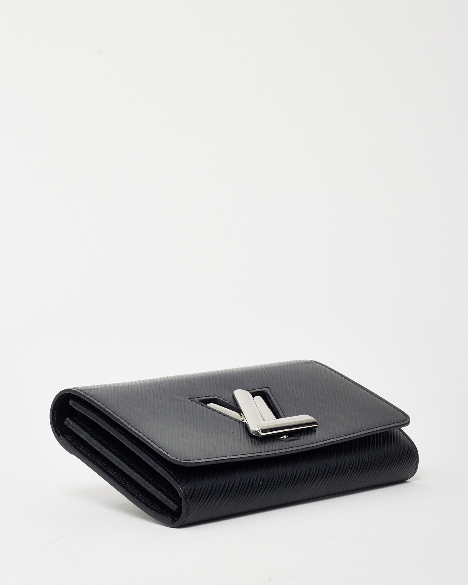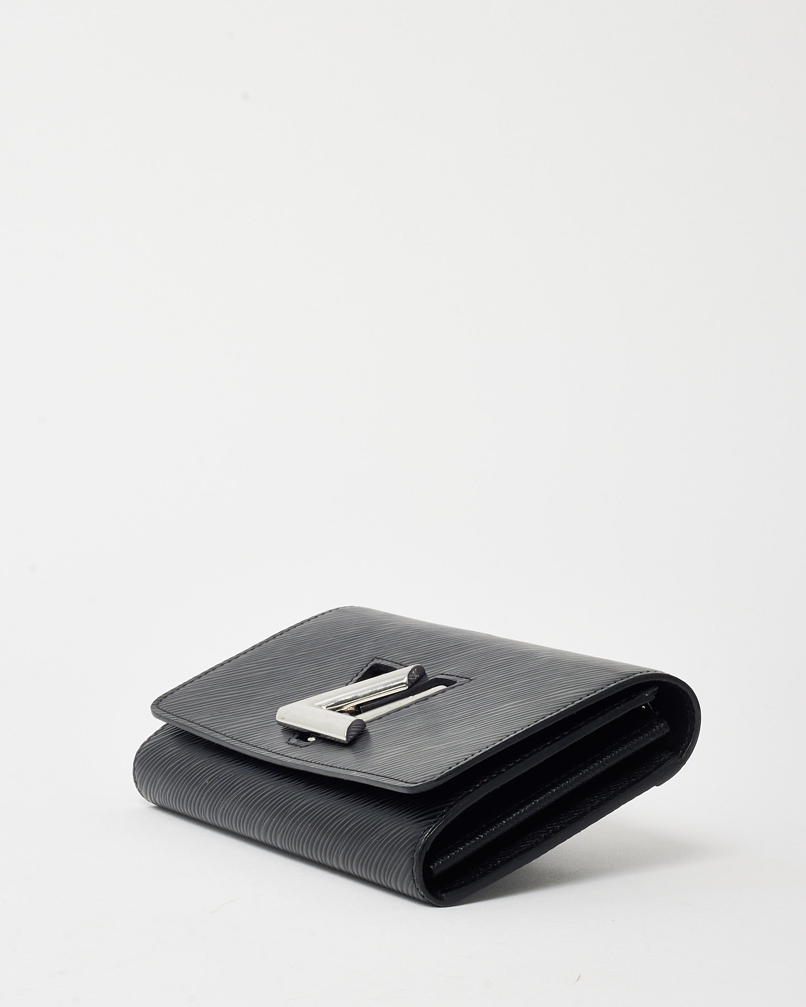Add sleek structure to your accessory lineup with this pre-loved authentic Louis Vuitton Black Epi Leather LV Twist Wallet with silver-tone hardware. Crafted from textured Epi leather in a timeless black hue, this wallet features the iconic LV twist-lock closure for a modern, elegant finish. Inside, multiple card slots, compartments, and a zip coin pocket provide organized storage for your essentials. Compact yet refined, it’s a functional statement piece that pairs effortlessly with both day and evening looks.