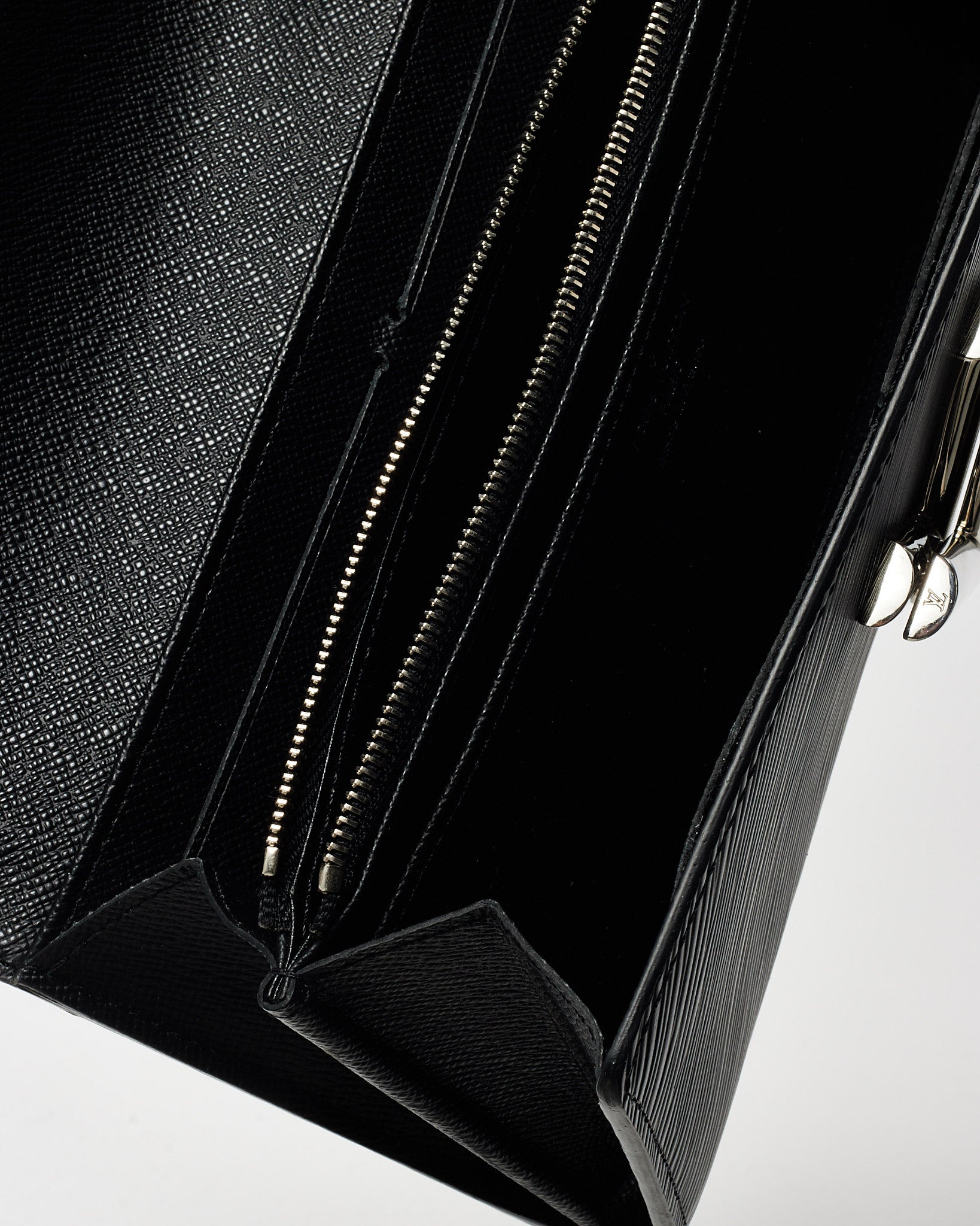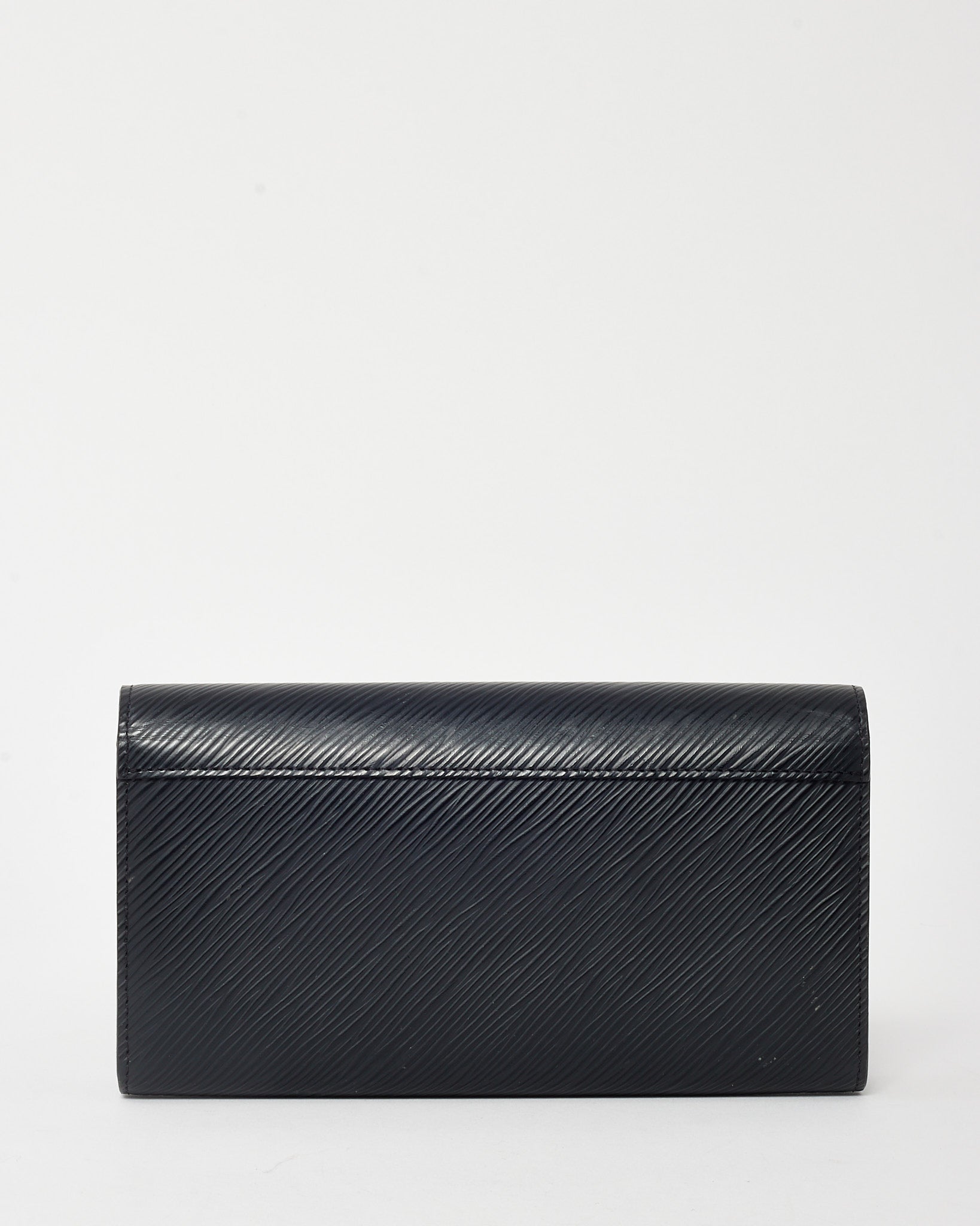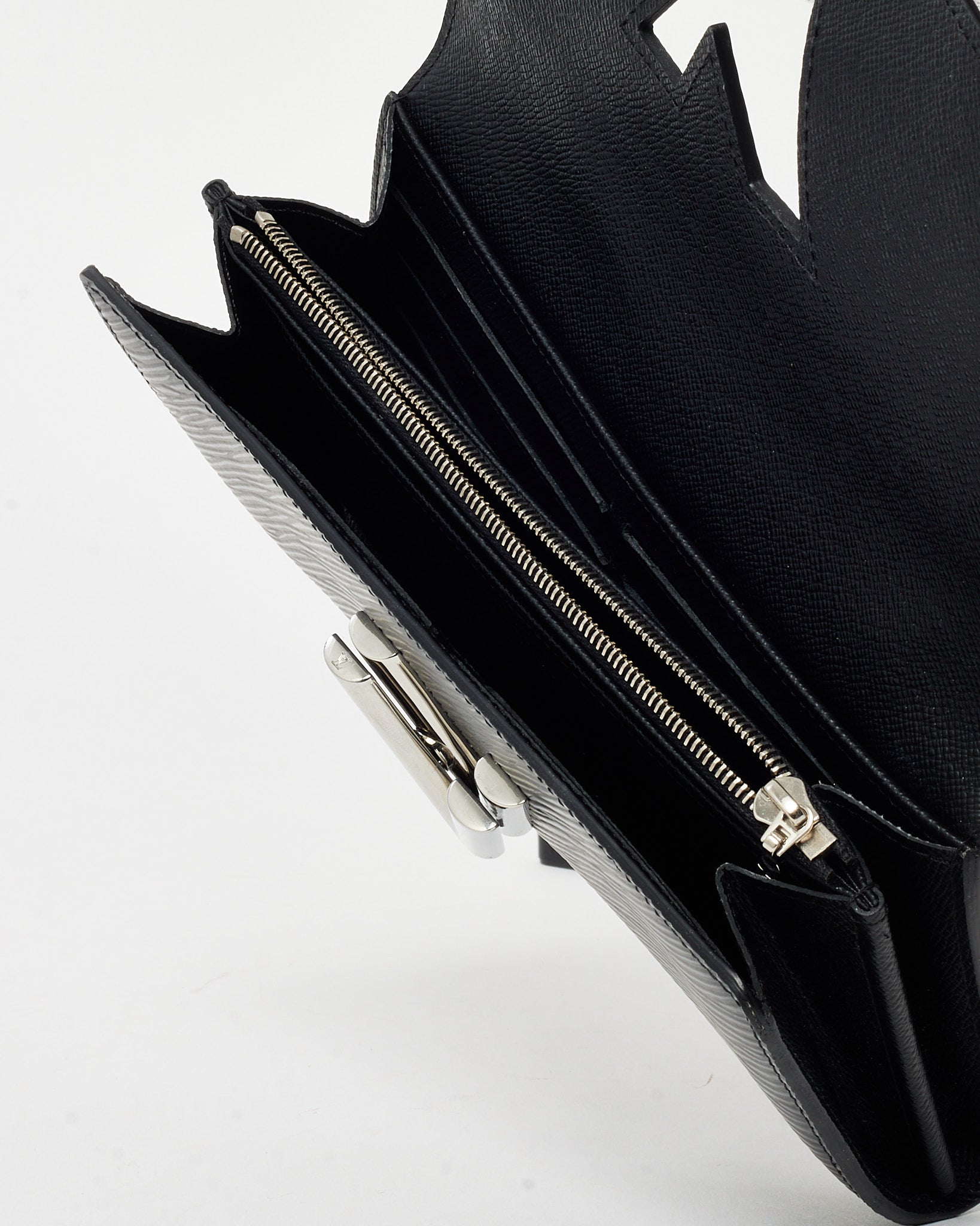 Add sleek structure to your accessory lineup with this pre-loved authentic Louis Vuitton Black Epi Leather LV Twist Wallet with silver-tone hardware. Crafted from textured Epi leather in a timeless black hue, this wallet features the iconic LV twist-lock closure for a modern, elegant finish. Inside, multiple card slots, compartments, and a zip coin pocket provide organized storage for your essentials. Compact yet refined, it’s a functional statement piece that pairs effortlessly with both day and evening looks.