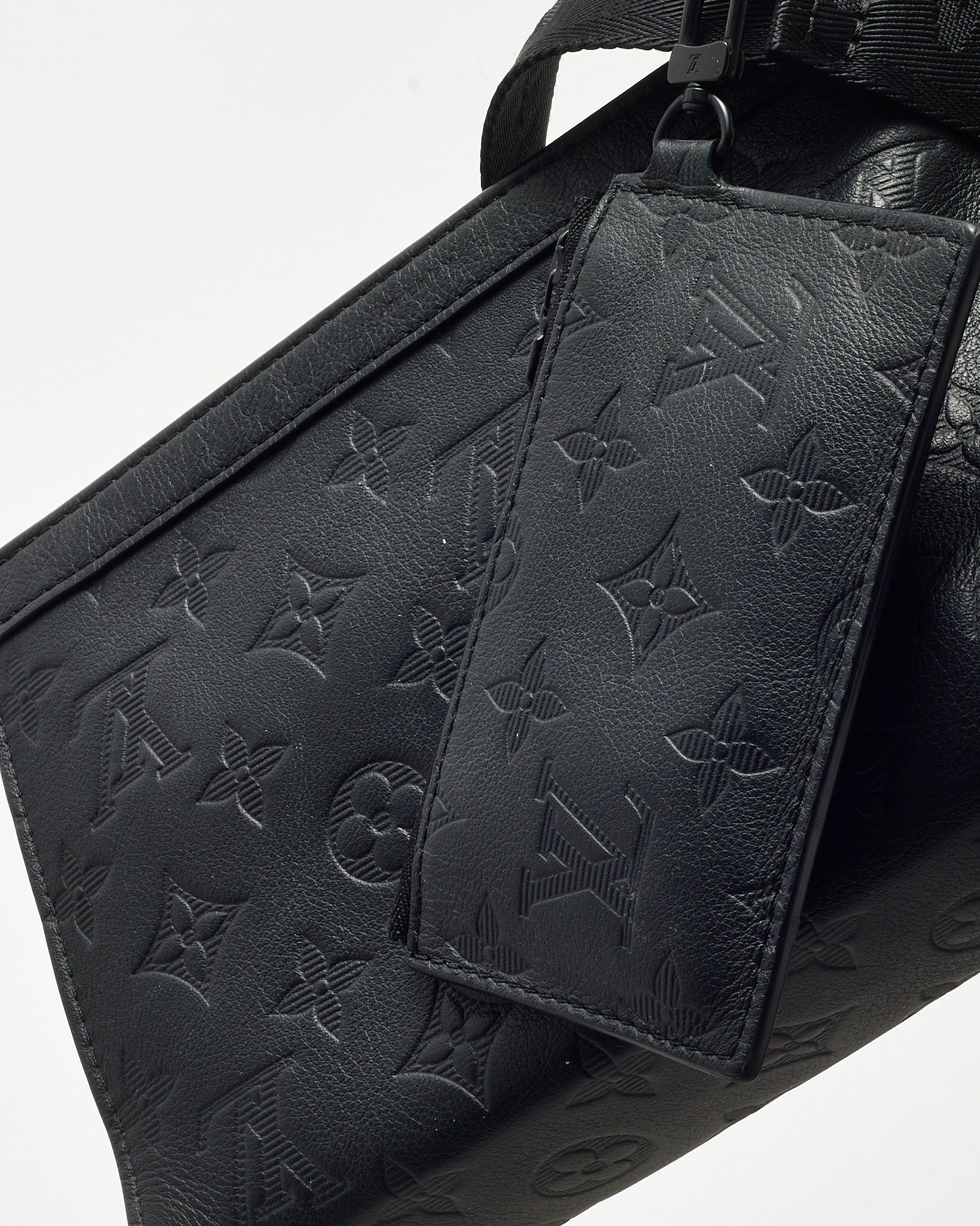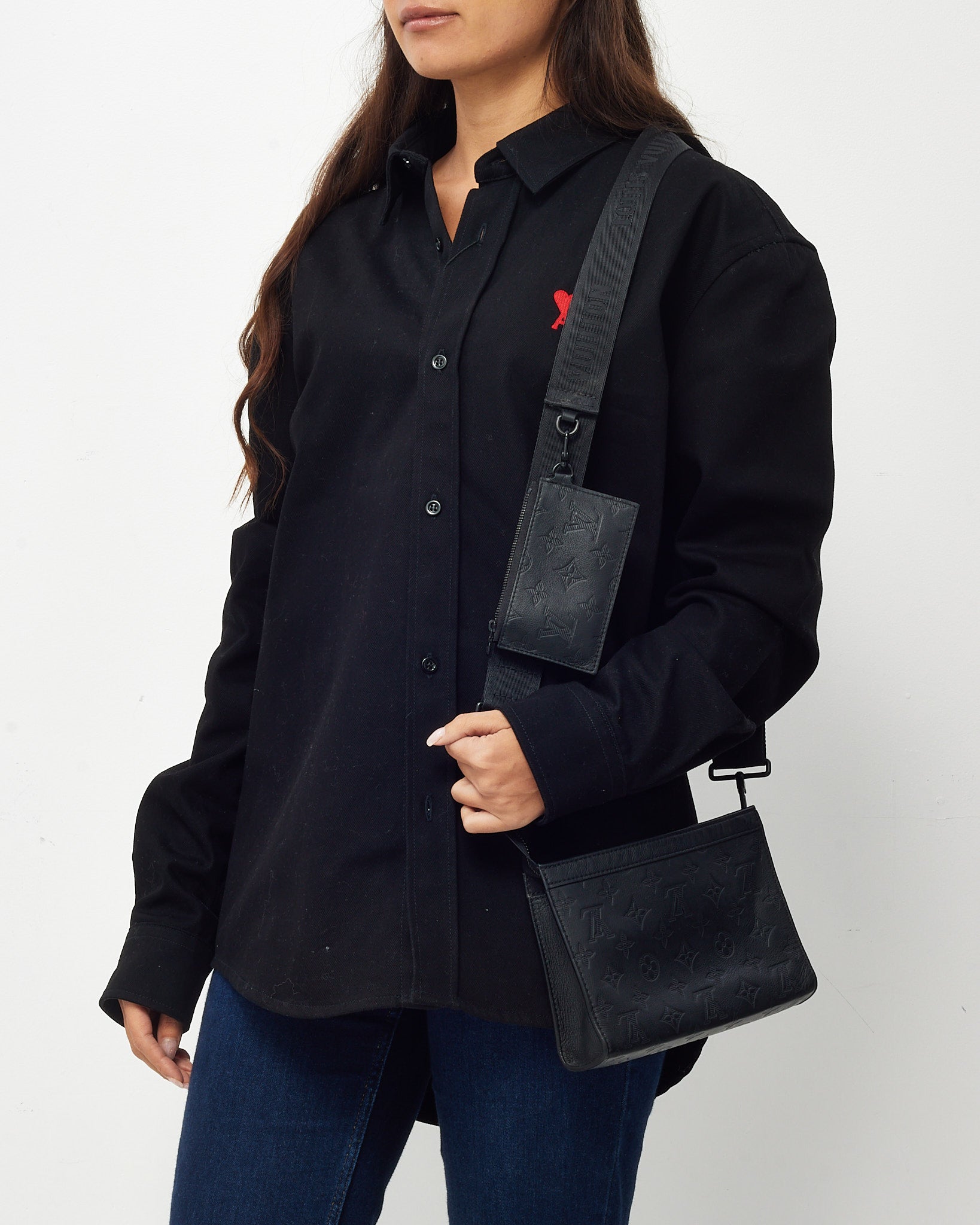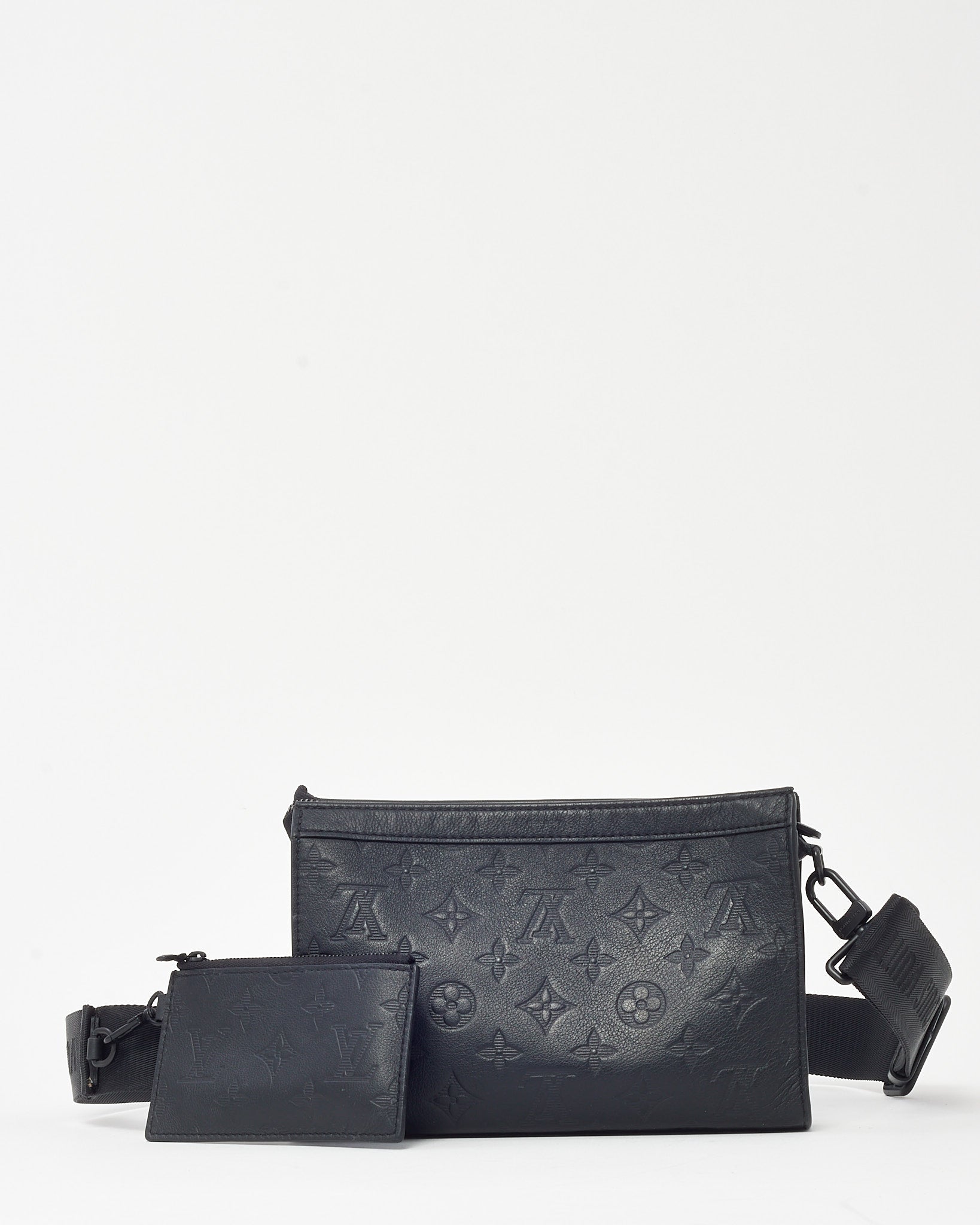 Step up your accessories game with this pre-loved authentic Louis Vuitton Gaston Wearable Wallet Crossbody Bag in black Monogram Shadow leather. Crafted from supple calfskin subtly embossed with the iconic Monogram pattern, this compact yet functional piece is designed for hands-free convenience. It features a sleek rectangular silhouette, an adjustable strap for versatile wear, and a front zip pocket for easy access to essentials. Ideal for on-the-go city living or travel, this modern crossbody merges refined luxury with everyday practicality.