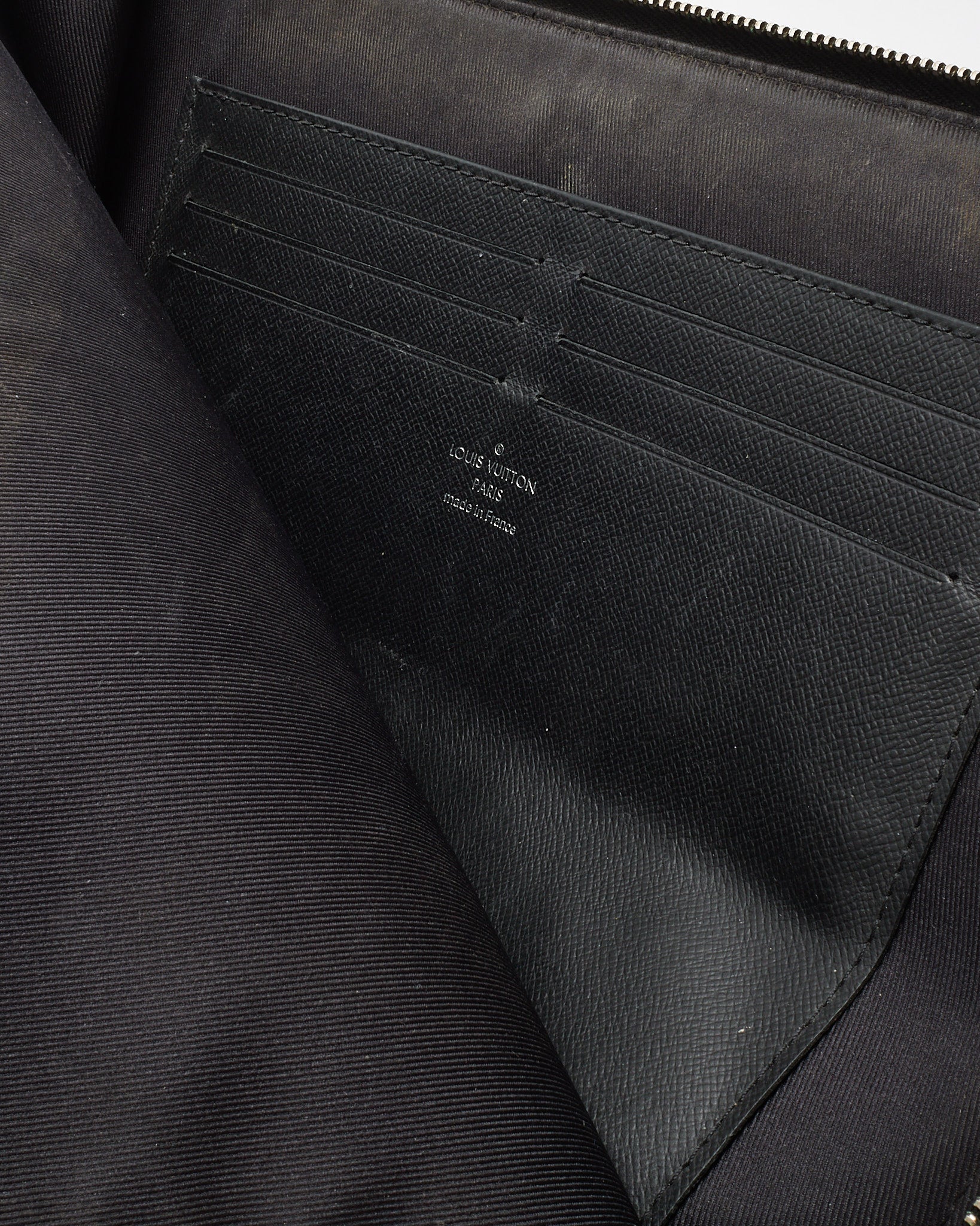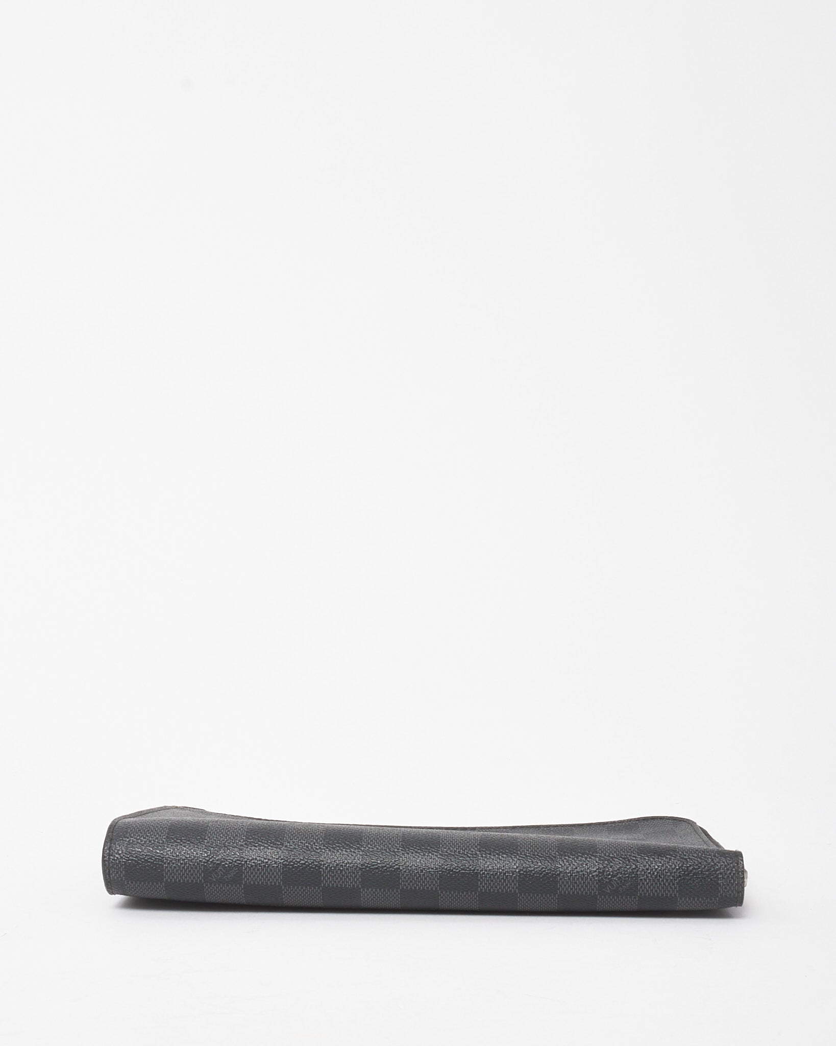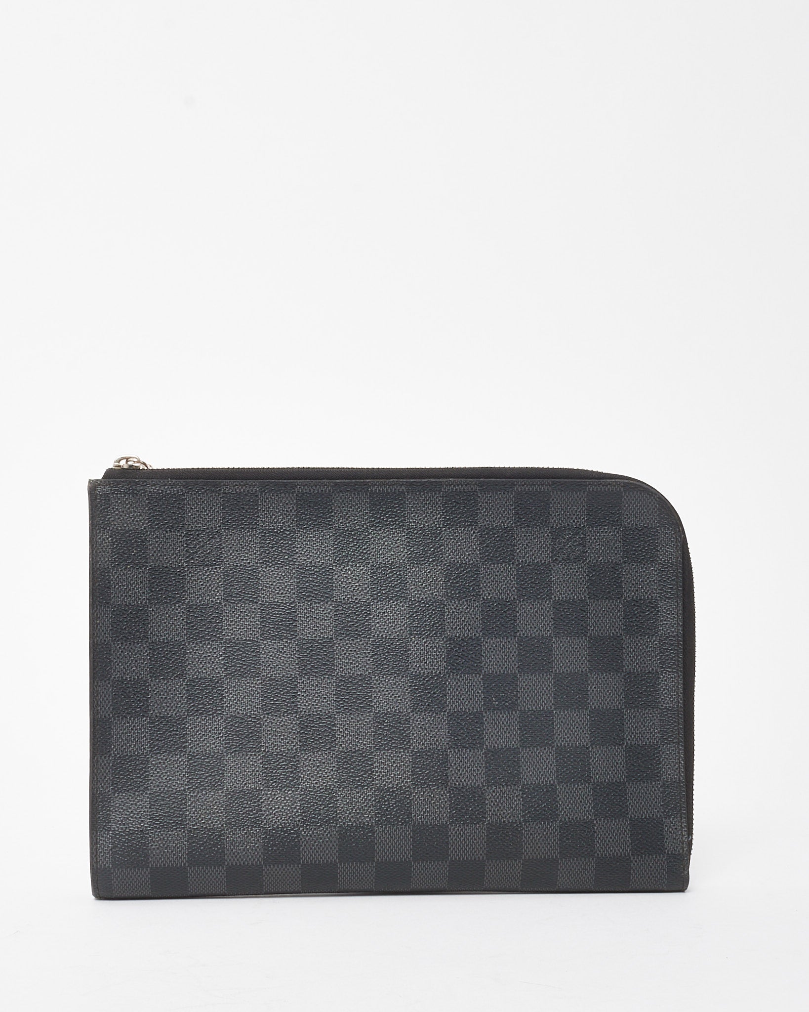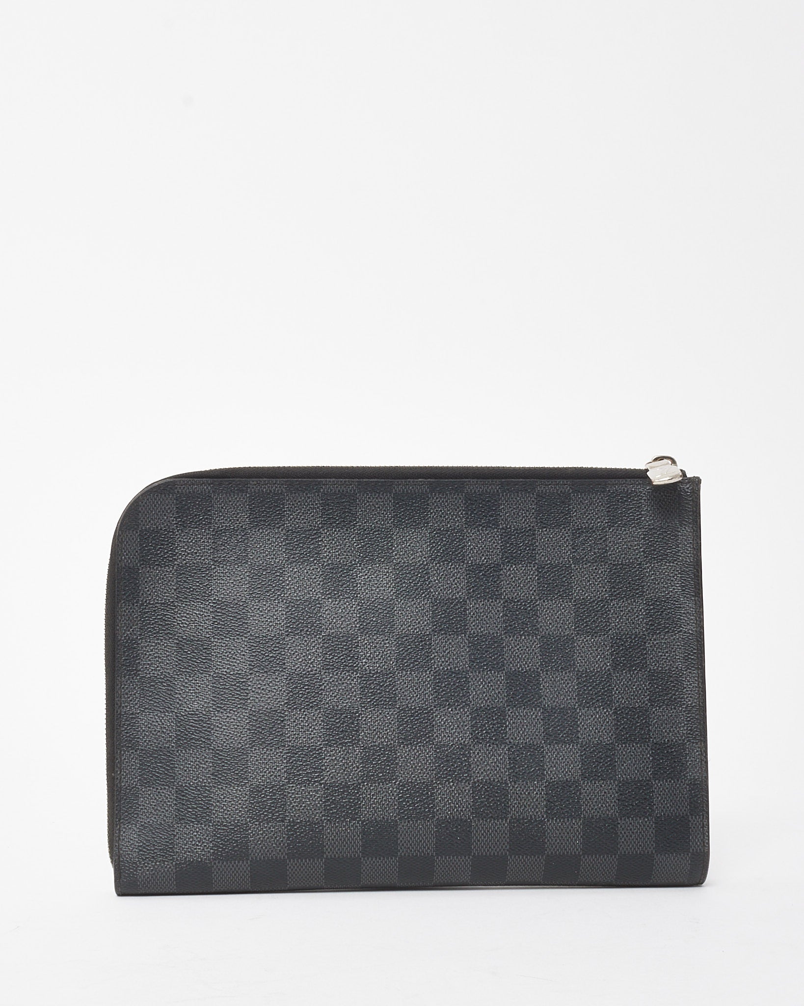 Add timeless utility to your accessory lineup with this pre-loved authentic Louis Vuitton Damier Graphite Coated Canvas Pochette Jour PM. Crafted in the house’s signature dark grey checkered canvas, this sleek portfolio offers understated sophistication with modern edge. The minimalist silhouette features a top zip closure and slim profile, perfect for carrying documents, a tablet, or daily essentials. Finished with subtle LV logo embossing and silver-tone hardware, this compact pouch is a versatile piece that transitions effortlessly from business to casual use.