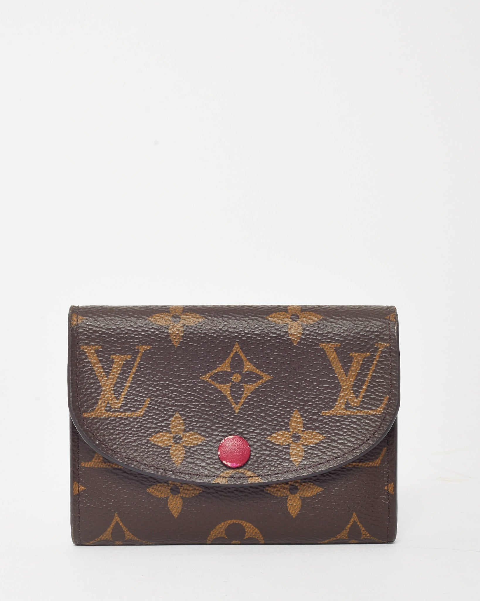 Petite and polished, this pre-loved authentic Louis Vuitton Fuchsia and Monogram Canvas Rosalie Coin Purse Wallet adds a vibrant touch to your small leather goods collection. Crafted from the house’s iconic monogram coated canvas with a bold fuchsia pink leather interior and trim, this compact wallet features a curved flap with snap closure, a zipped coin pocket, and multiple card slots. Perfect for slipping into mini bags or travel pouches, it blends everyday functionality with timeless LV charm.