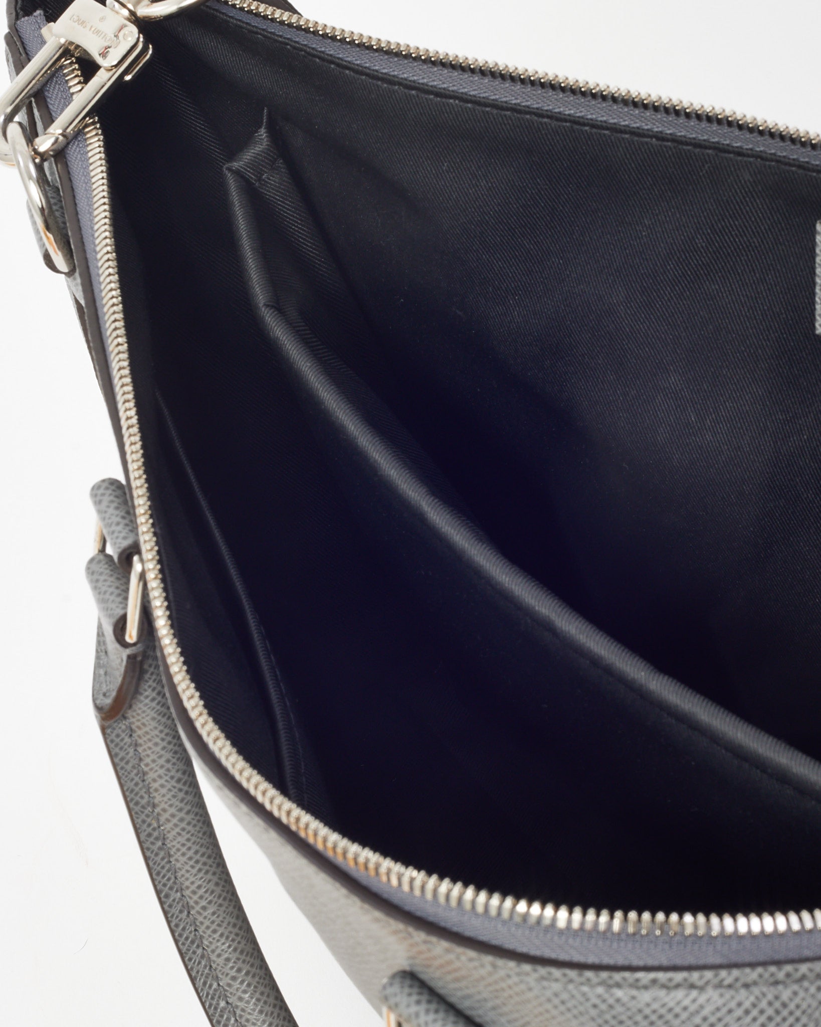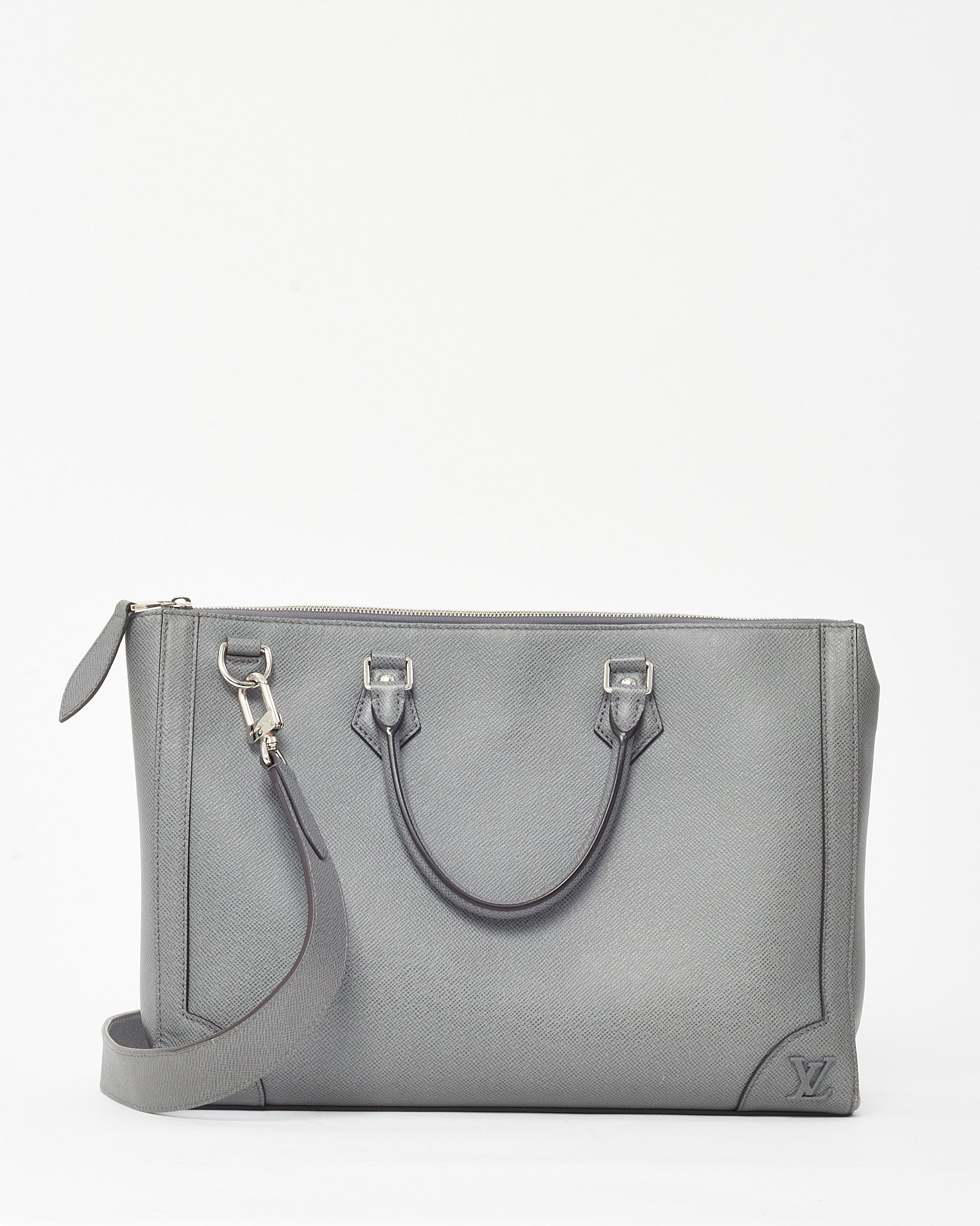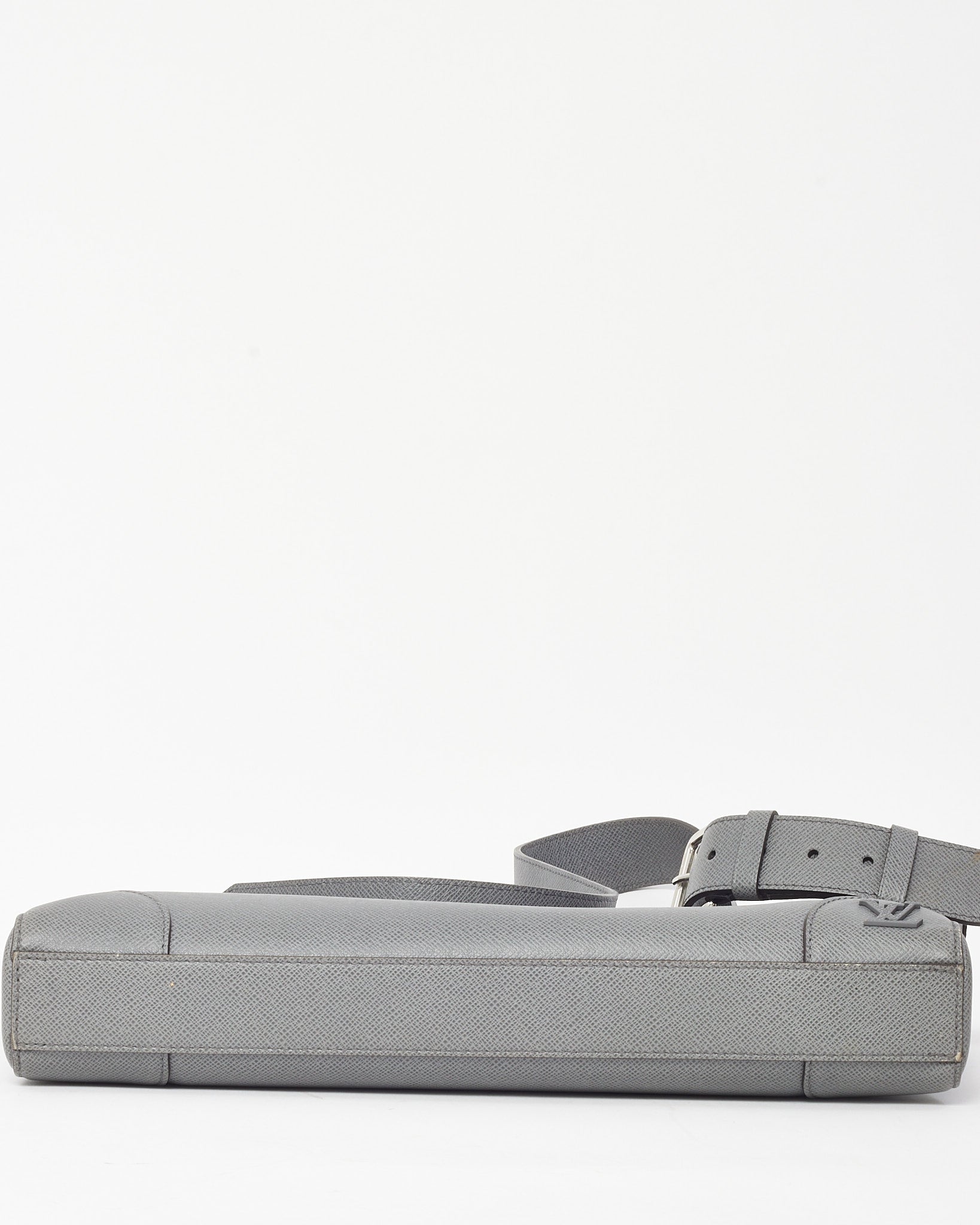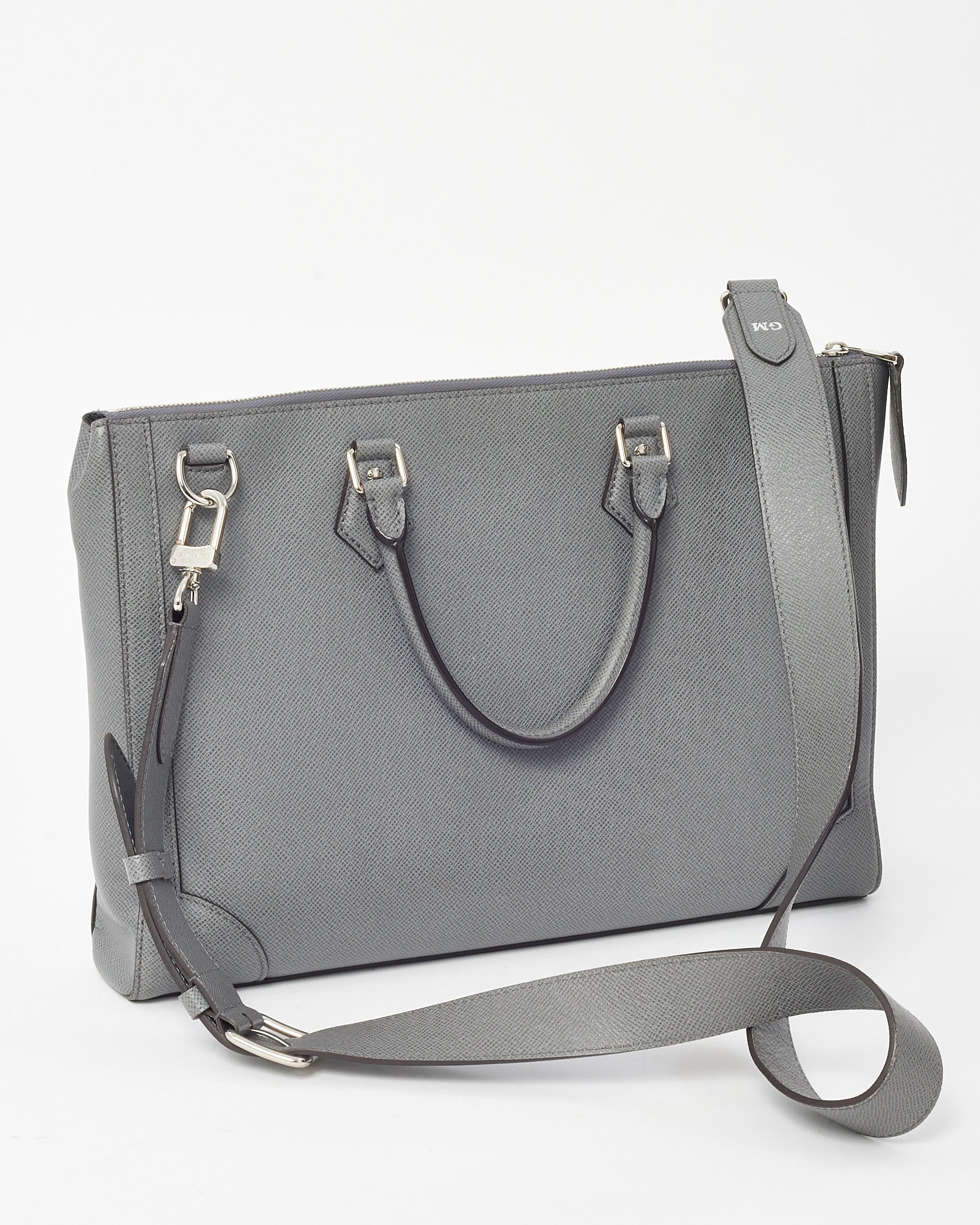 Refined and professional, this pre-loved authentic Louis Vuitton Grey Textured Taiga Leather Slim Briefcase Bag with Initial “GM” Strap blends understated luxury with everyday functionality. Crafted from structured Taiga leather in a versatile grey tone, this sleek briefcase features a slim silhouette, dual top handles, and silver-tone hardware for a polished finish. The detachable canvas shoulder strap—personalized with the initials “GM”—adds a practical, customized touch. With a zip-around closure and organized interior, it’s ideal for carrying documents, tech, and business essentials in timeless style.