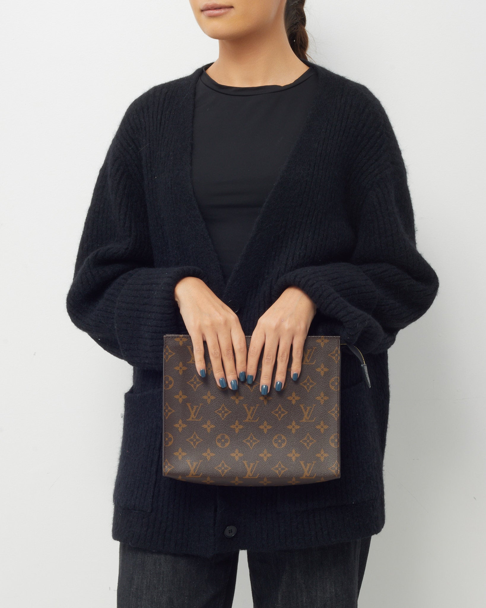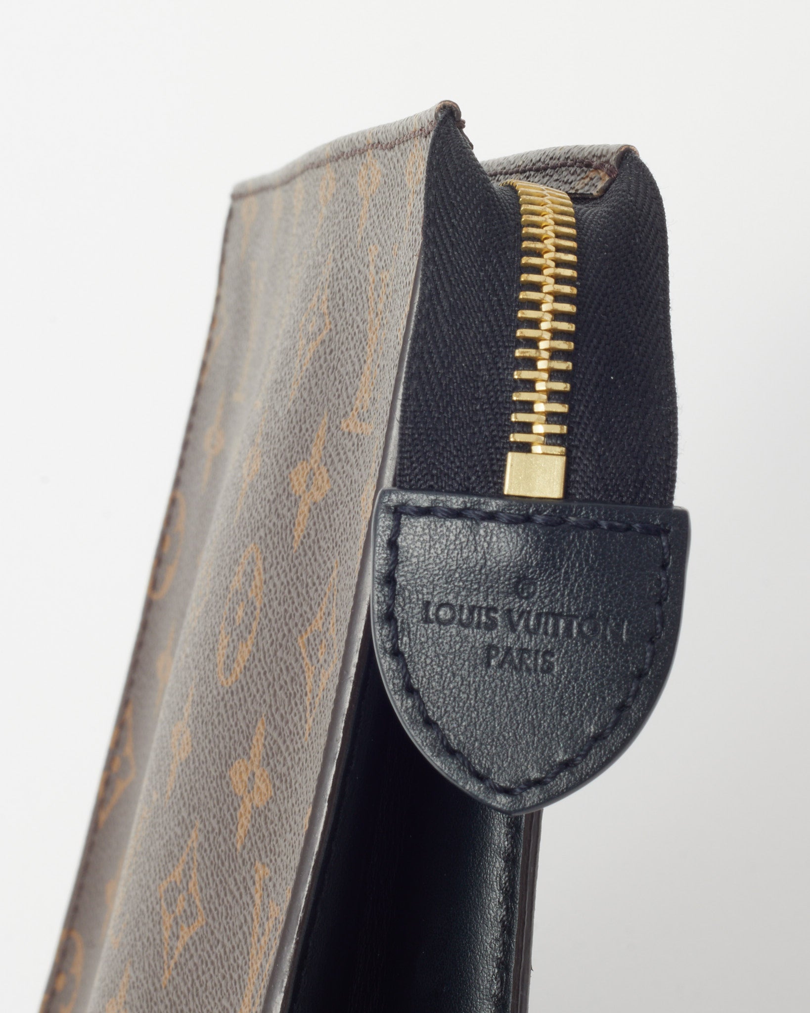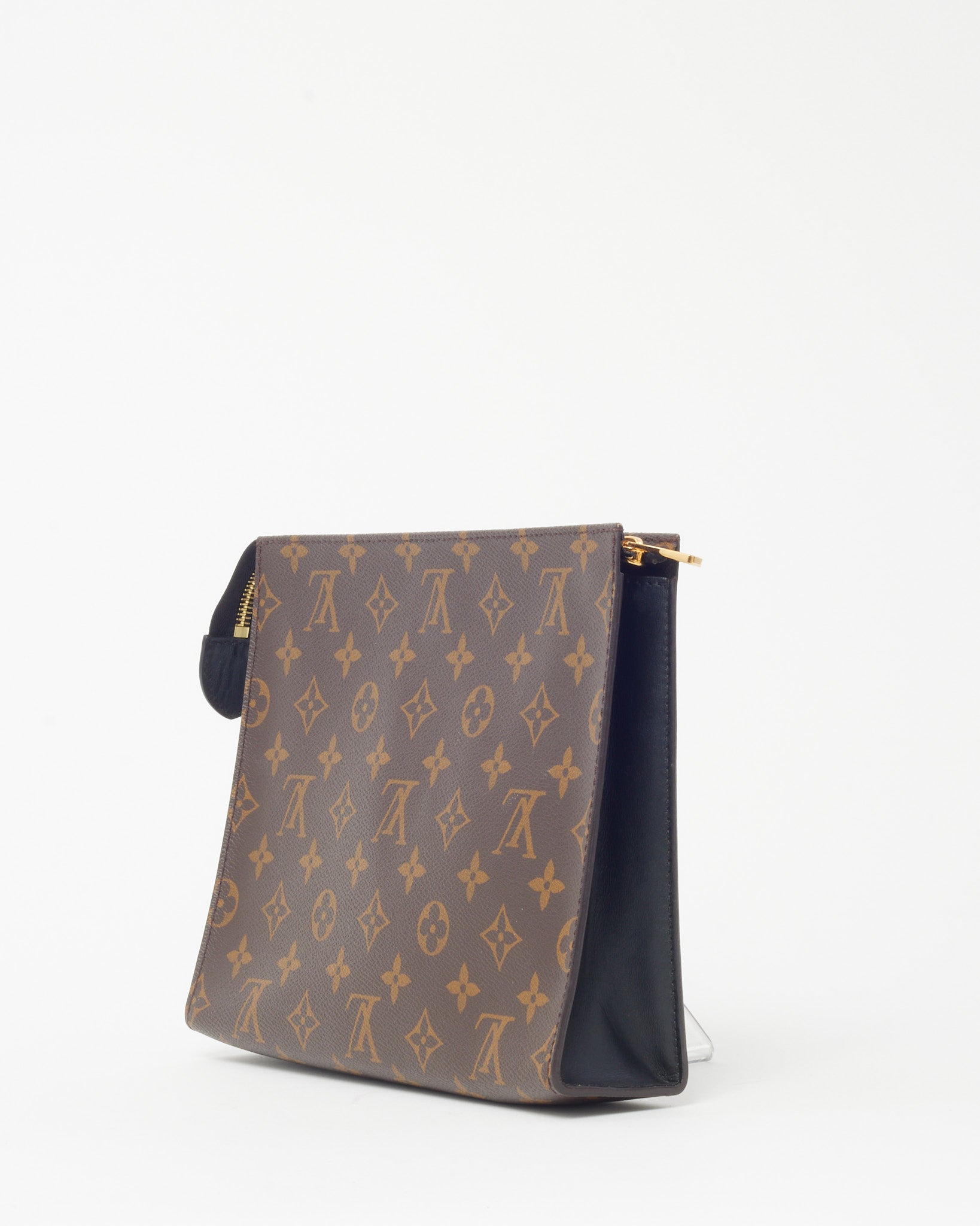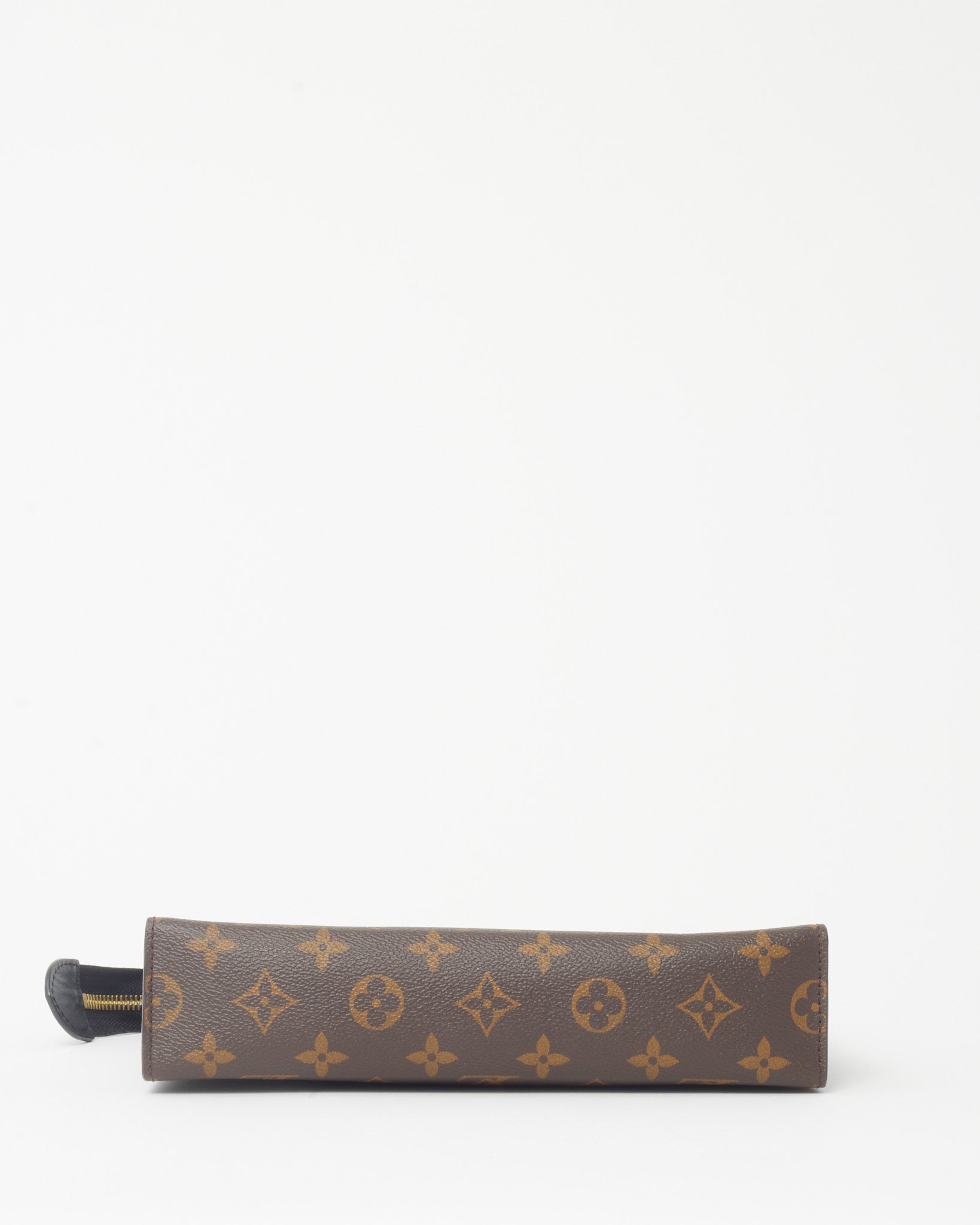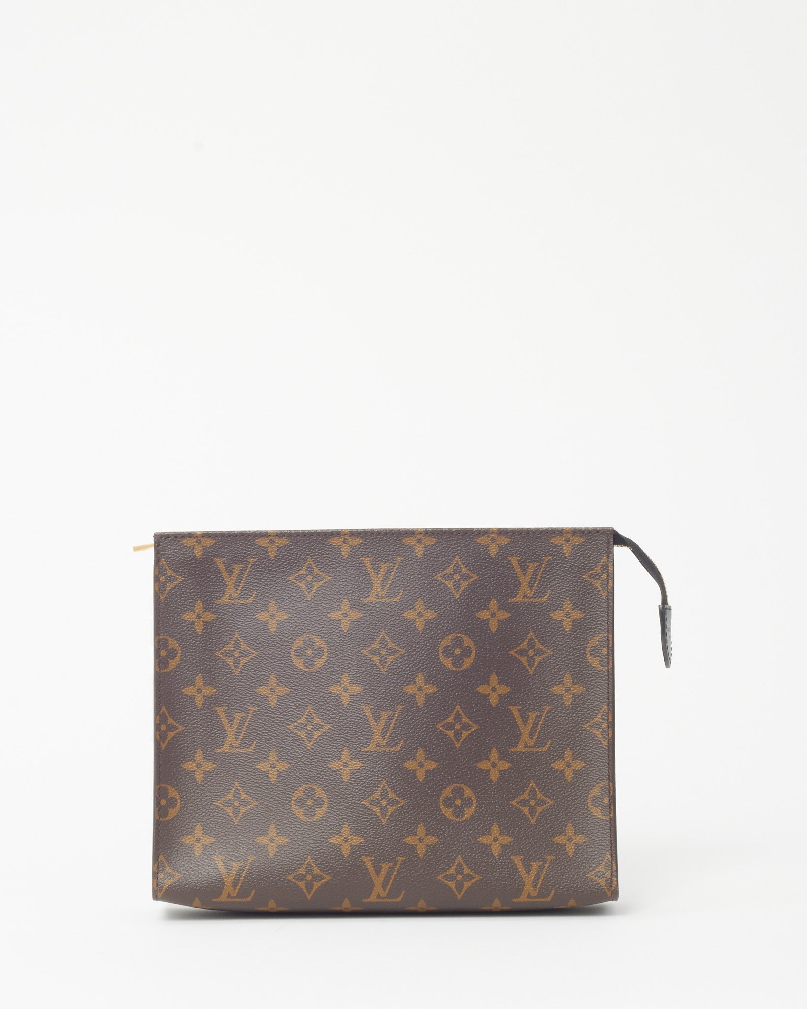 Keep your essentials organized in iconic style with this pre-loved authentic Louis Vuitton Monogram Coated Canvas with Black Leather Toiletry Pouch/Poche Toilette, crafted in the house’s signature monogram coated canvas with sleek black leather trim. The structured pouch silhouette features a secure zip-top closure and a spacious interior designed to store grooming items, cosmetics, or everyday small essentials. Durable yet refined, this Louis Vuitton toiletry pouch blends practical functionality with timeless LV heritage. A versatile designer accessory that works perfectly for travel, organization, or as a stylish carry pouch.