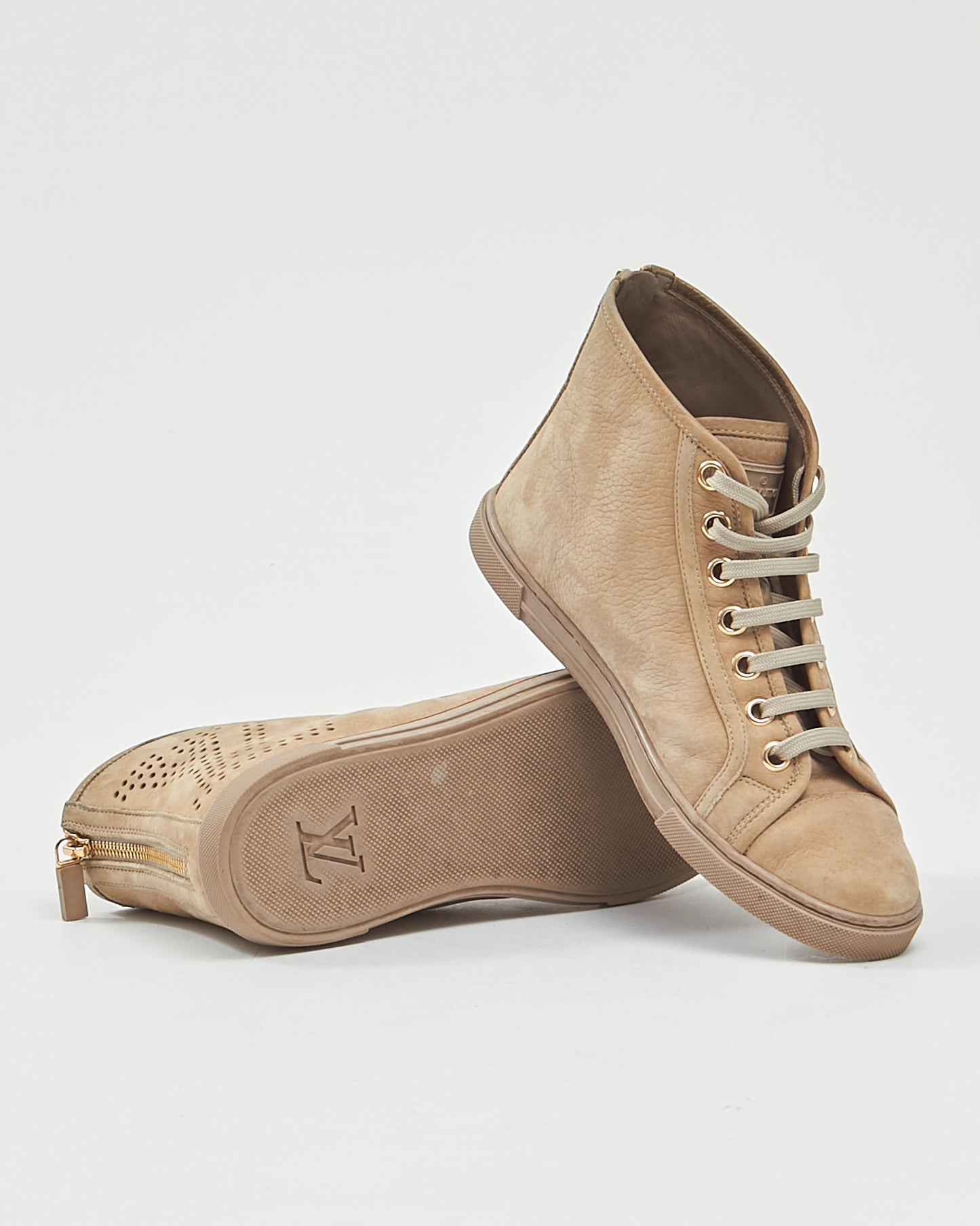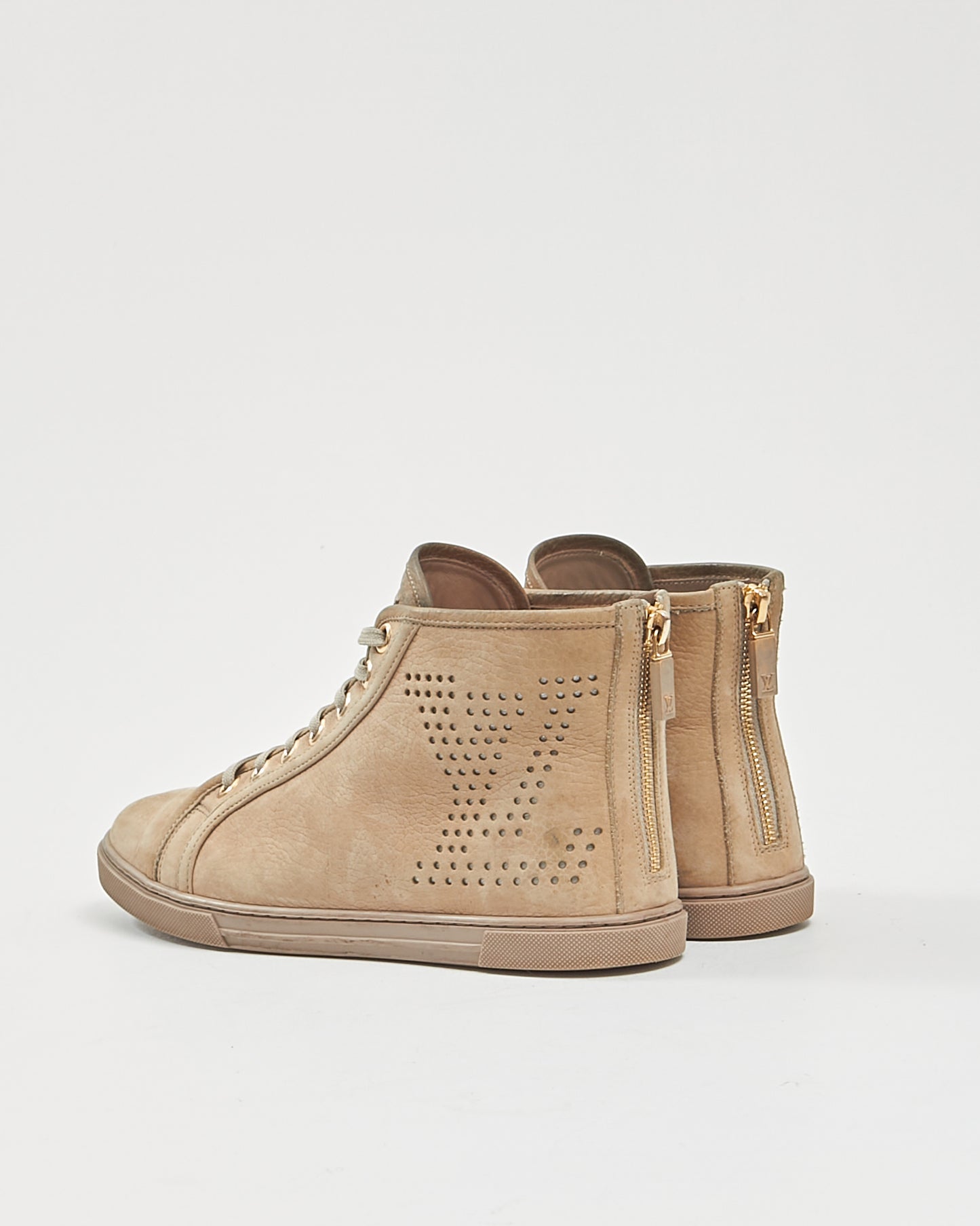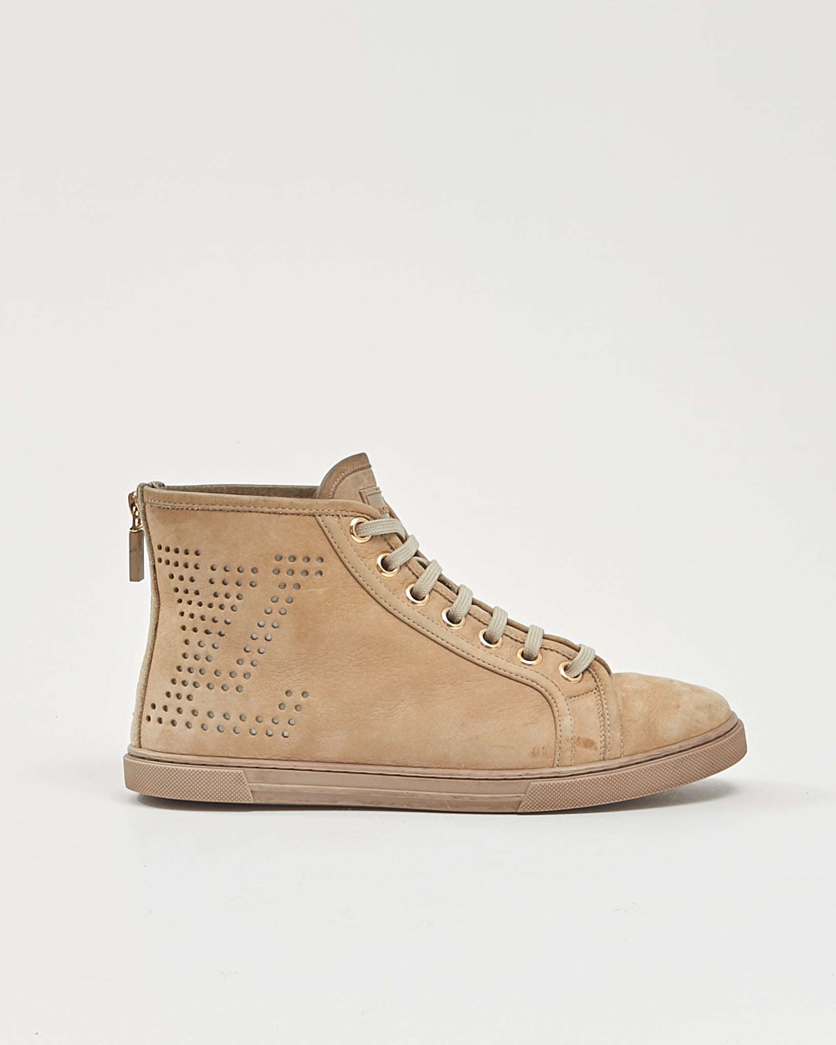Taupe Suede Leather Perforated LV Logo High Top Sneakers - 37.5