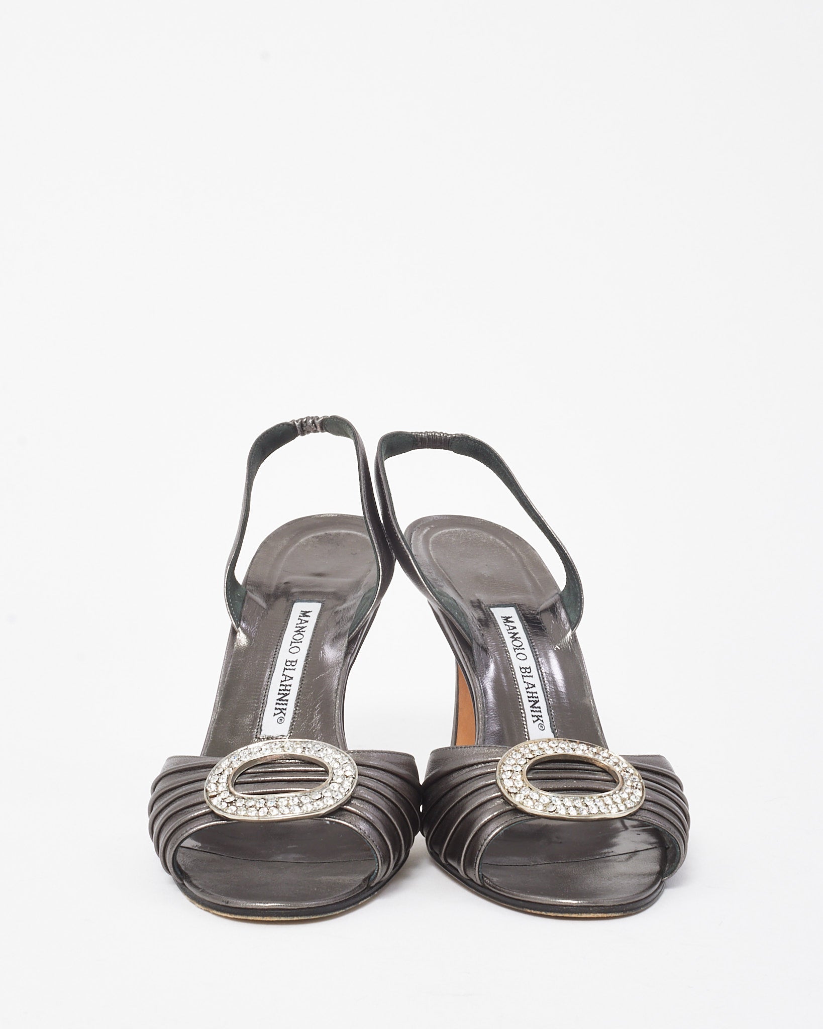 Add refined glamour to your collection with these pre-loved authentic Manolo Blahnik Dark Silver Embellished Sedaraby Slingback Pumps in size 38.5. Expertly crafted in Italy, these heels feature a luxurious dark silver leather upper with an elegant pointed toe and slingback silhouette. The iconic crystal-embellished front buckle adds signature sparkle and sophistication, making them a timeless statement for evening events or upscale occasions. With a sleek stiletto heel and refined finish, these Manolo Blahnik pumps blend classic femininity with elevated style, ideal for pairing with cocktail dresses or tailored separates.
