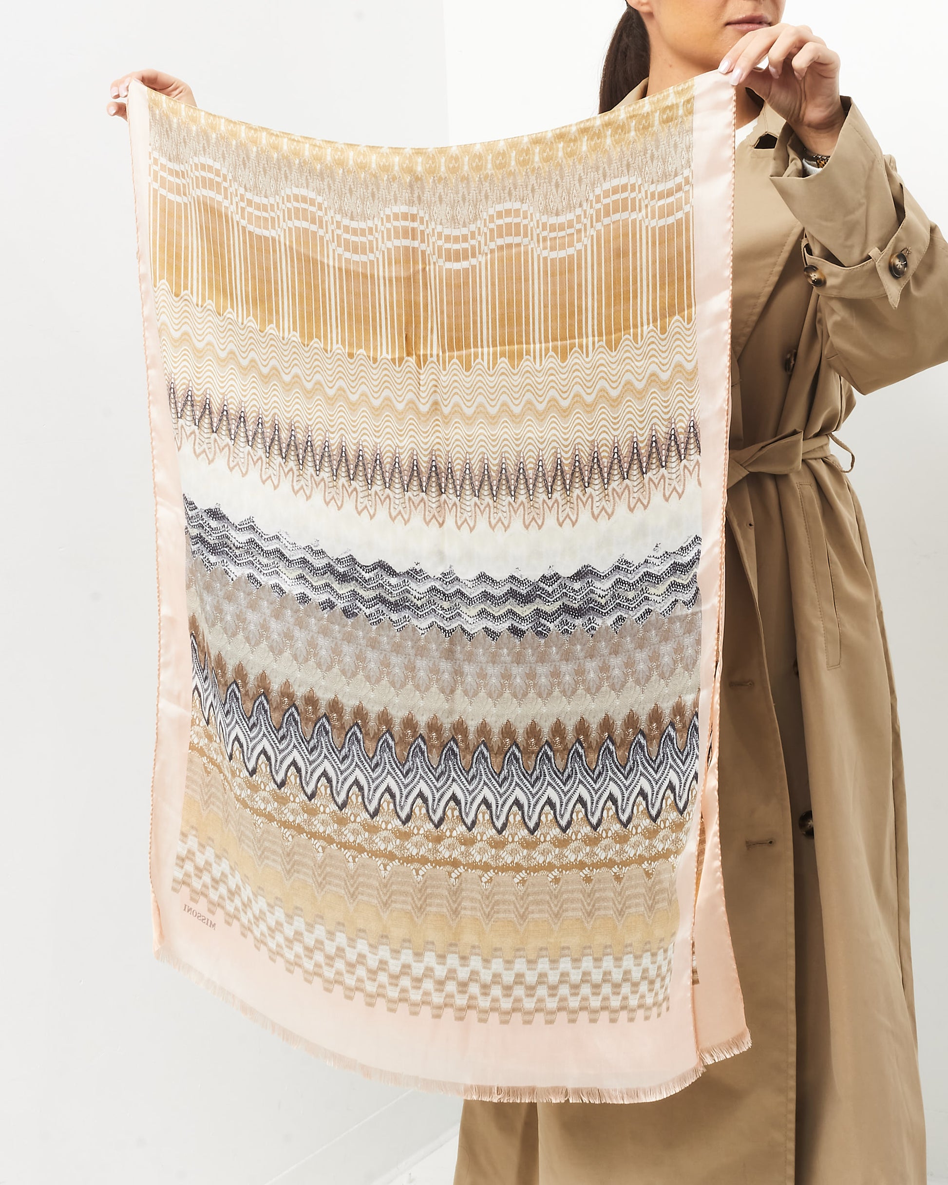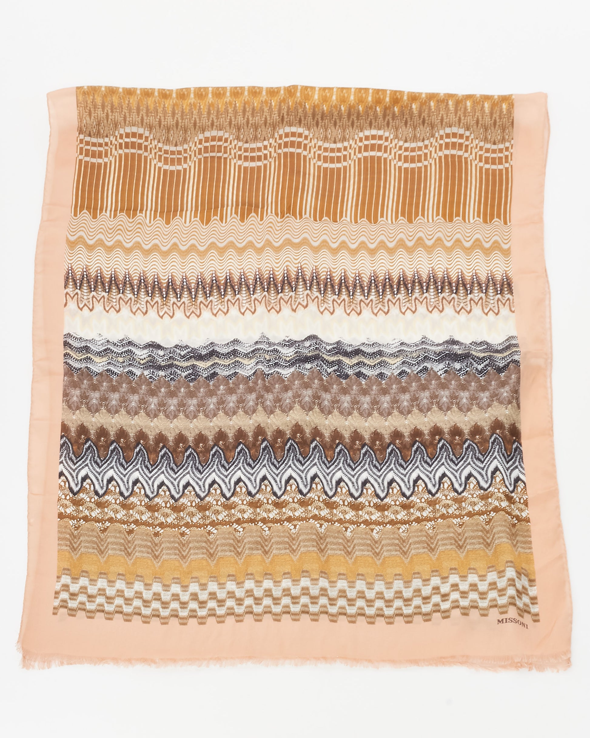 Vibrant and unmistakably Missoni, the pre-owned authentic Gold Multi Zigzag Print Silk Scarf is a colorful nod to the brand’s iconic patterns. Crafted from luxuriously soft silk, it features a dynamic zigzag motif in rich tones of gold, orange, pink, and blue. Lightweight and versatile, it’s perfect for styling around the neck, bag, or hair—adding a pop of playful elegance to any look.