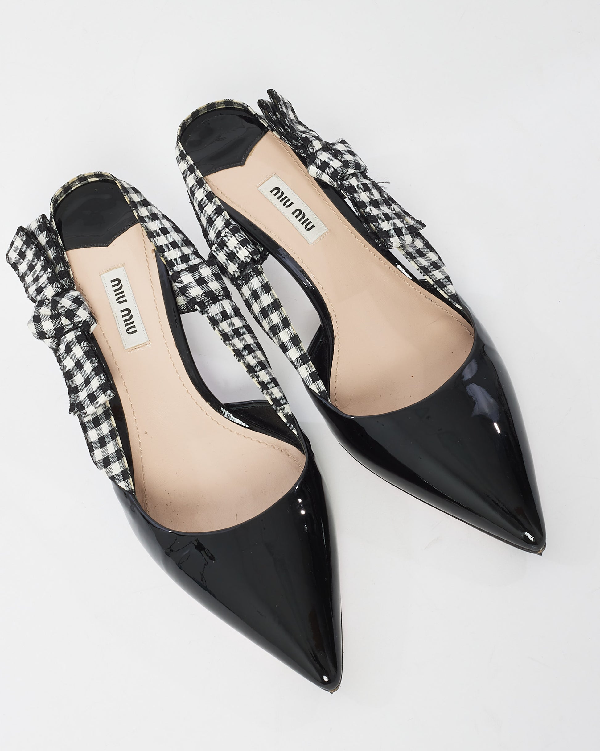 Black Patent Point Toe Plaid Bow Sling Back Kitten Heel - 39