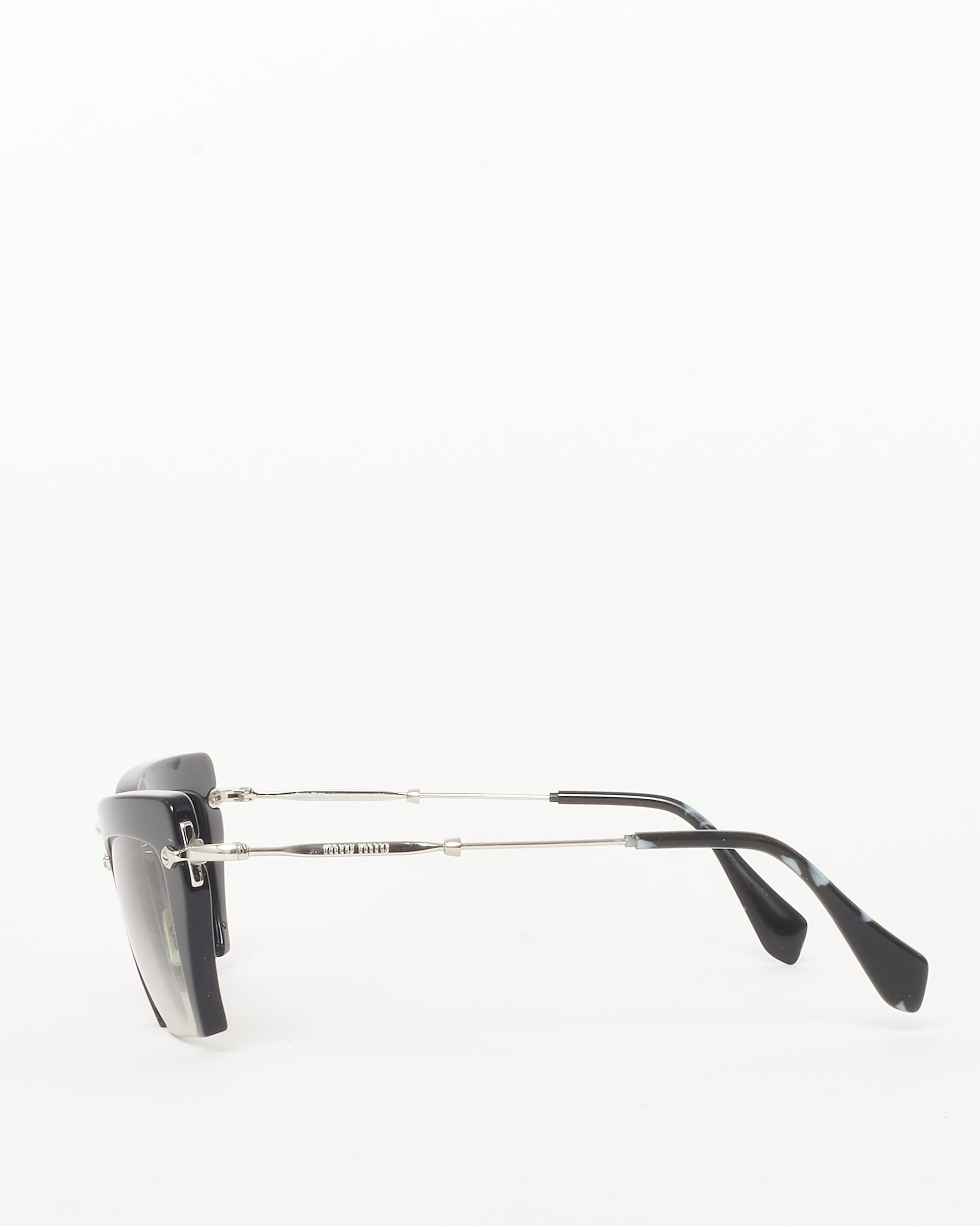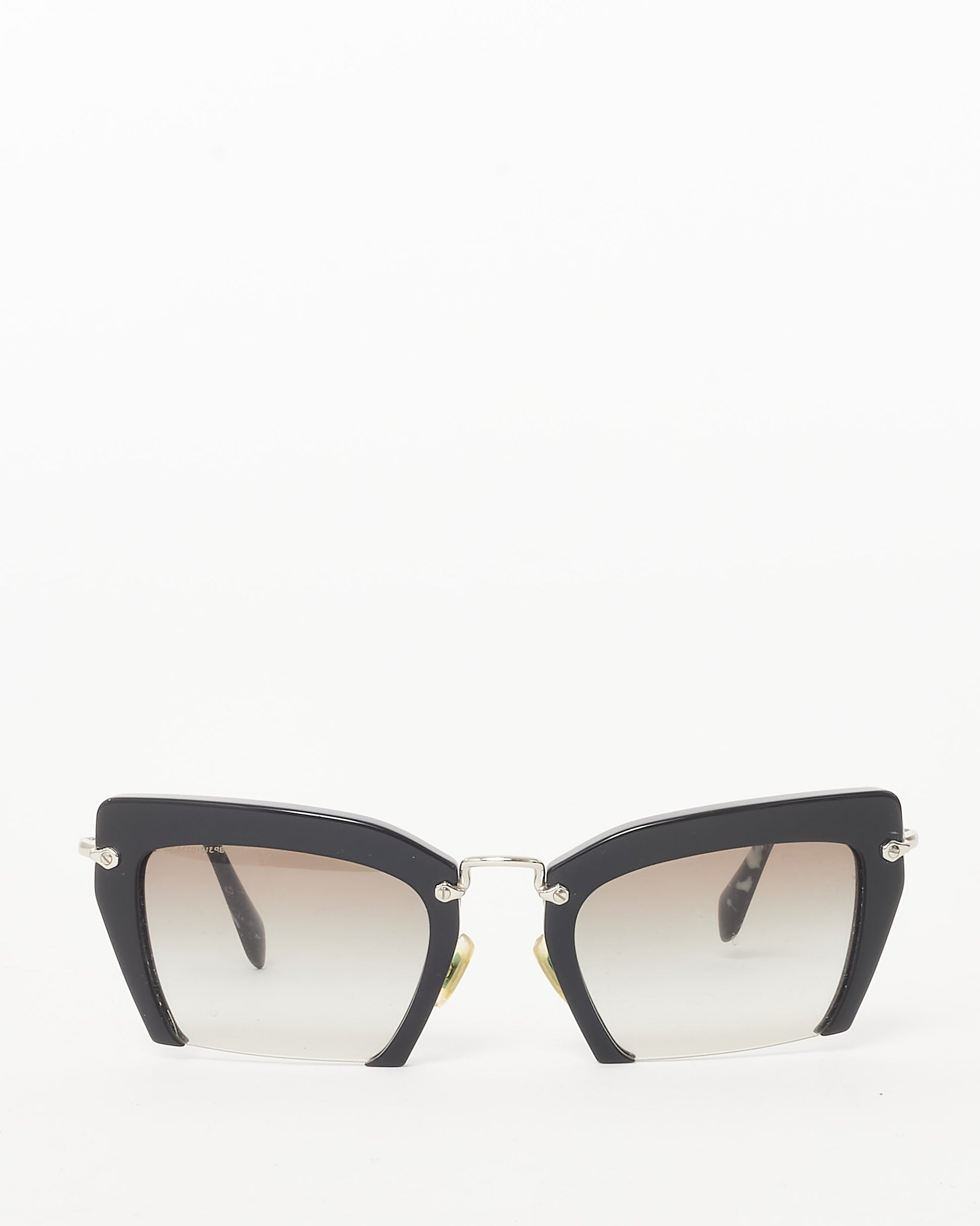 Playful yet polished, the pre-owned authentic Miu Miu Black SMU 10Q Cut Out Sunglasses deliver bold style with an avant-garde edge. Featuring a dramatic cat-eye silhouette, these standout frames are crafted from glossy black acetate with unique cut-out detailing at the temples that adds architectural intrigue.
