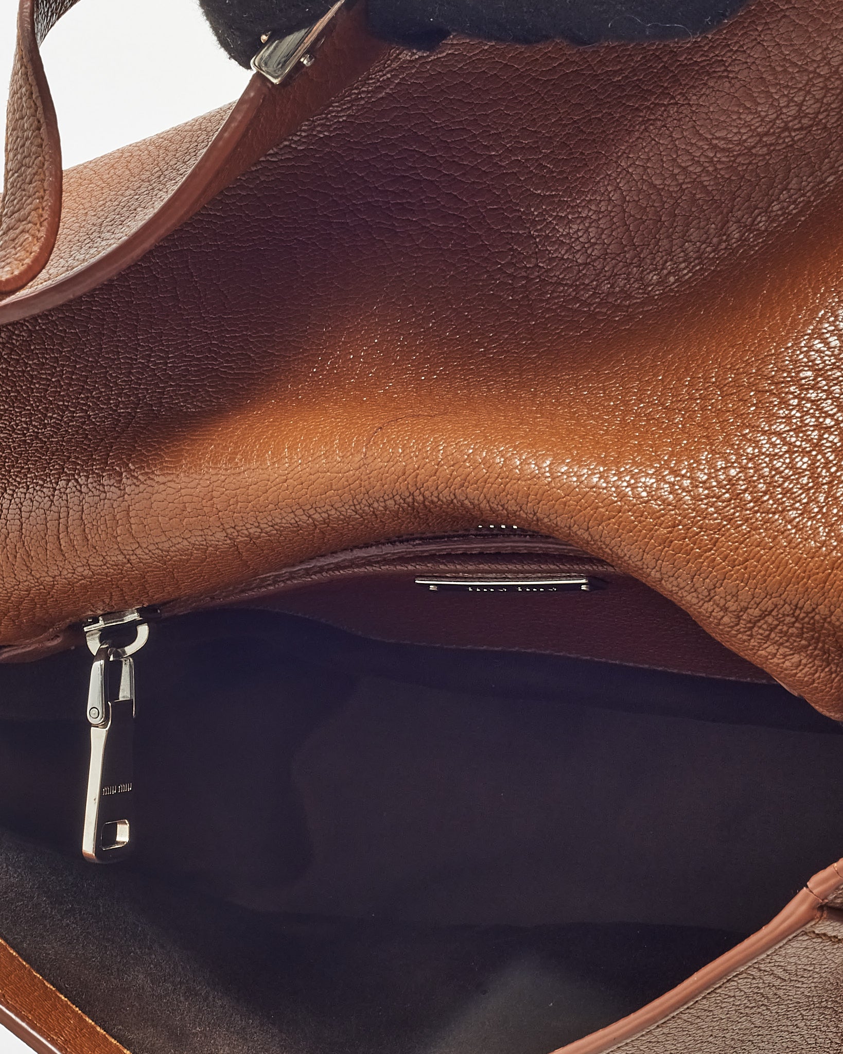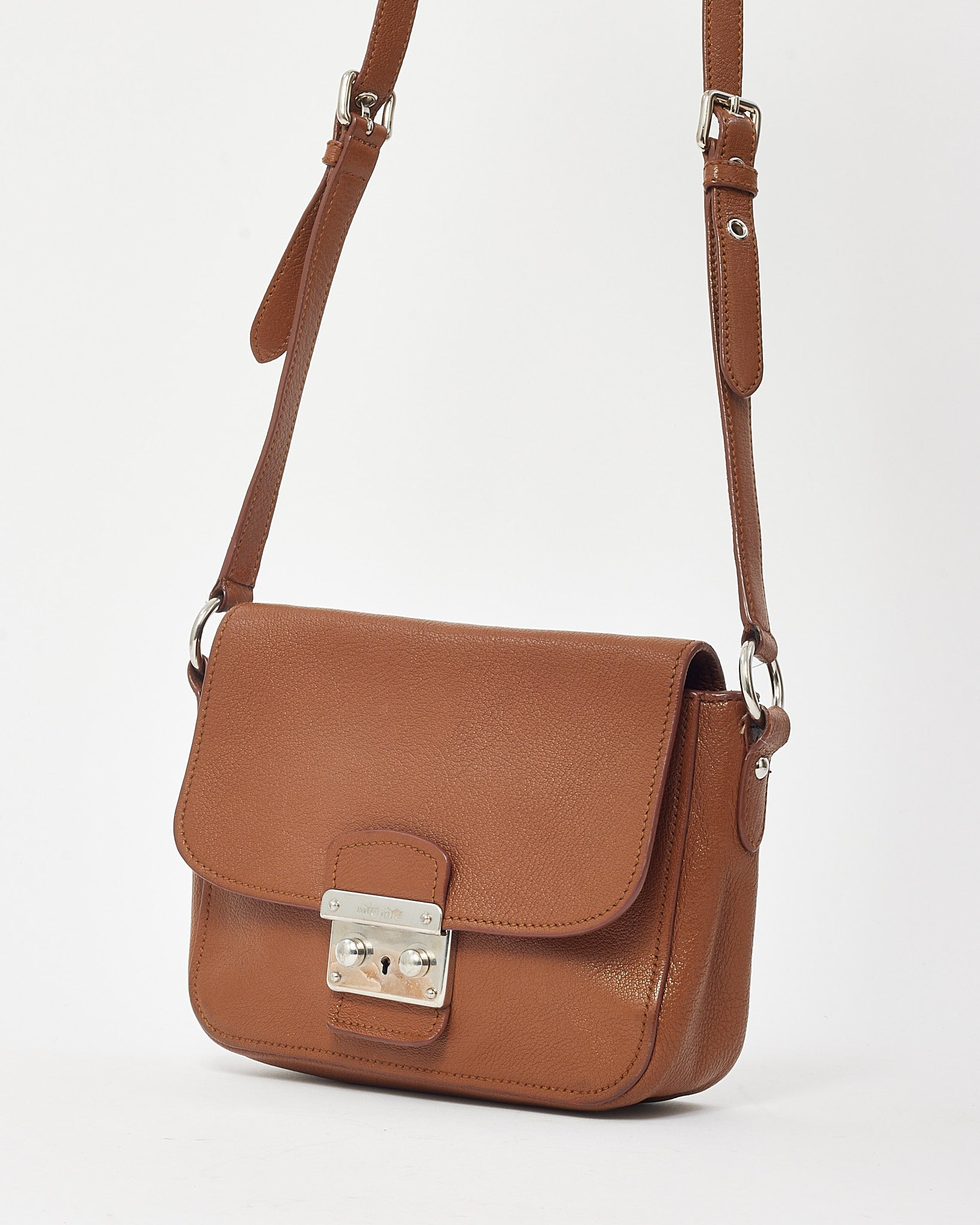 Add vintage-inspired charm to your everyday wardrobe with this pre-loved authentic Miu Miu Brown Brandy Leather Madras Logo Push Lock Crossbody Bag. Crafted from rich textured Madras leather in a warm brandy hue, this structured silhouette features a sleek flap front with a silver-tone logo-engraved push lock closure. The adjustable crossbody strap offers hands-free ease, while the compact interior keeps essentials neatly organized. Both polished and practical, it’s a timeless piece with Miu Miu’s signature blend of elegance and edge.