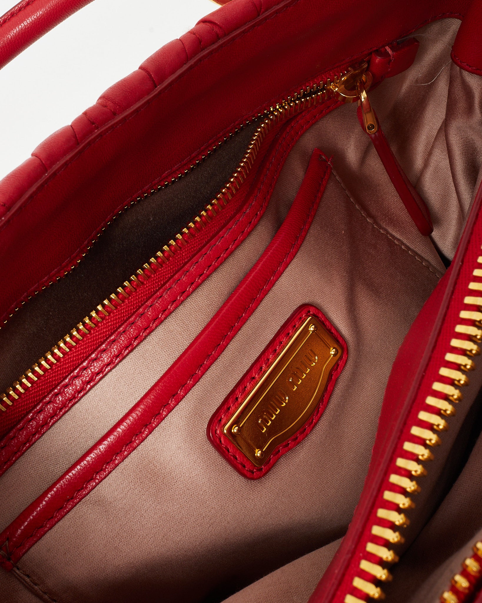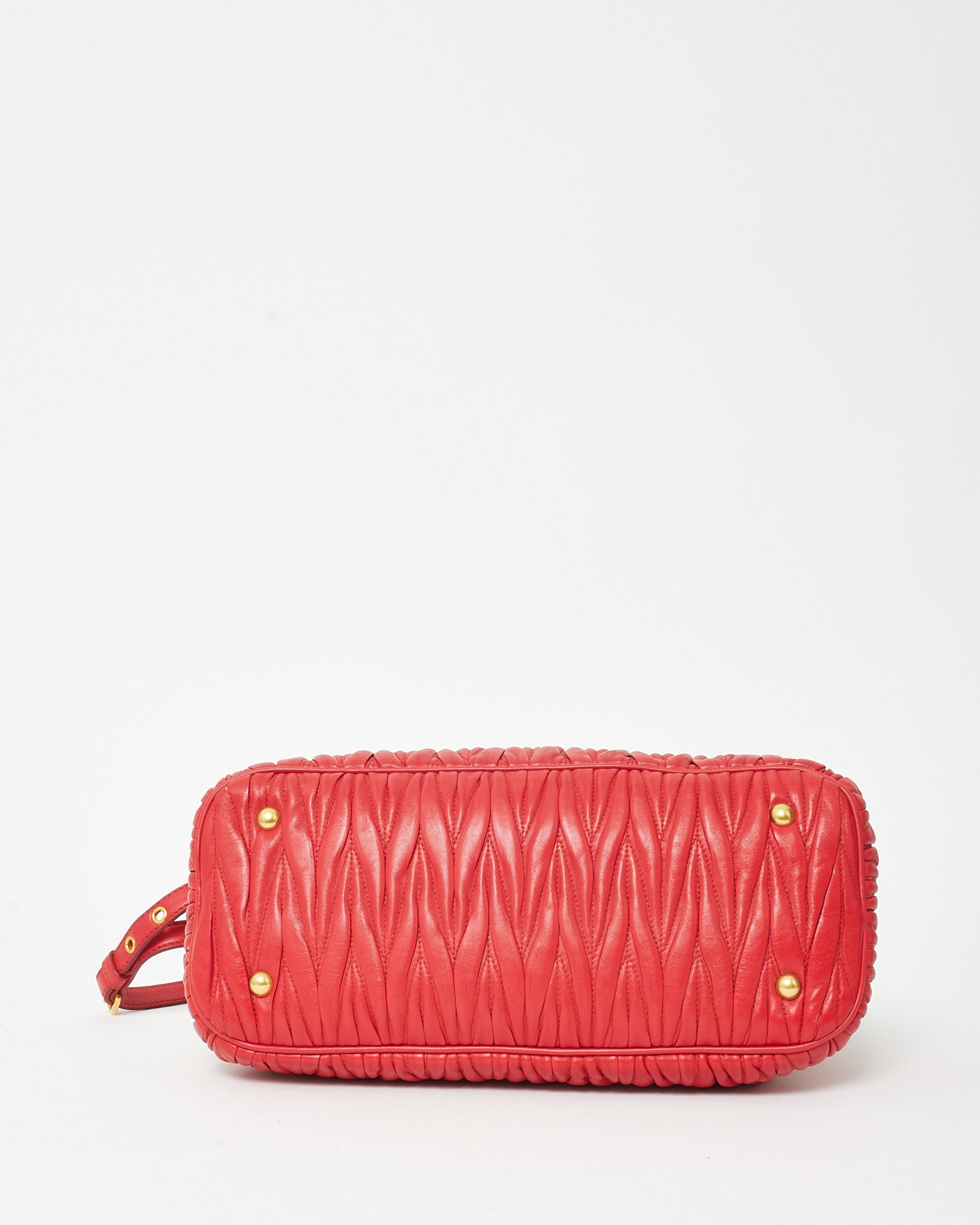 A vibrant expression of texture and craftsmanship, this pre-loved authentic Miu Miu Gauffre Top Handle Bag is crafted in rich red nappa leather with the brand’s signature ruched finish. The compact yet spacious silhouette features dual rolled top handles and a detachable crossbody strap for versatile 2-way wear. Finished with gold-tone hardware and logo detailing, this standout carryall captures effortless femininity with a touch of Italian glamour—perfect for elevating both day and evening looks.
