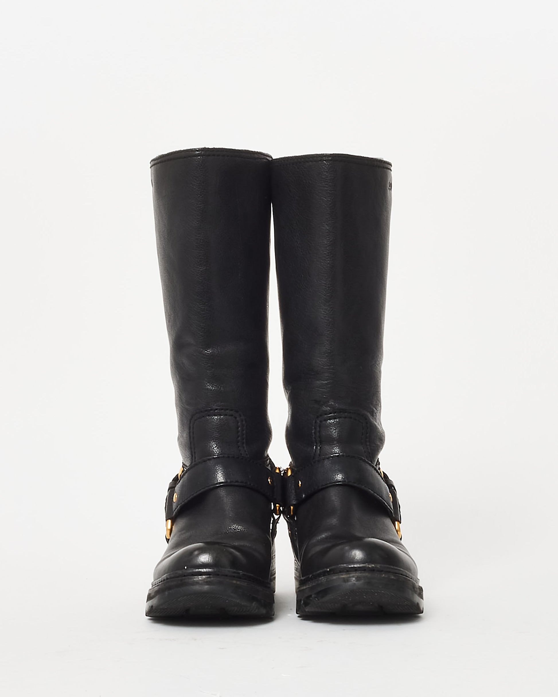 Black Leather Moto Gold Buckle Knee-High Boots - 35.5