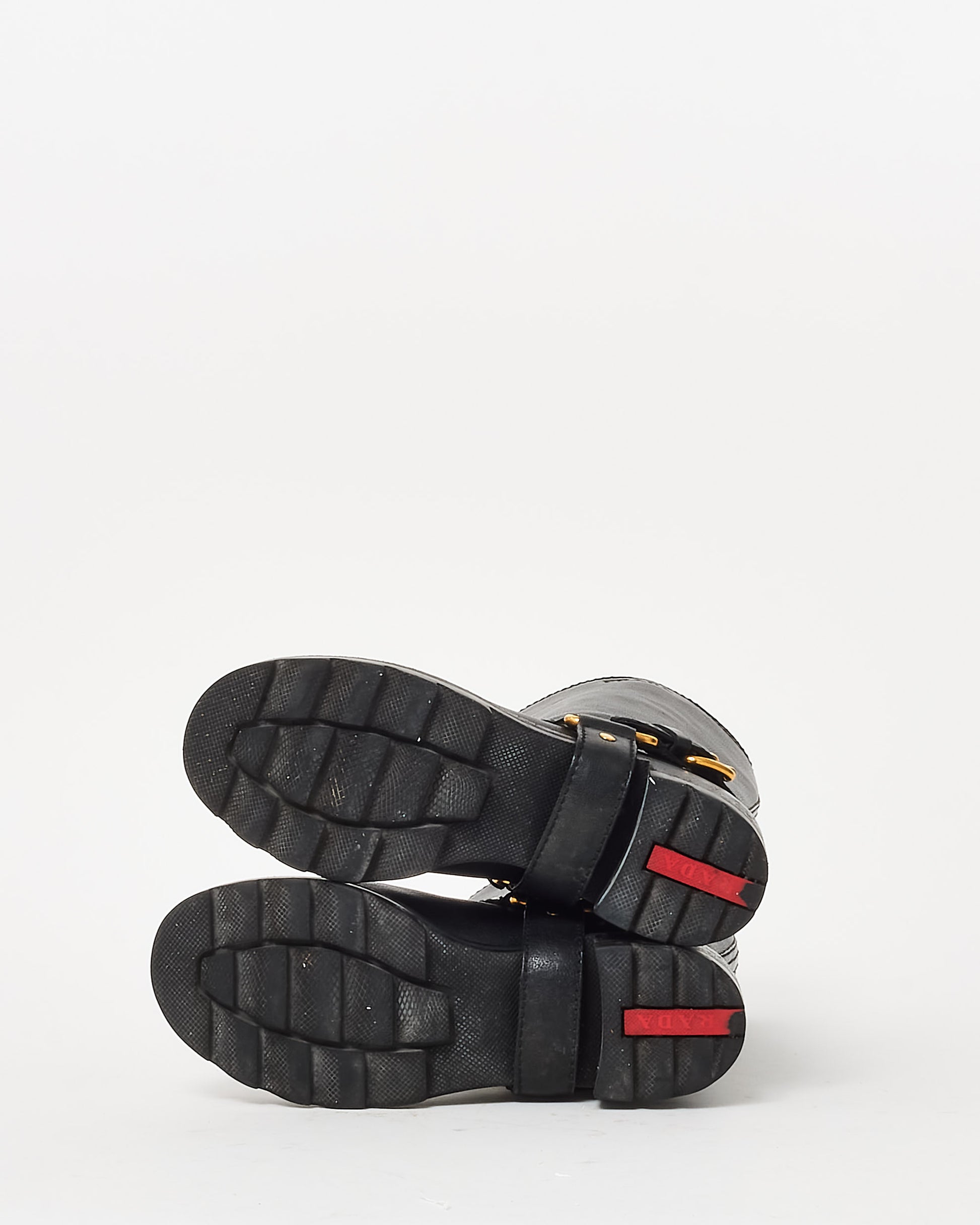 Add a bold edge to your wardrobe with these pre-owned authentic Prada Black Leather Moto Gold Buckle Knee-High Boots, a striking blend of luxury and attitude. Crafted from premium black leather, these boots are designed with sleek lines and a structured silhouette that exudes sophistication.