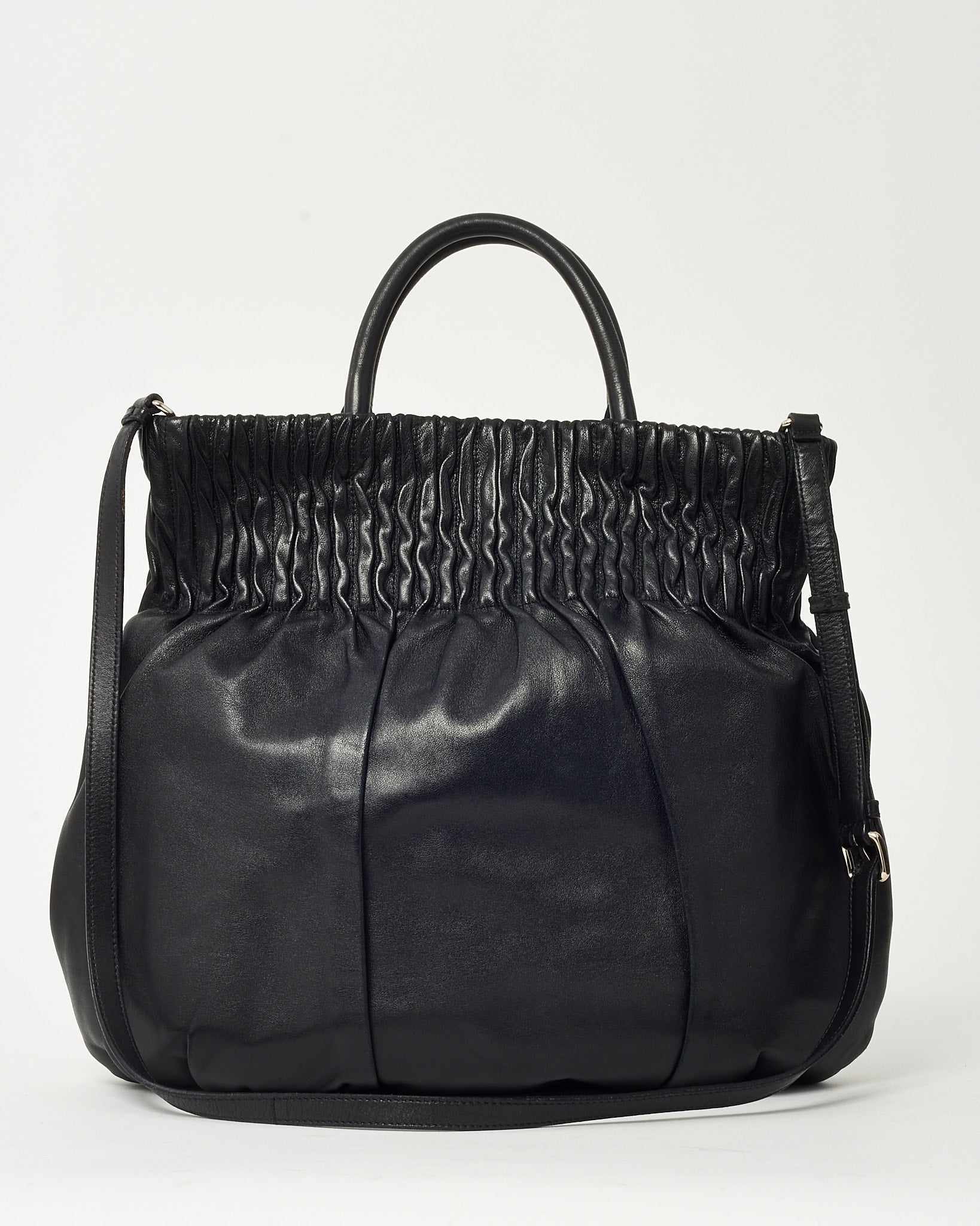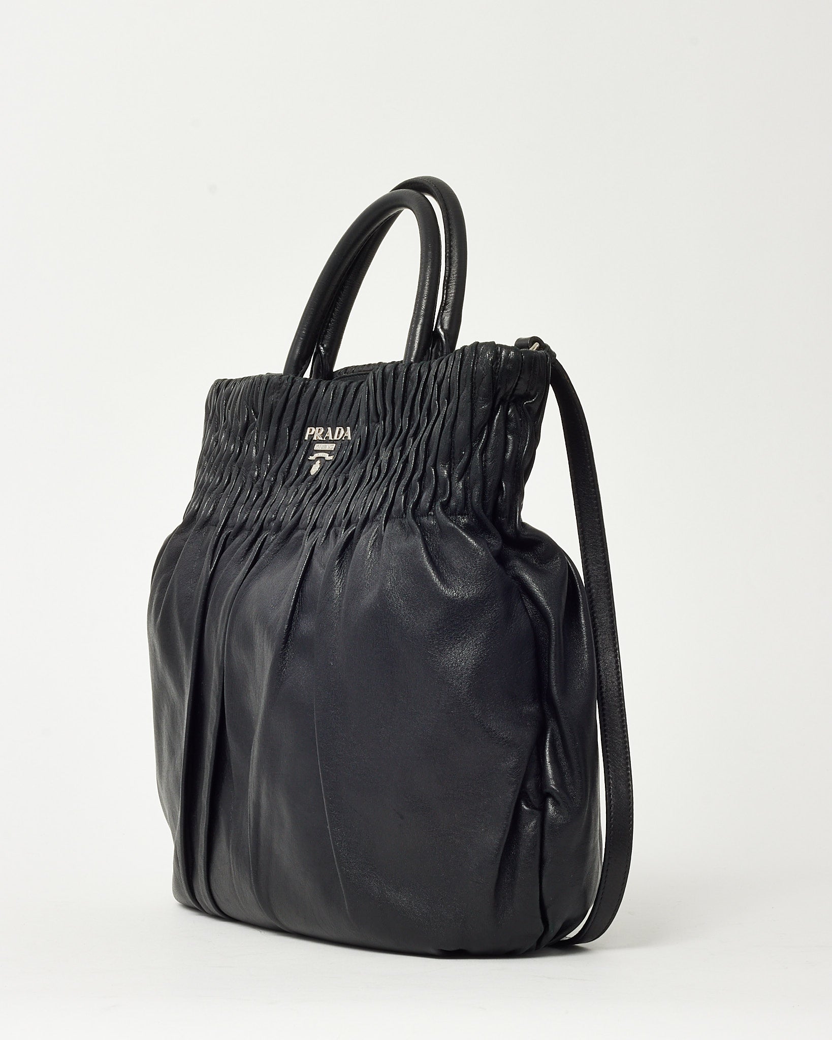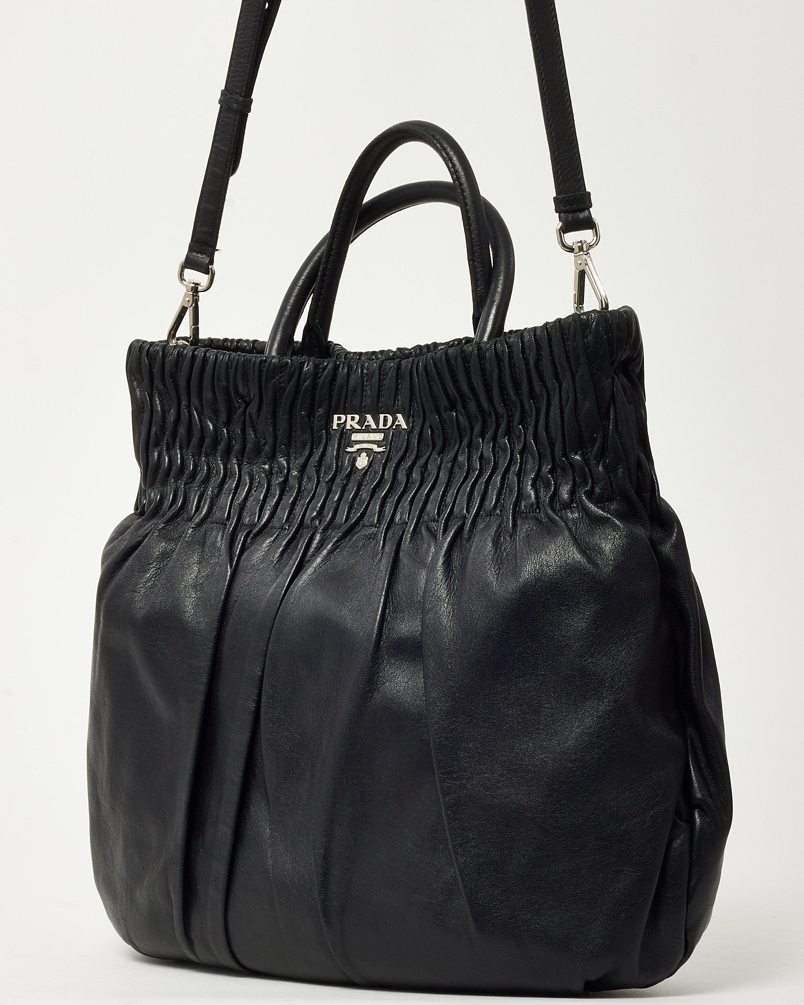 Black Nappa Leather Pleated Logo 2Way Tote Bag with Strap