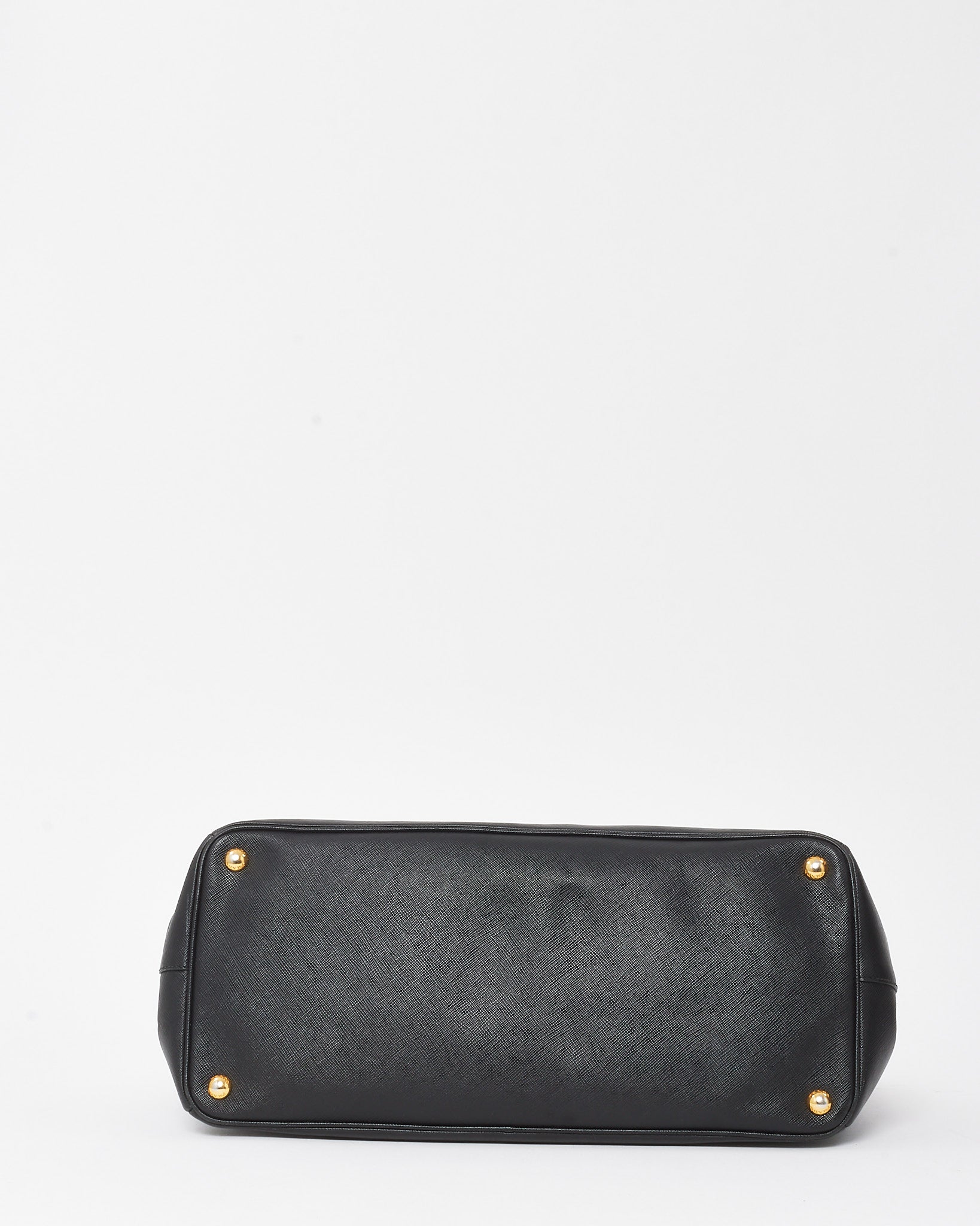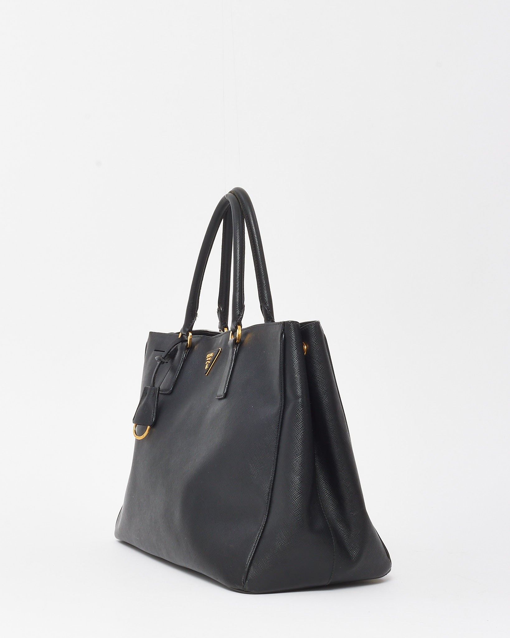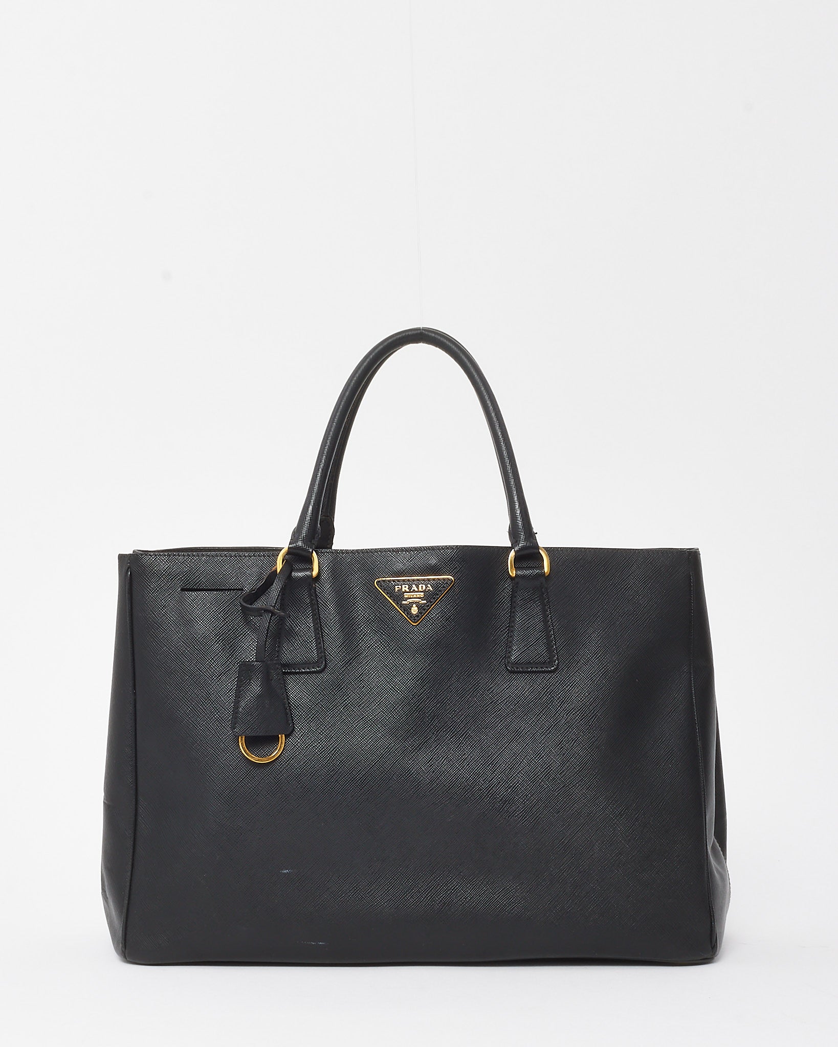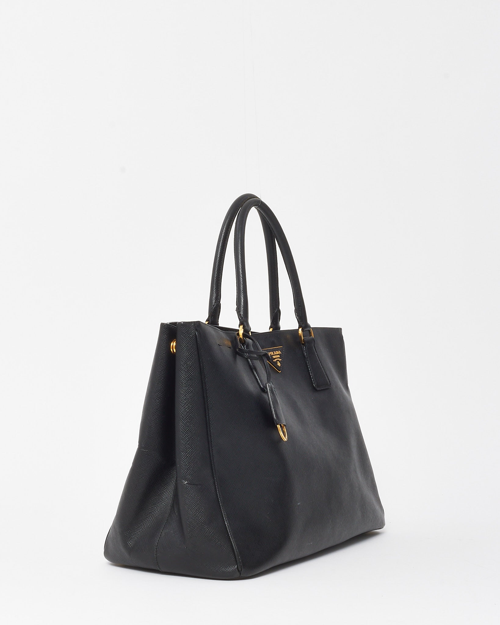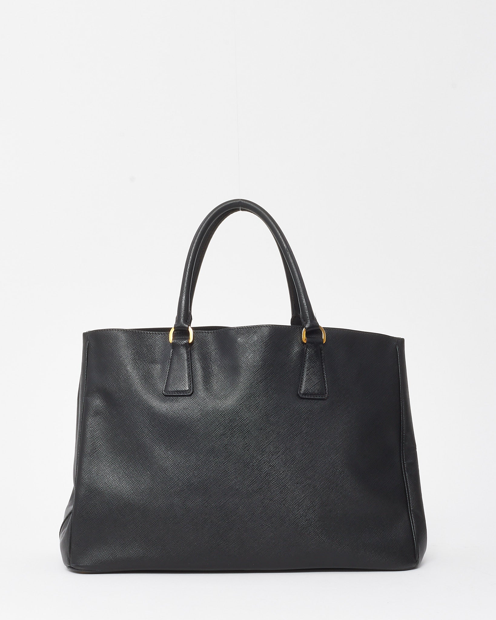 Timeless and sophisticated, this Prada Large Lux Tote is crafted from the house’s signature scratch-resistant black Saffiano leather. Designed with clean lines and structured silhouette, it features dual rolled handles, gold-tone logo hardware, and a roomy, tri-compartment interior with a center zip divider—ideal for everyday organization. A detachable shoulder strap adds versatility, making it a refined choice for both work and travel. This iconic Prada tote embodies effortless Italian elegance and enduring style.