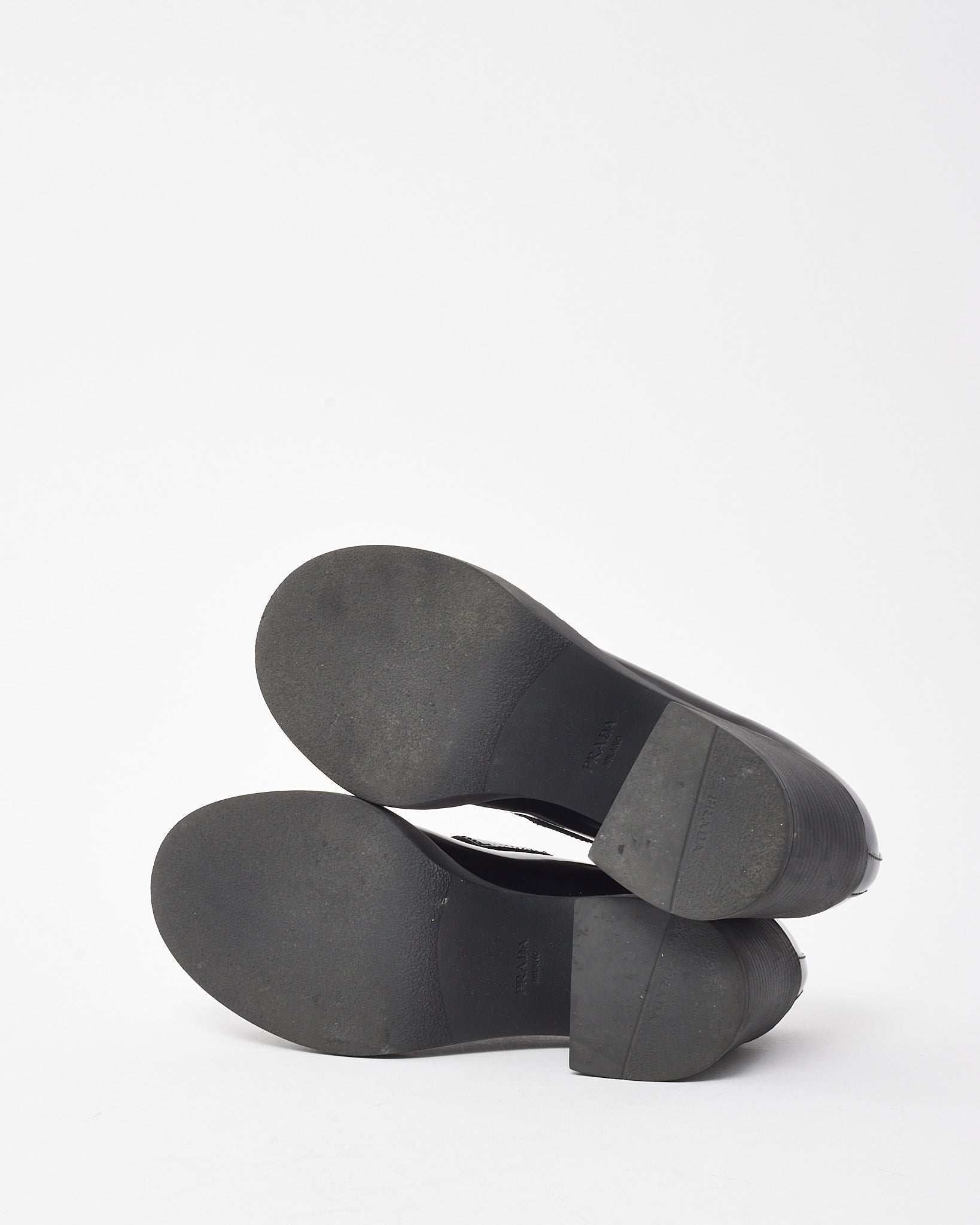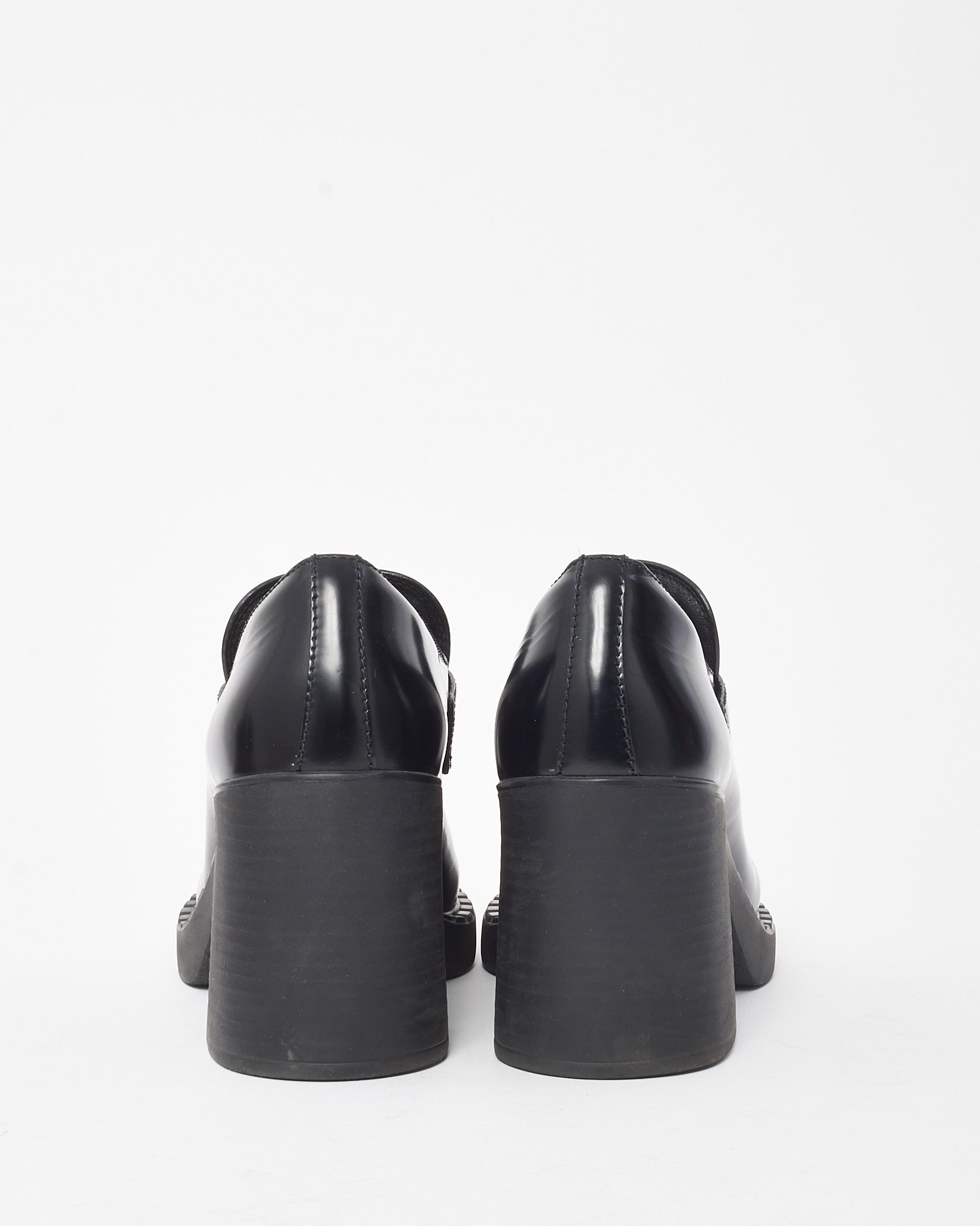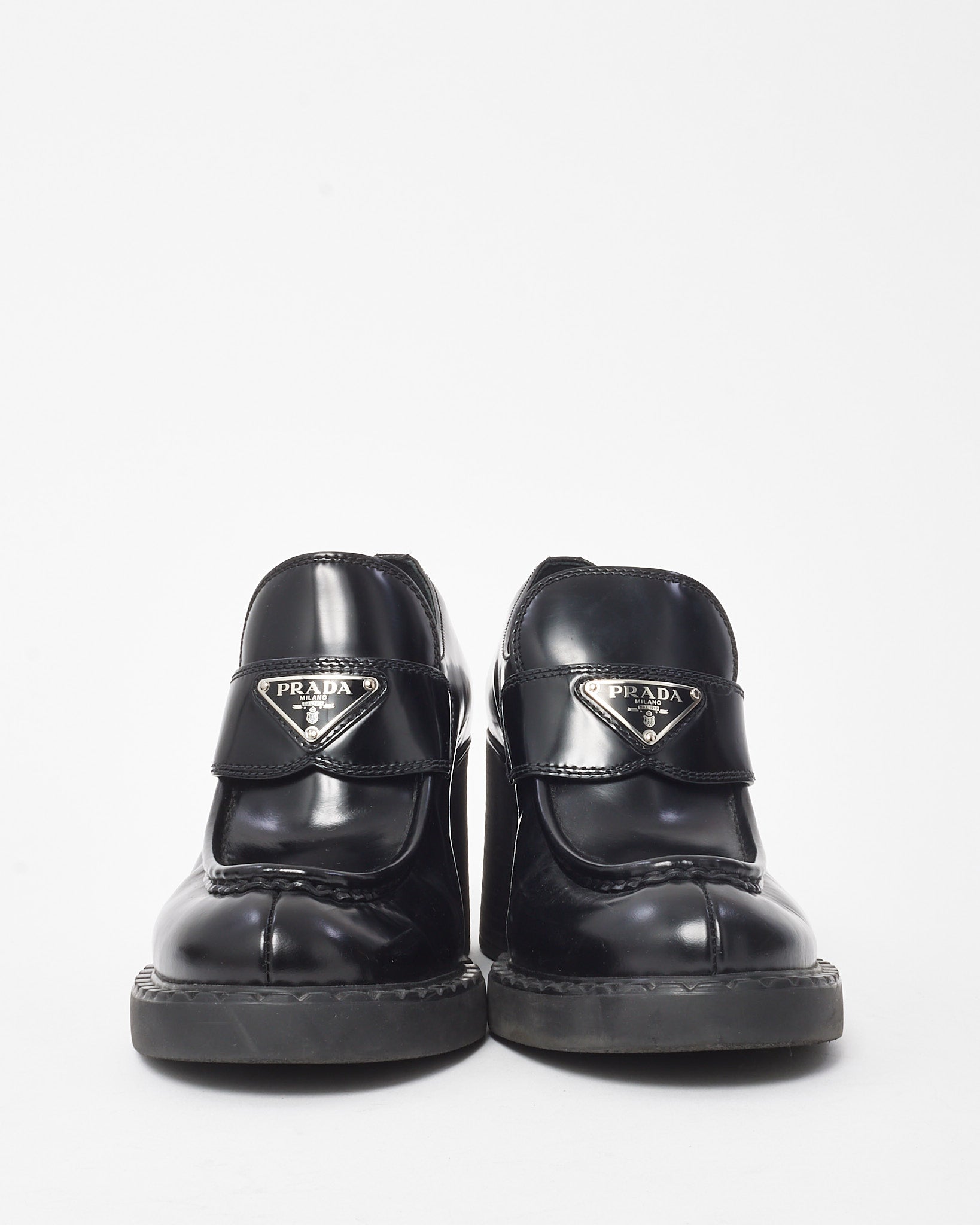 Add modern polish to your footwear collection with these pre-loved authentic Prada Black Spazzolato Metal Triangle Logo 85mm Heeled Loafers. Expertly crafted in high-shine black Spazzolato leather, this sleek pair features a classic loafer silhouette elevated by a sharp 85mm block heel. Prada’s signature enameled triangle logo at the vamp offers an unmistakable touch of the house’s iconic design. Whether styled with tailored trousers or a minimal dress, these heeled loafers deliver an ideal blend of structure, refinement, and fashion-forward edge.