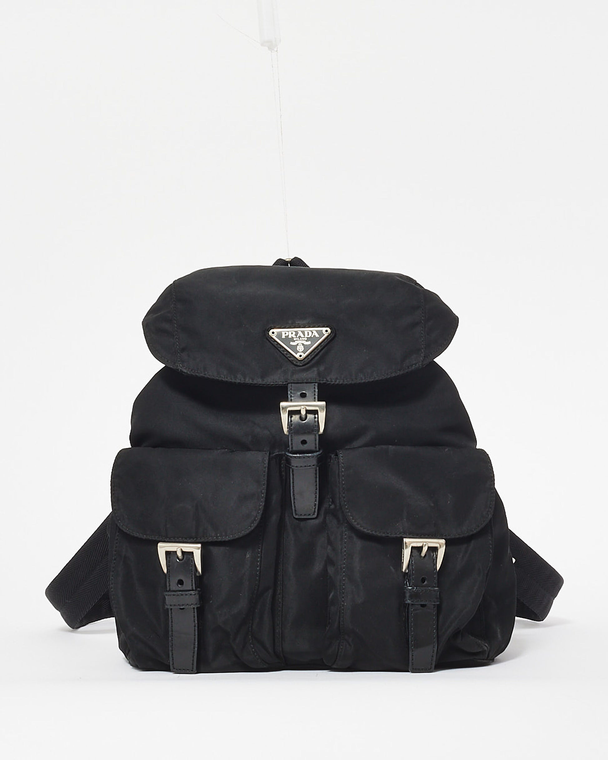 Explore Prada's exquisite collection of handbags, featuring this certified pre-owned Black Tessuto Nylon Double Pocket Buckle Small Backpack. Embodying timeless elegance and modern sustainability, each piece, including favorites like this, is authenticated by Retyche. Discover sustainable luxury — shop our current treasures or find inspiration for your next coveted find.