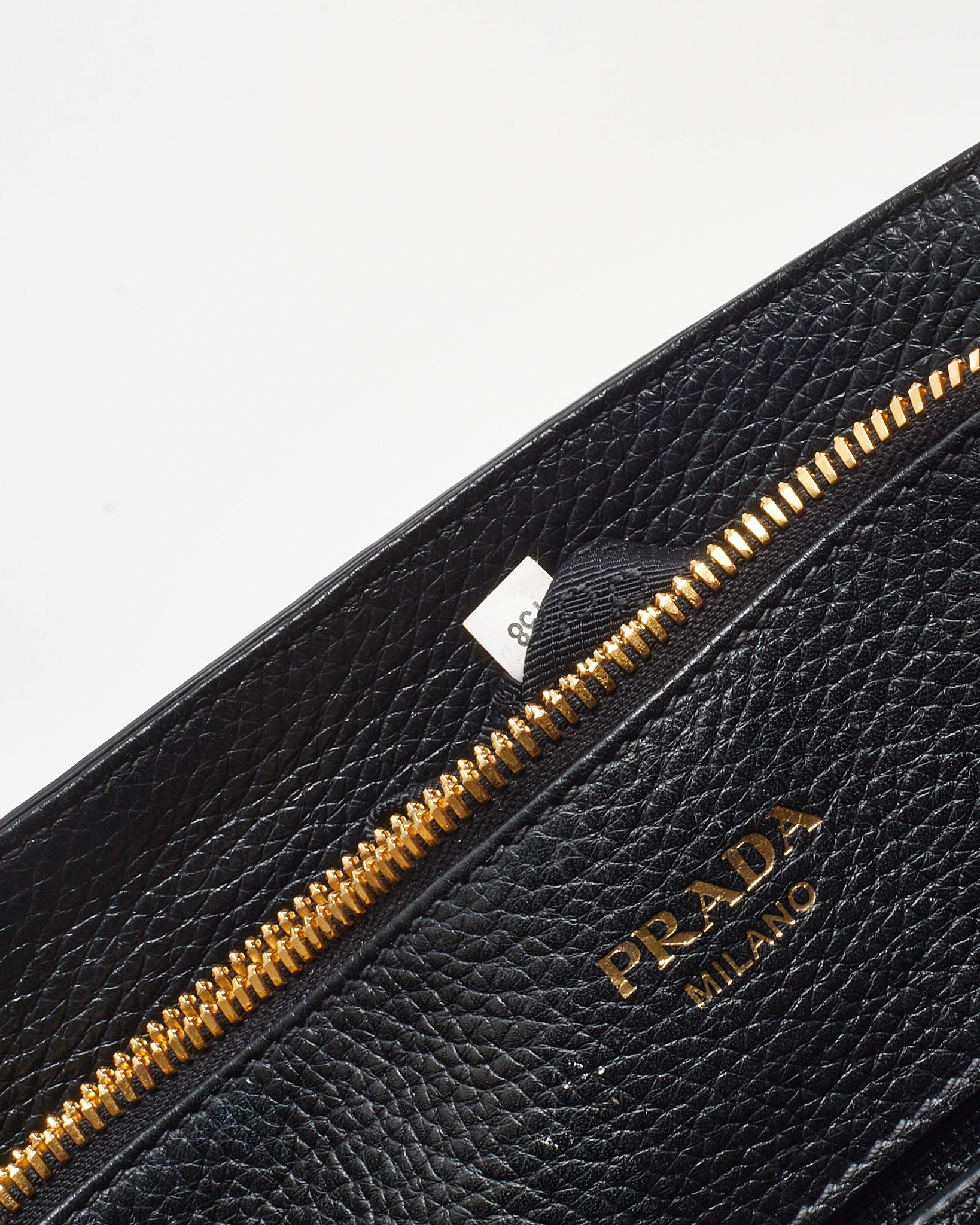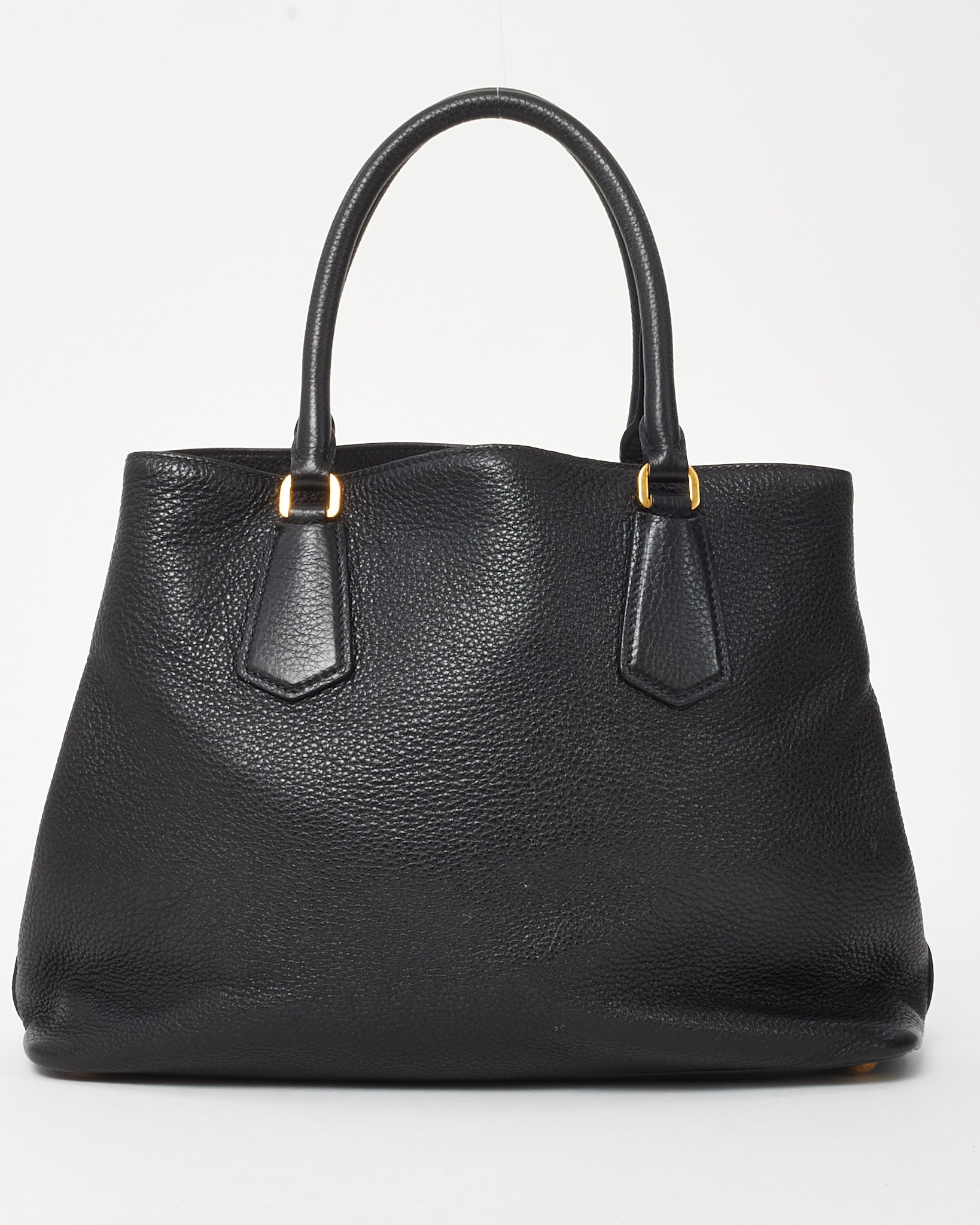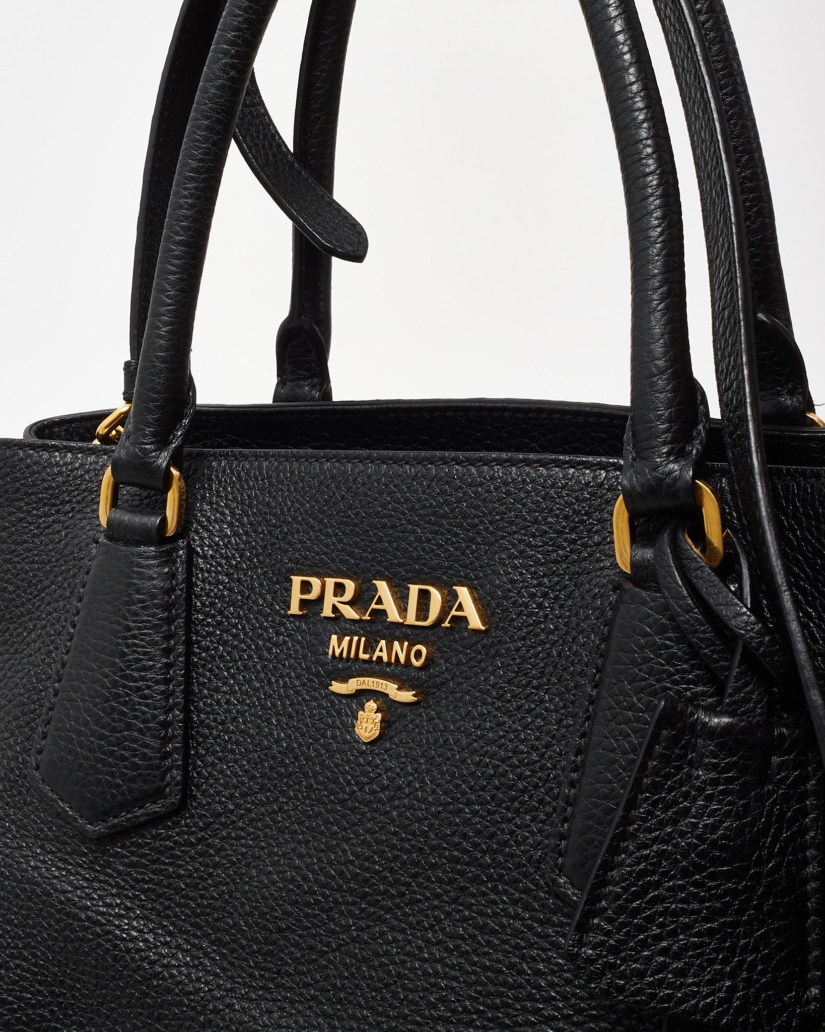 Elegant and versatile, this pre-owned authentic Prada Phenix Double Tote is crafted from black Vitello leather with a softly structured silhouette and subtle gold-tone logo detailing. Featuring dual top handles and a detachable shoulder strap, it offers both handheld and crossbody styling. The dual-compartment interior with a center zip divider keeps essentials organized and secure.