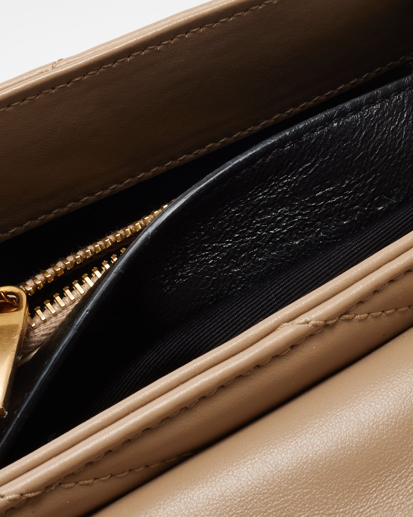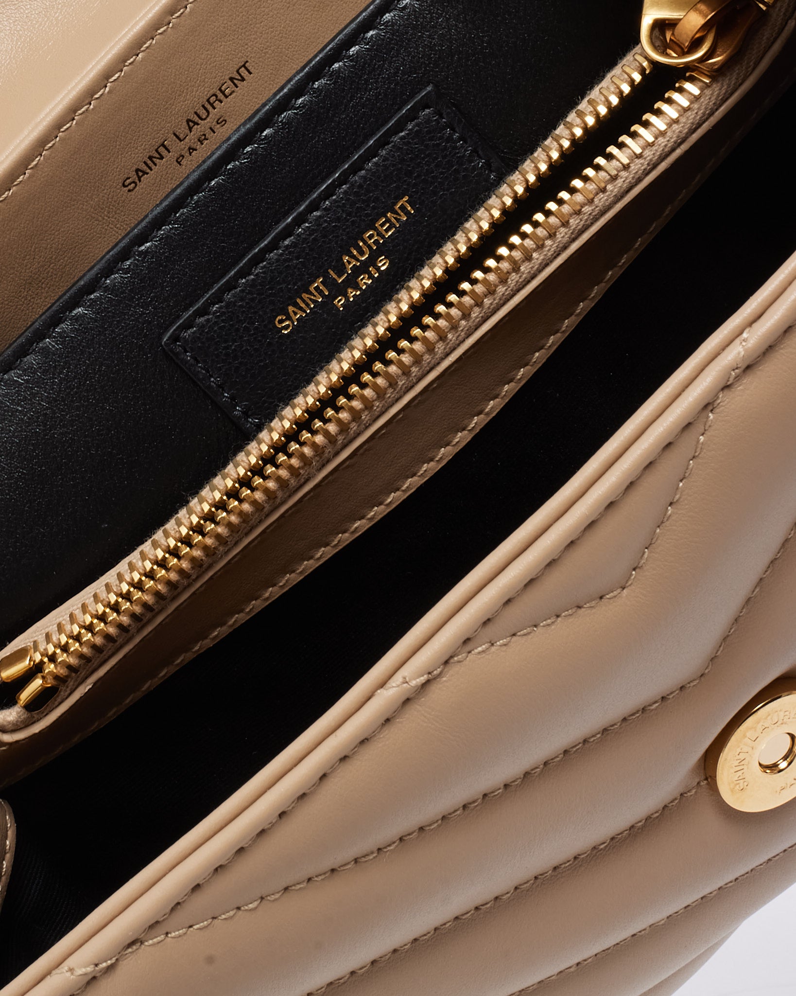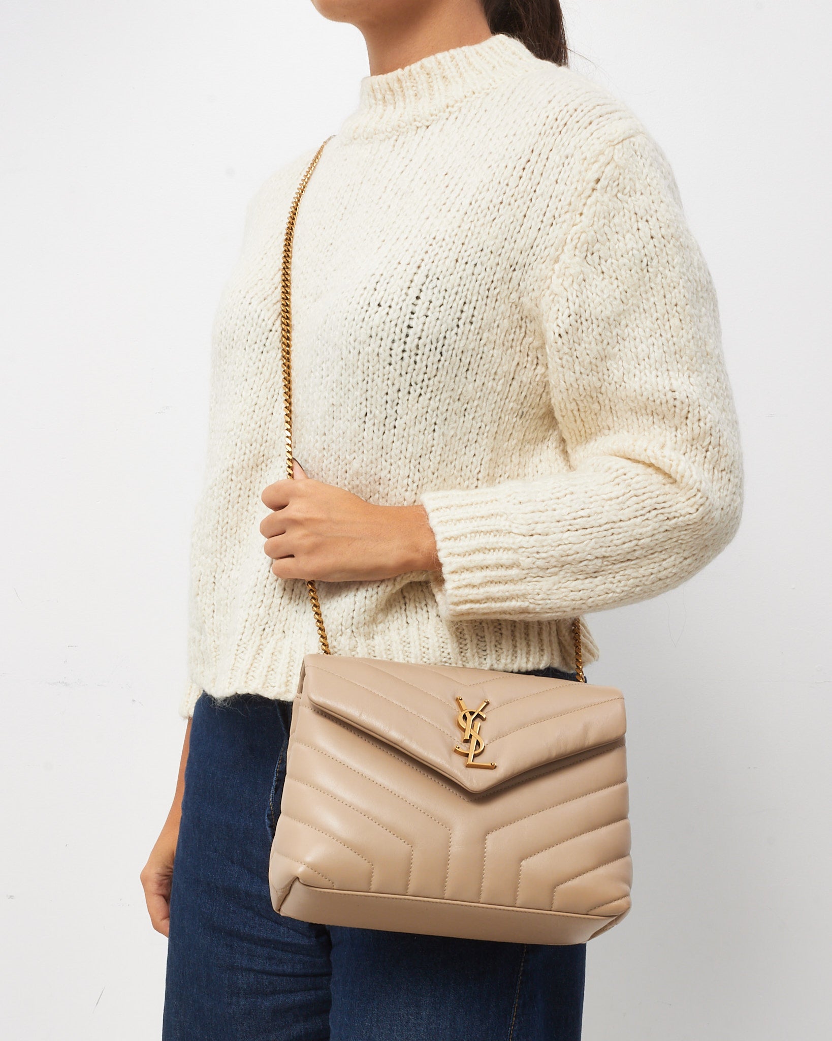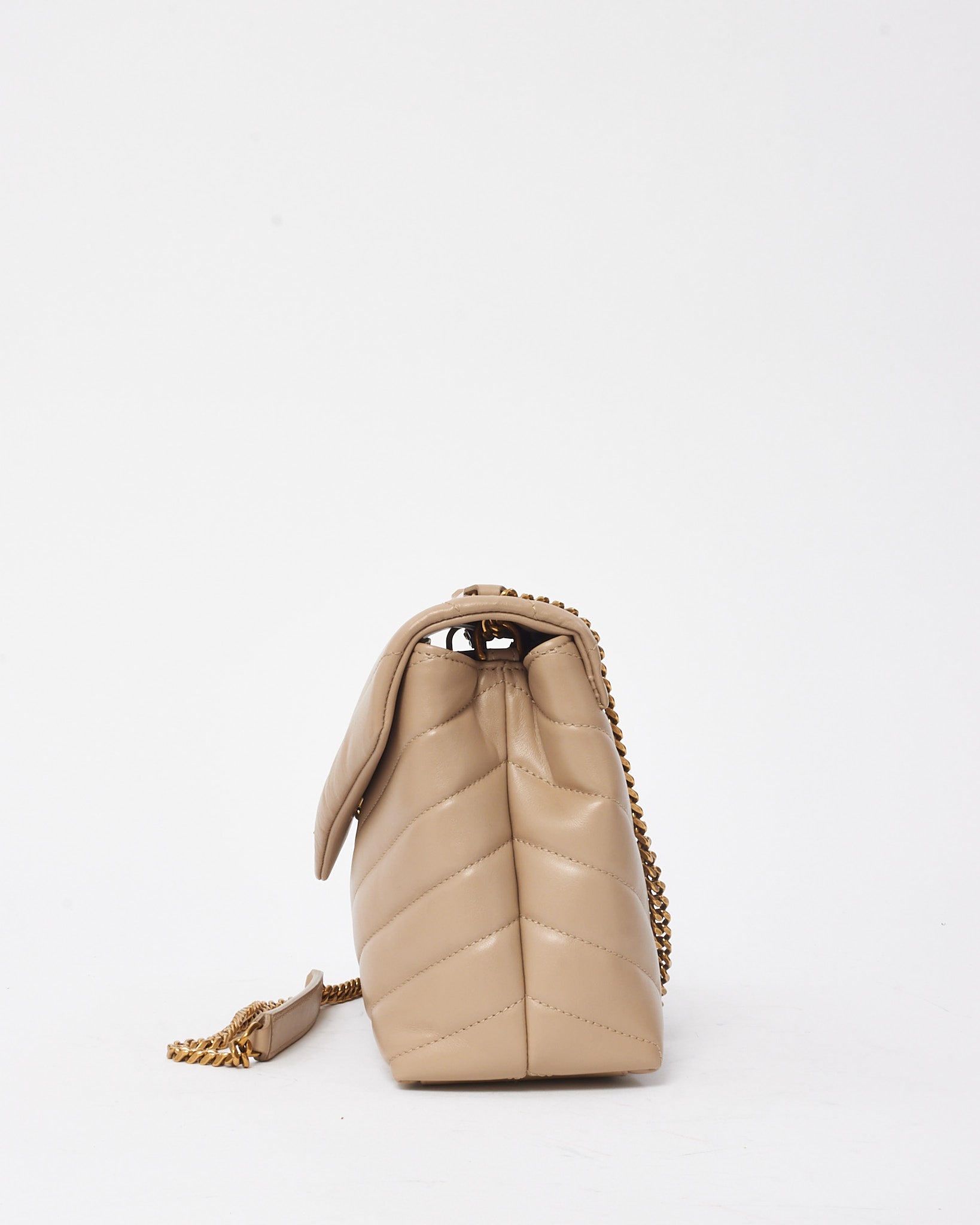 Sophisticated and versatile, this pre-loved authentic Saint Laurent Small Loulou Shoulder Bag is crafted in supple beige chevron-quilted leather and finished with gold-tone hardware (GHW). The structured silhouette includes the iconic YSL monogram on the front flap and an adjustable chain-and-leather strap for shoulder or crossbody wear. Ideal for day to evening, this bag brings subtle luxury and enduring style to any wardrobe.