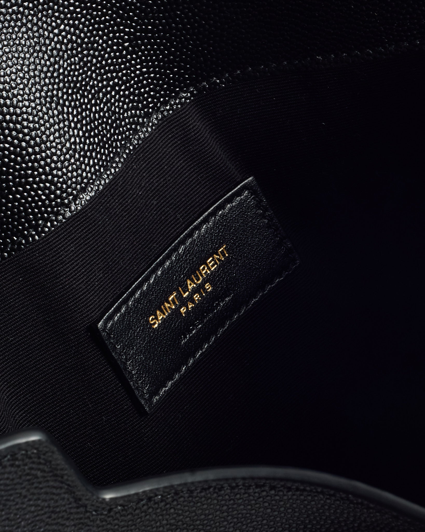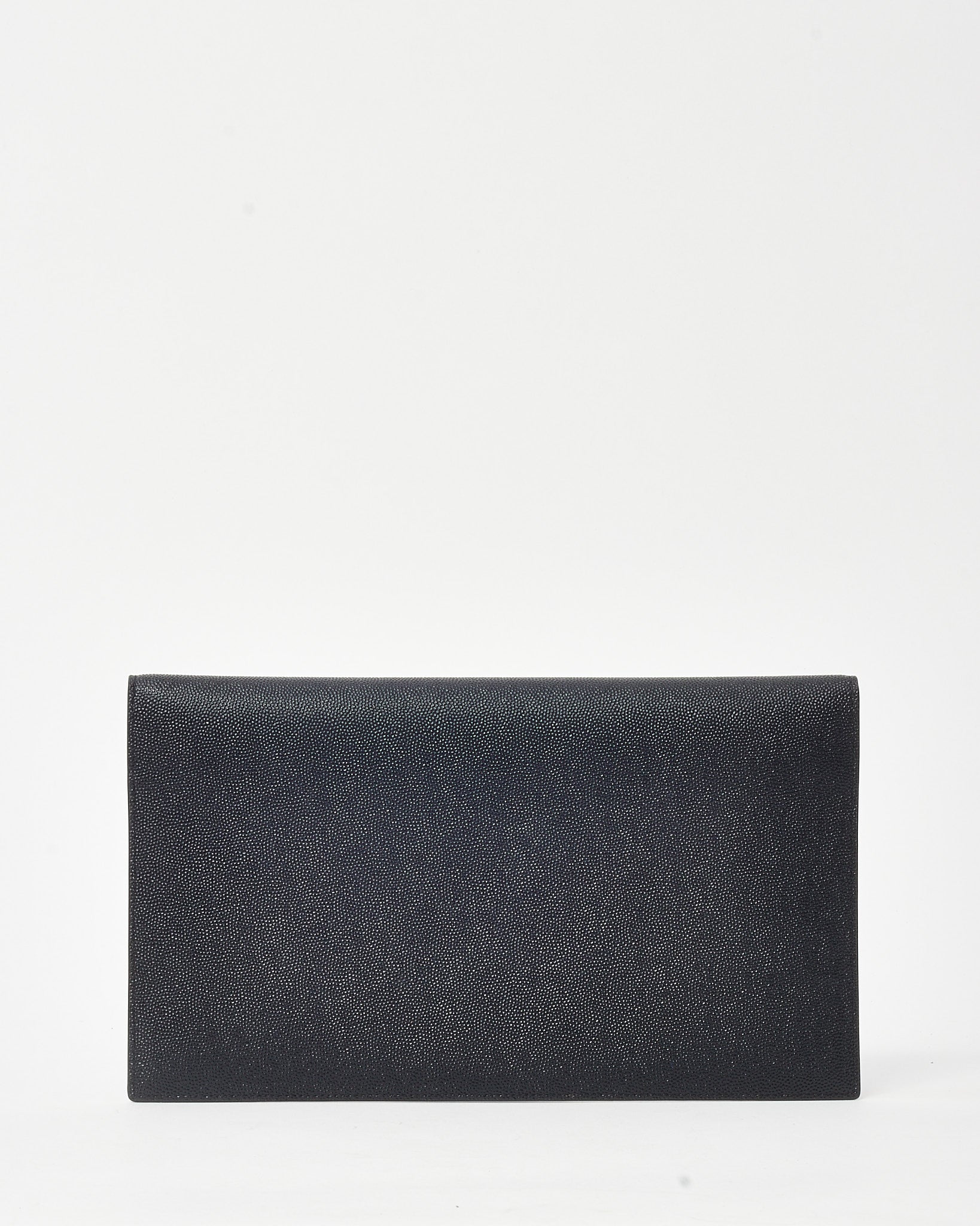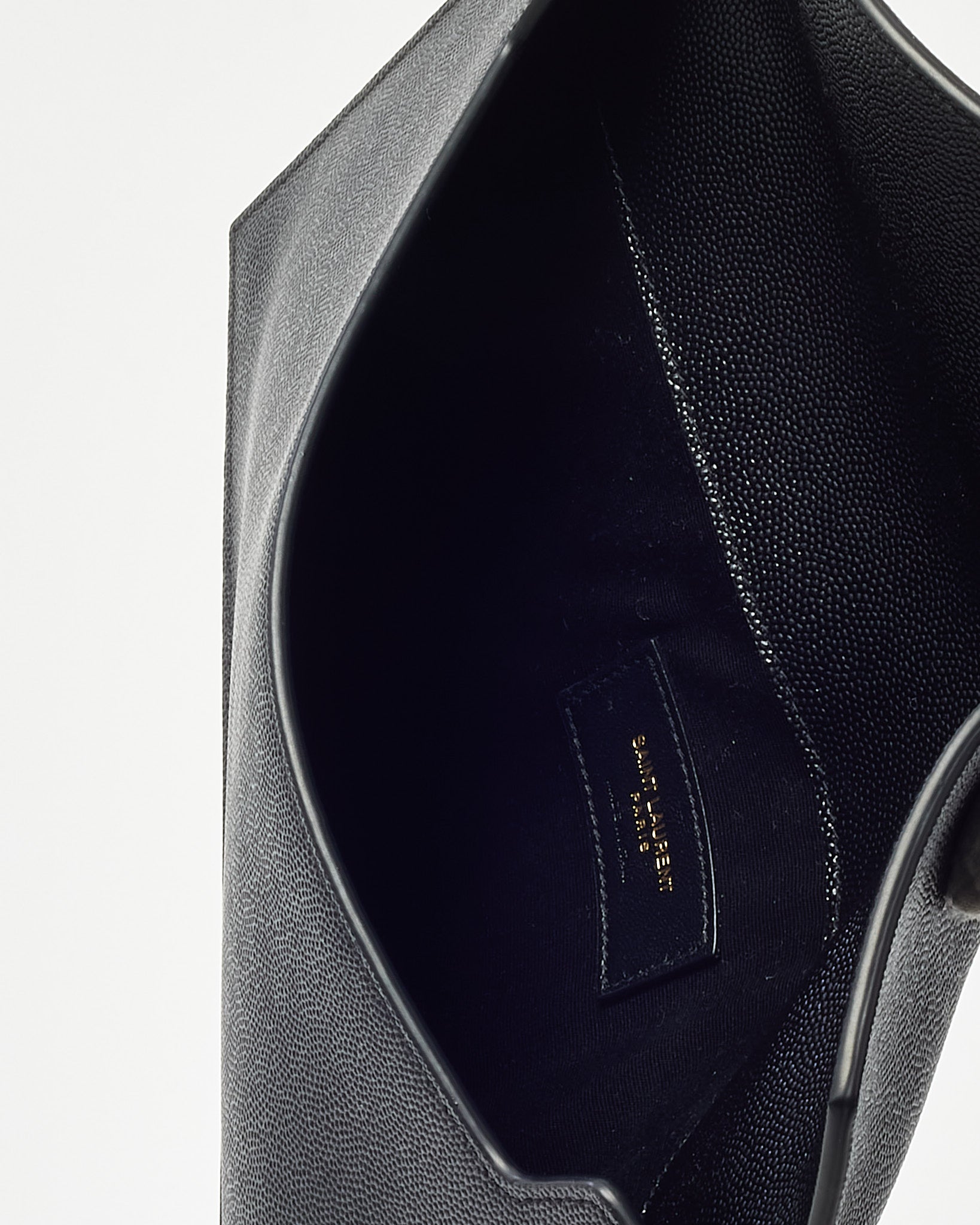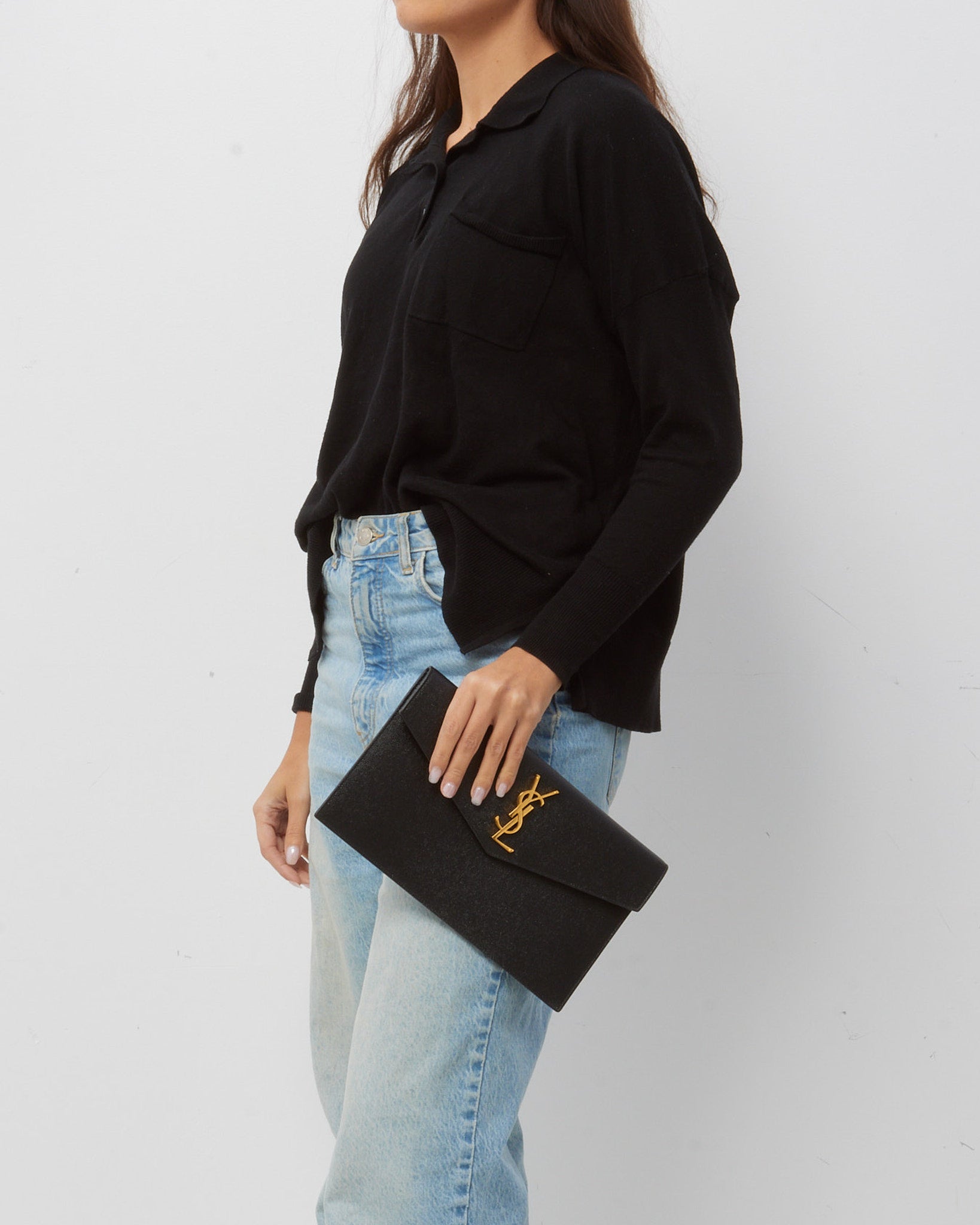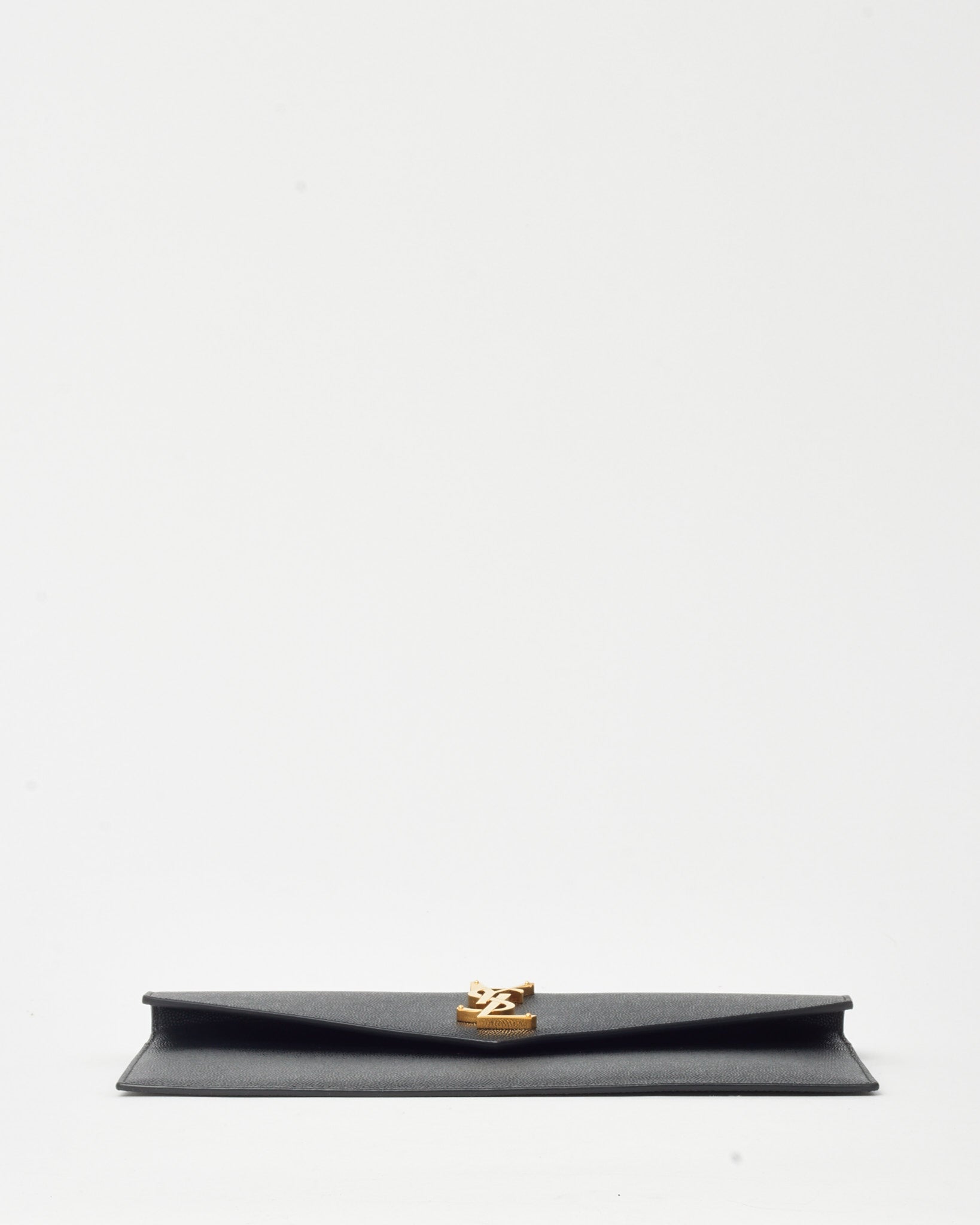 Sleek, polished, and endlessly versatile, this pre-loved authentic Saint Laurent Black Grained Leather GHW YSL Uptown Clutch is crafted in textured black grained leather for a refined, structured finish. The minimalist envelope silhouette is elevated by the iconic YSL logo in gold-tone hardware, delivering instant designer recognition with understated elegance. Designed with a slim profile and secure flap closure, this Saint Laurent clutch transitions effortlessly from day to evening styling. A timeless luxury accessory that blends modern sophistication with signature Parisian edge.