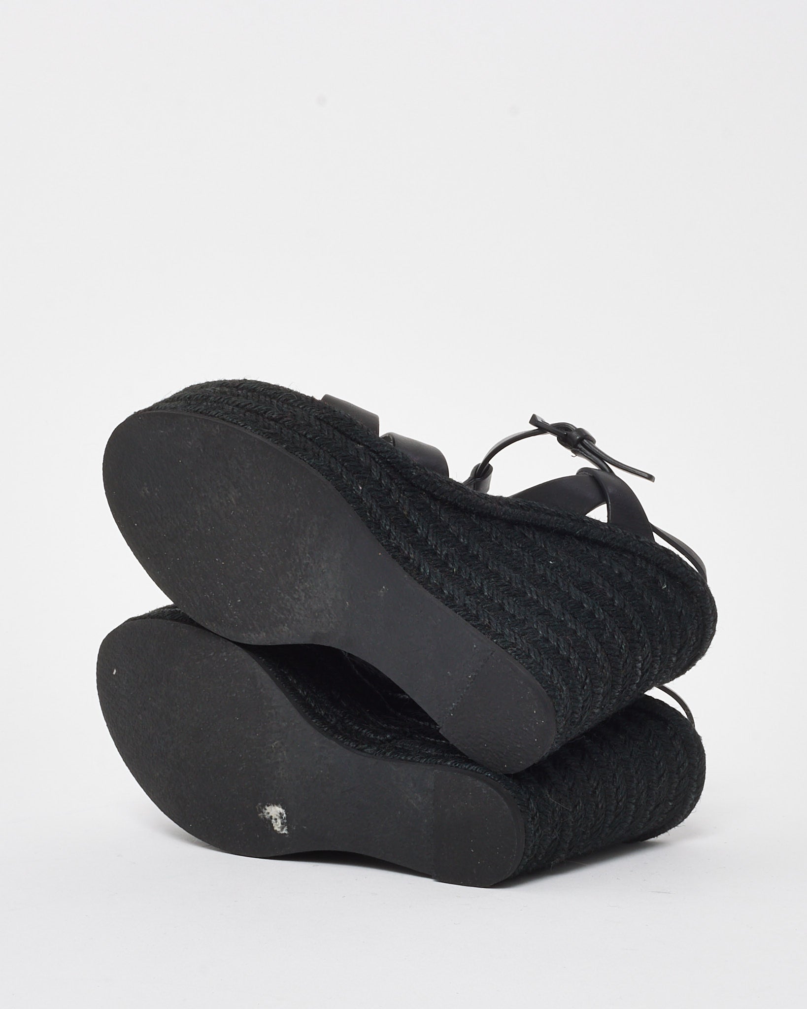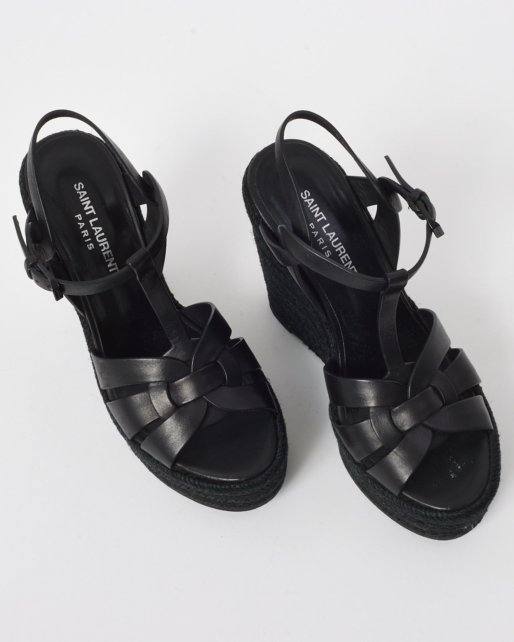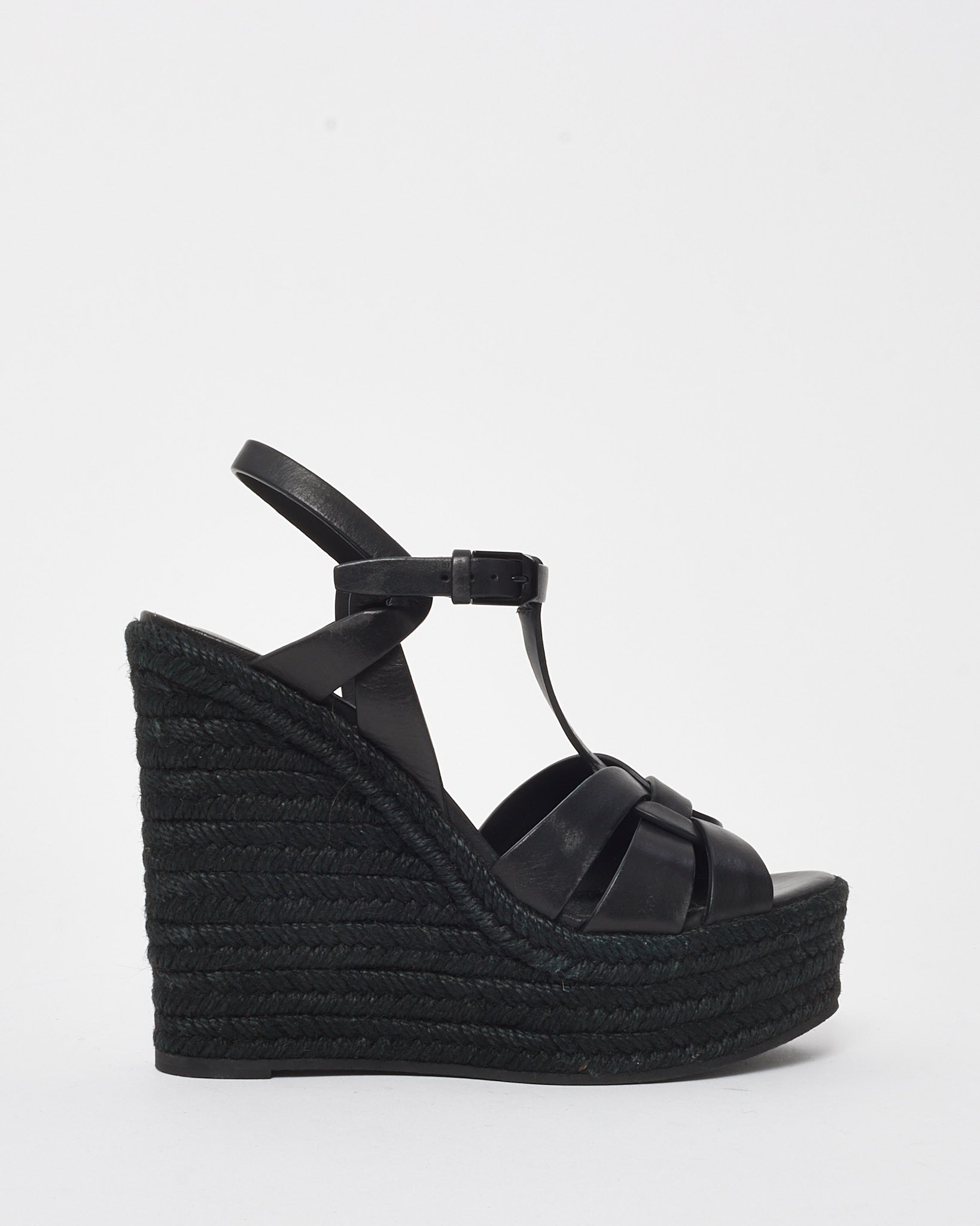 Channel elevated summer elegance with these pre-loved authentic Saint Laurent Tribute wedges, crafted in smooth black leather with braided espadrille soles. Featuring the brand’s iconic interwoven front straps and a secure ankle buckle closure, this timeless silhouette offers both comfort and height with its classic wedge heel. A versatile warm-weather staple, they pair effortlessly with everything from breezy dresses to tailored separates—exuding effortless Parisian chic.