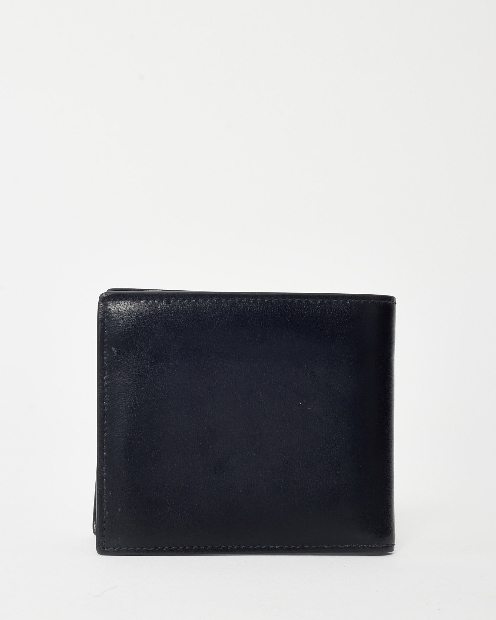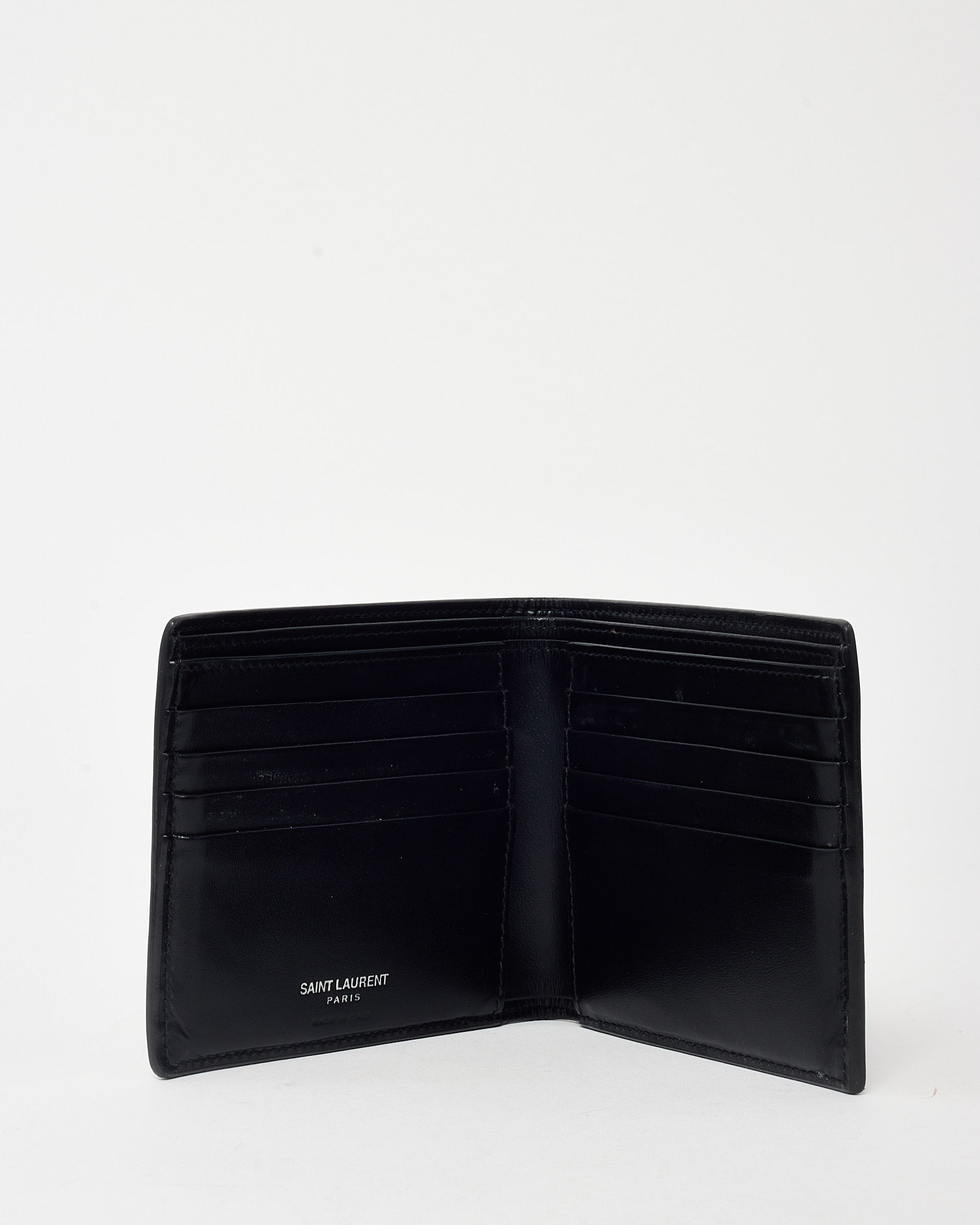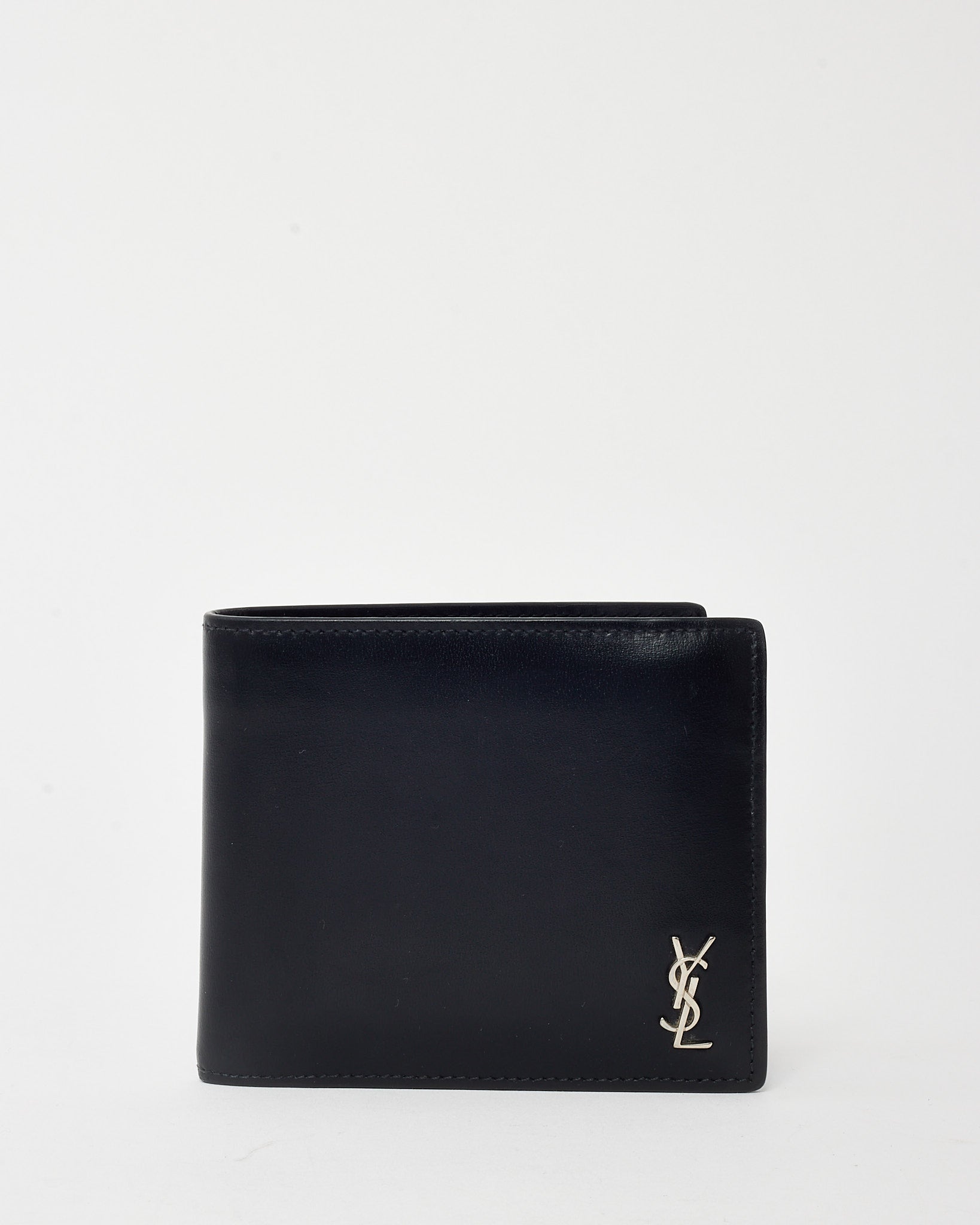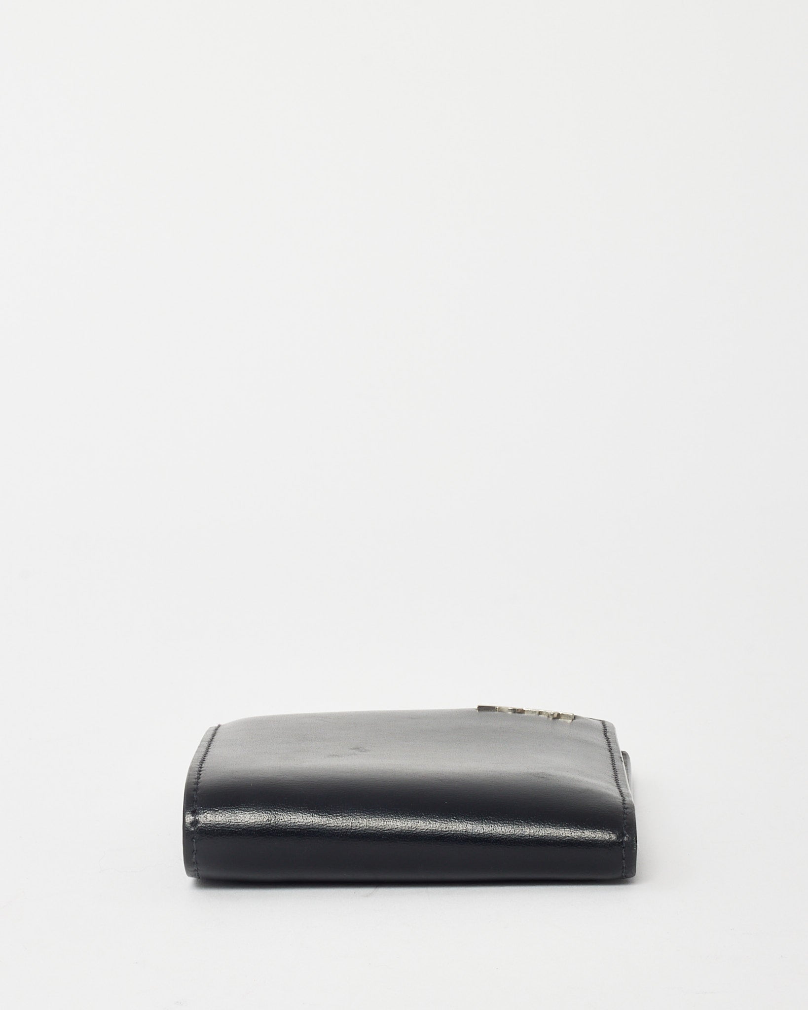 Add sleek refinement to your essentials with this pre-loved authentic Saint Laurent Black Shiny Smooth Leather YSL Tiny Cassandre E/W Wallet with silver-tone hardware. Crafted from glossy black leather, this slim wallet features the iconic Cassandre YSL monogram in polished silver on the front flap. The compact east-west silhouette opens to reveal card slots and compartments for streamlined organization. A minimalist yet luxurious piece that adds a polished finish to your everyday carry.