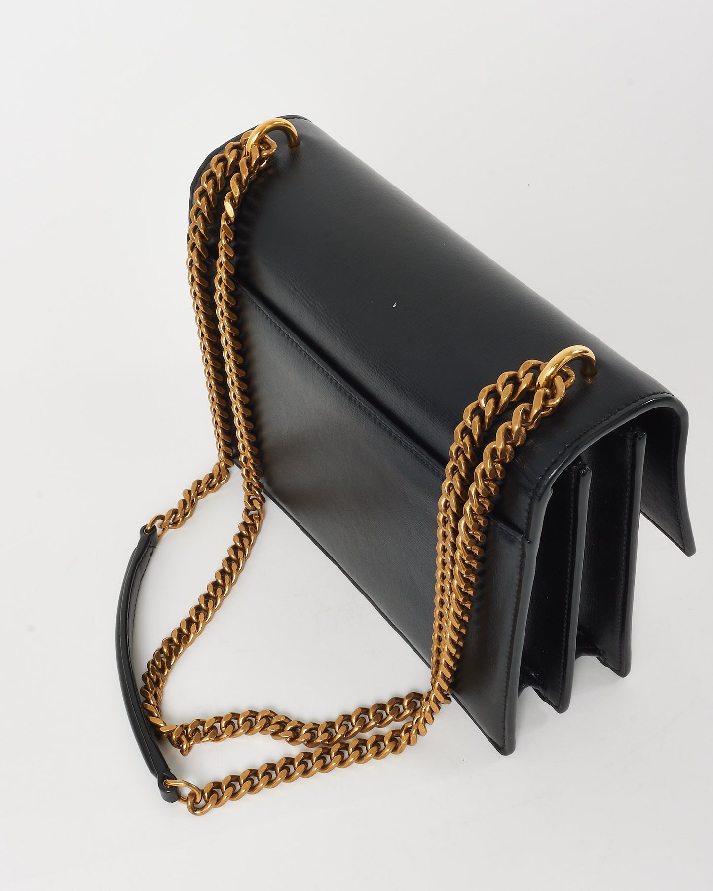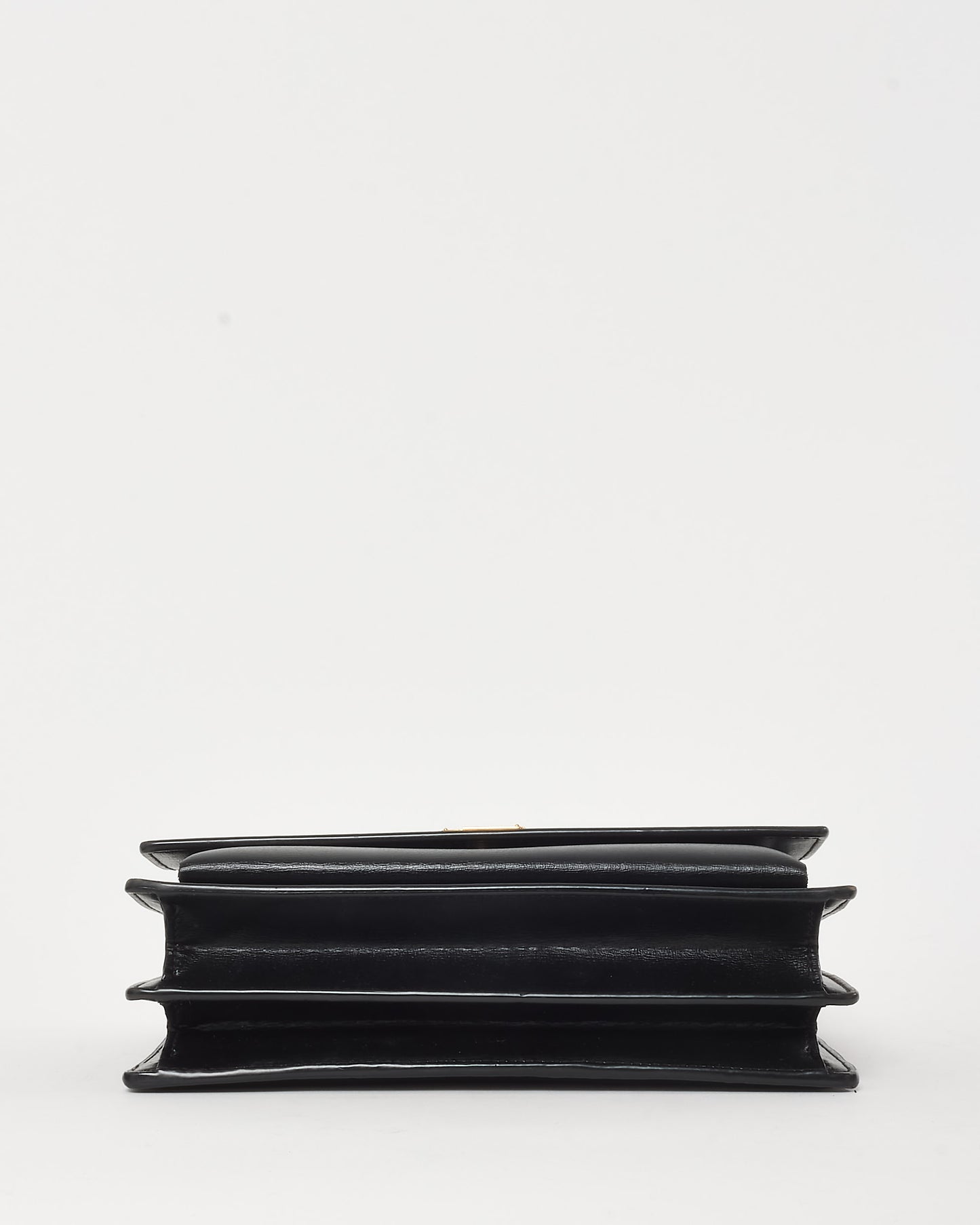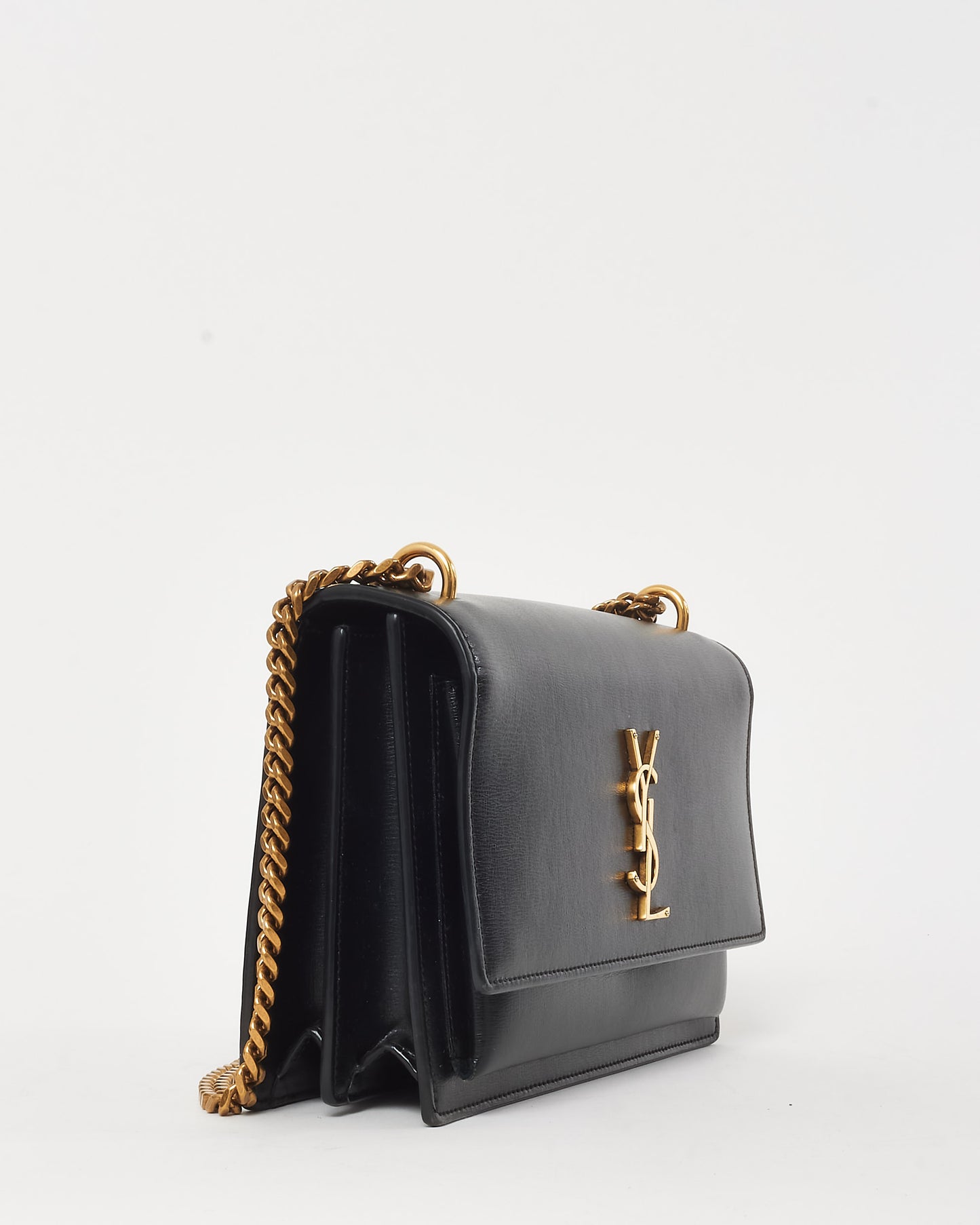 Sleek, structured, and undeniably elegant, the pre-owned authentic Saint Laurent Black Smooth Leather YSL Medium Sunset Bag is a modern icon of refined sophistication. Crafted from smooth black calfskin leather, this timeless silhouette features a sharp rectangular shape, signature gold-tone YSL logo hardware and a double-gusset design for effortless organization.