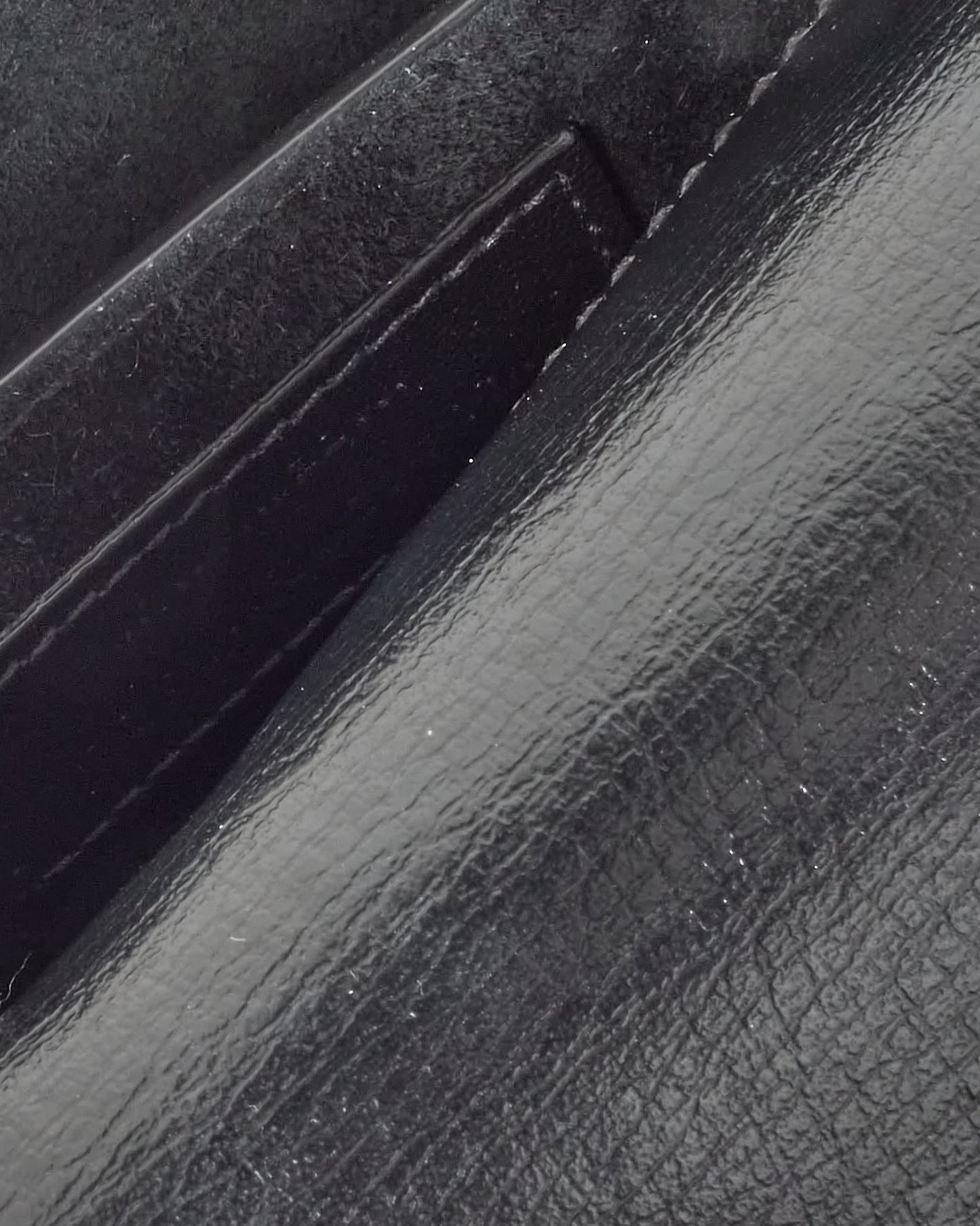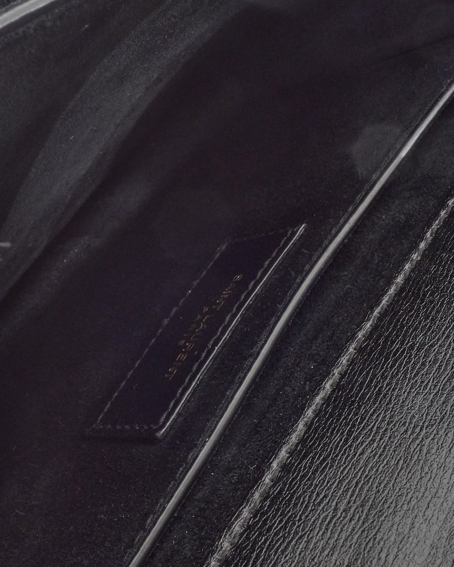 The sliding chain strap allows for shoulder or crossbody wear, while the magnetic flap closure ensures easy access to essentials. Inside, you’ll find a suede-lined interior with multiple compartments and a slip pocket.