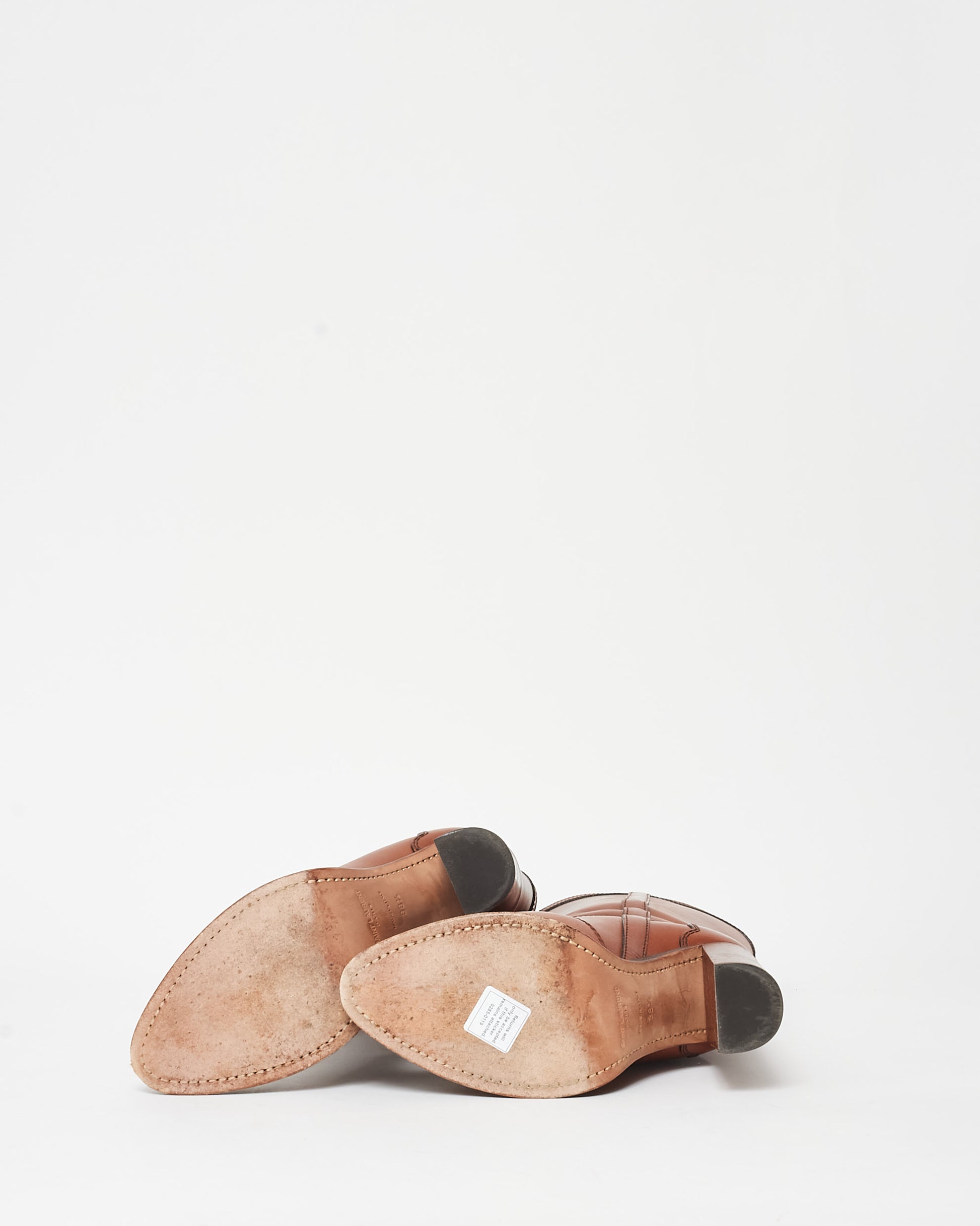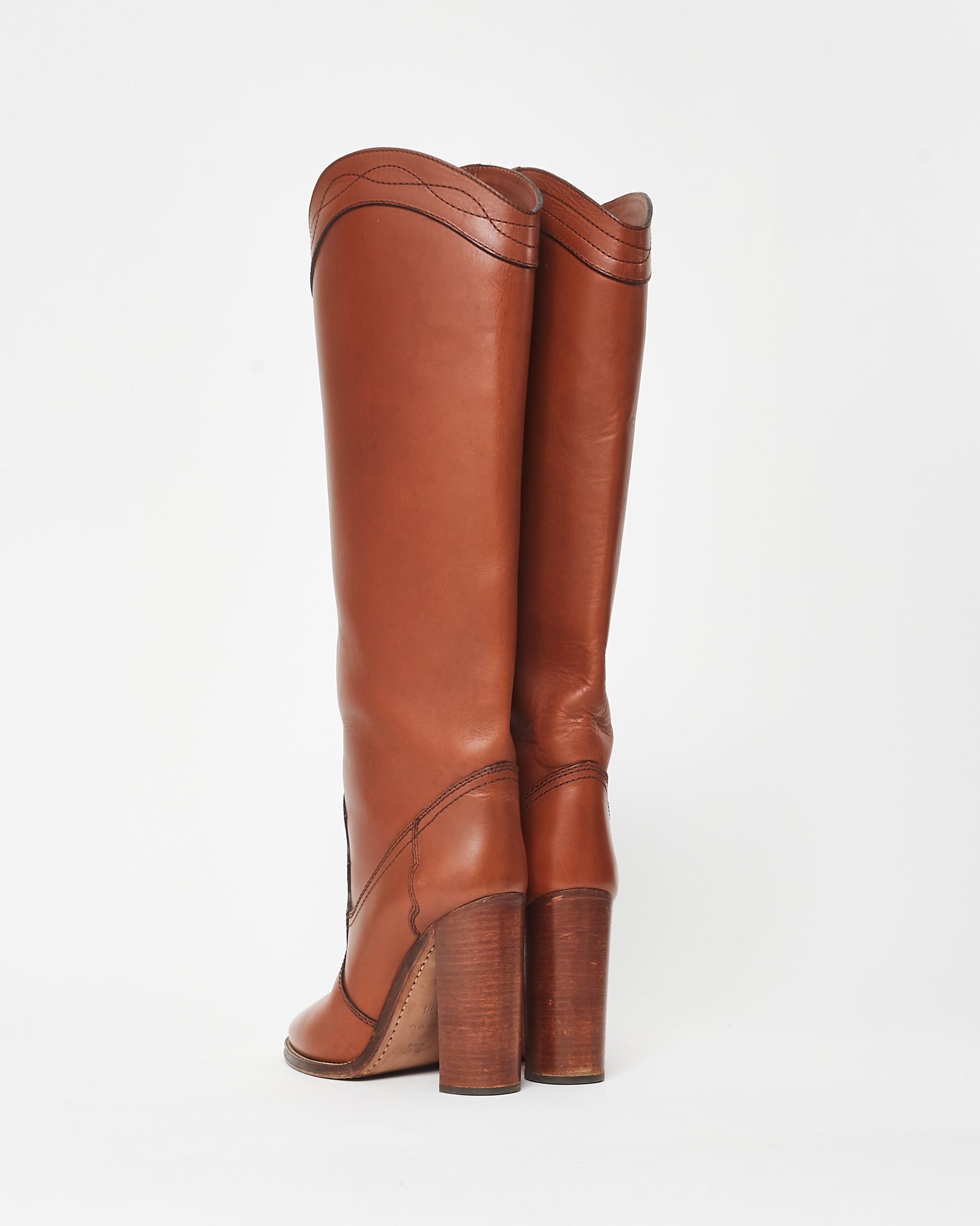 Step into timeless elegance with the authentic pre-owned Saint Laurent Brown Leather Western Knee High Boot in size 38.5. Crafted from premium brown leather, these knee-high boots feature a sleek, streamlined silhouette that embodies modern sophistication while paying homage to classic Western design. With intricate stitching details and a slightly pointed toe, these boots exude an effortless cool. The comfortable block heel ensures stability, making them perfect for all-day wear. Shop pre-owned authentic Saint Laurent shoes at Retyche.
