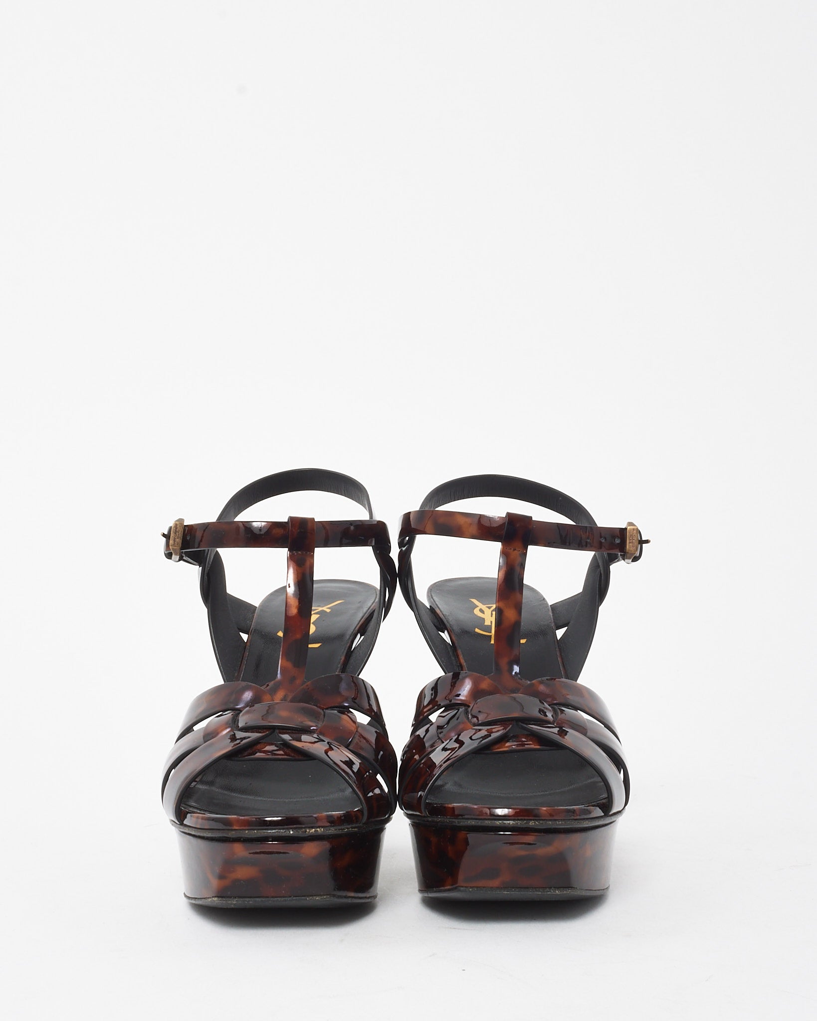 Elevate your step with these pre-loved authentic Saint Laurent Tribute 105 platform sandals, rendered in glossy brown tortoise-print patent leather. A high-impact silhouette, this iconic style features interwoven straps across the toe, a slim adjustable ankle strap, and a dramatic stiletto heel balanced by a sturdy platform. The signature Tribute design is equal parts sensual and architectural—perfect for making a statement at evening events or adding polished edge to day-to-night looks.