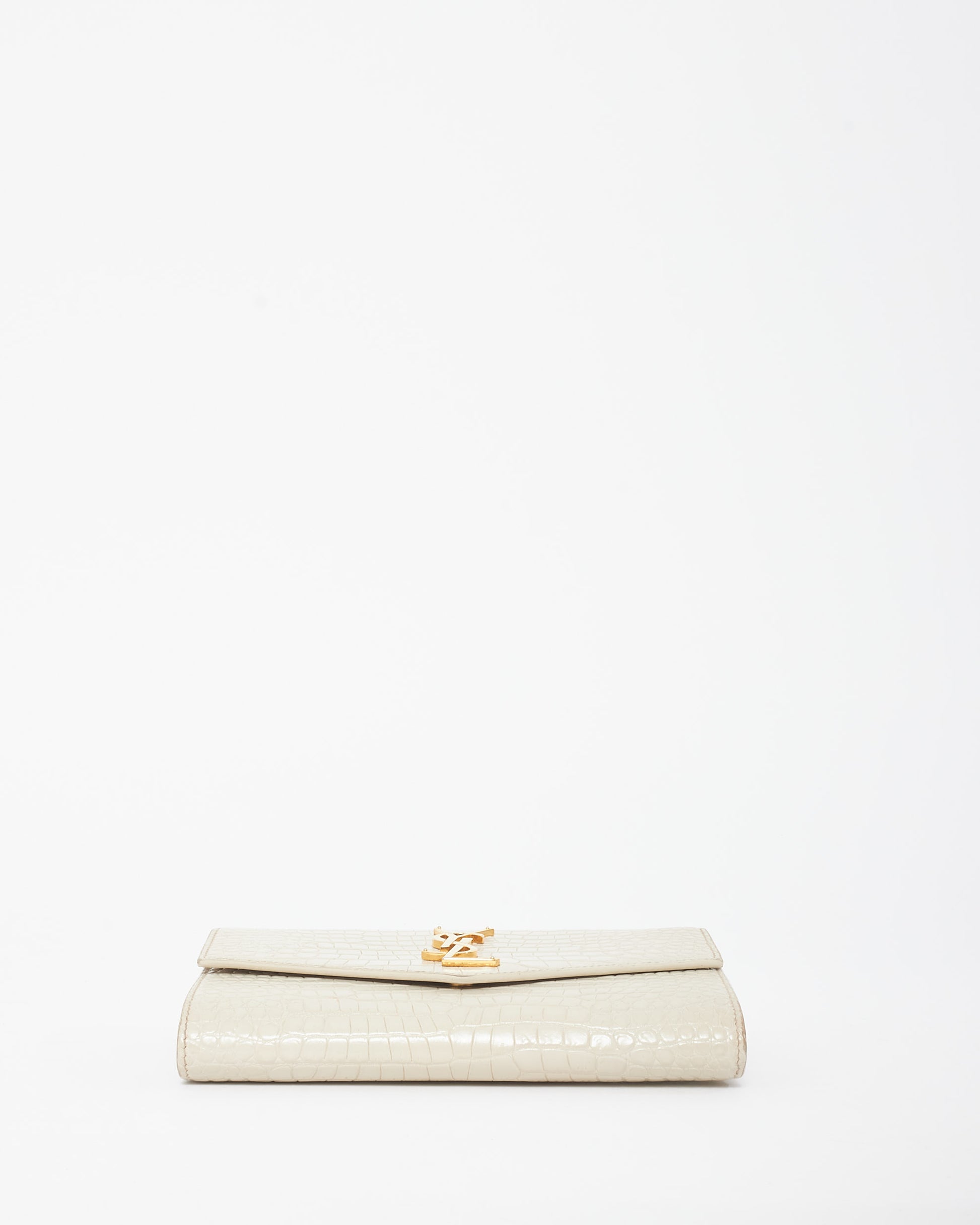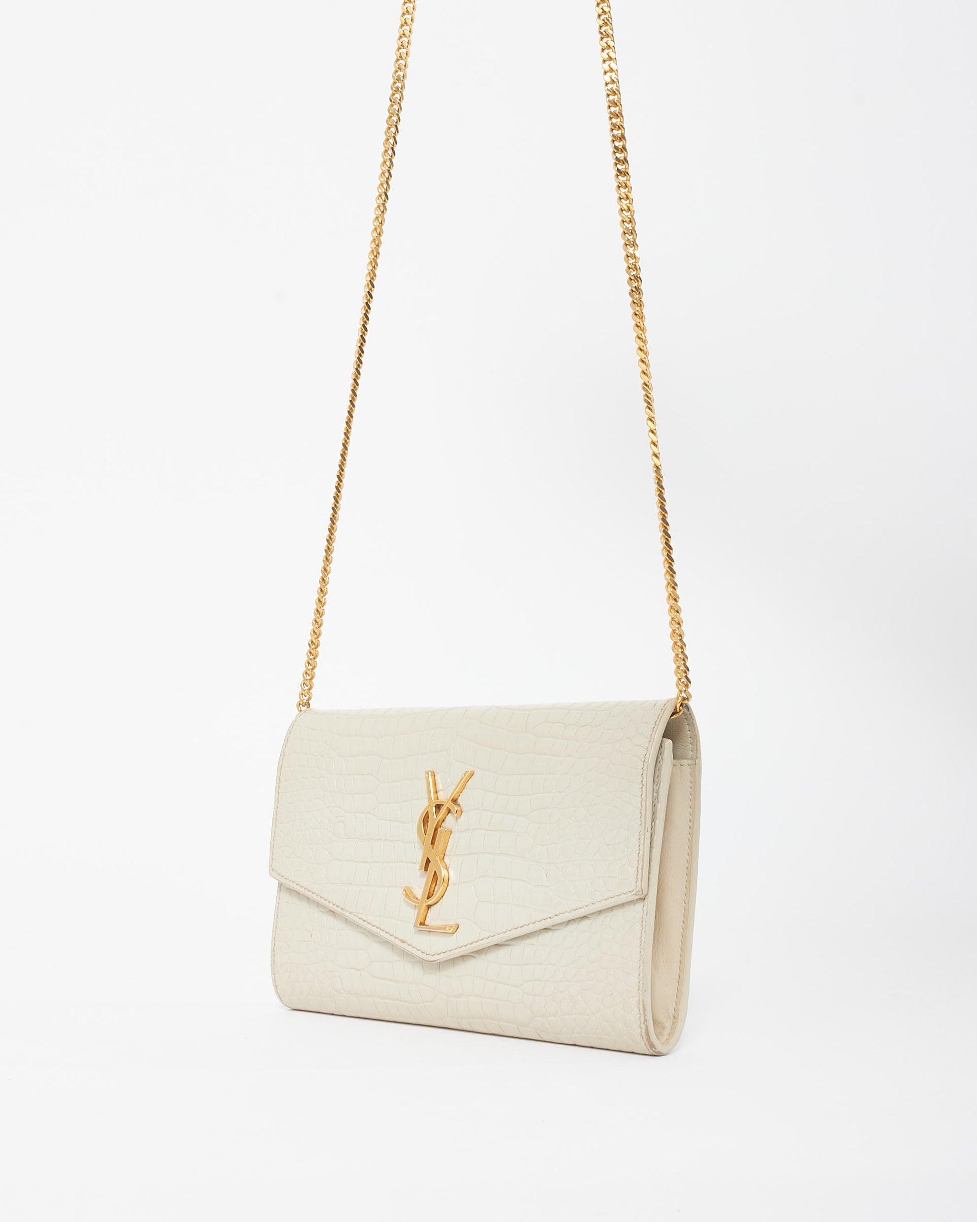 Explore Saint Laurent's exquisite collection of handbags, featuring this certified pre-owned Cream Croc Embossed Uptown Wallet On Chain. Embodying timeless elegance and modern sustainability, each piece, including favorites like this, is authenticated by Retyche. Discover sustainable luxury — shop our current treasures or find inspiration for your next coveted find.