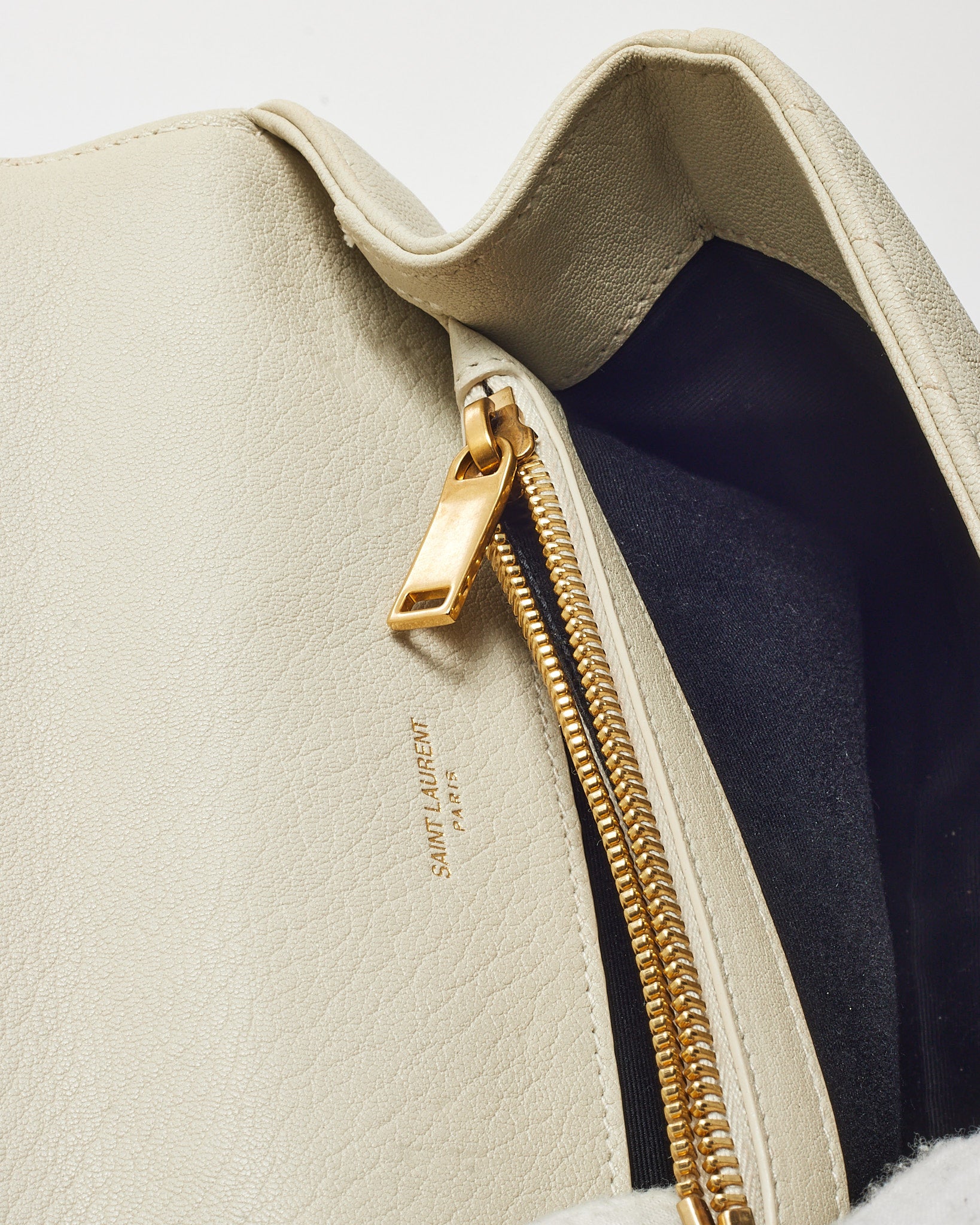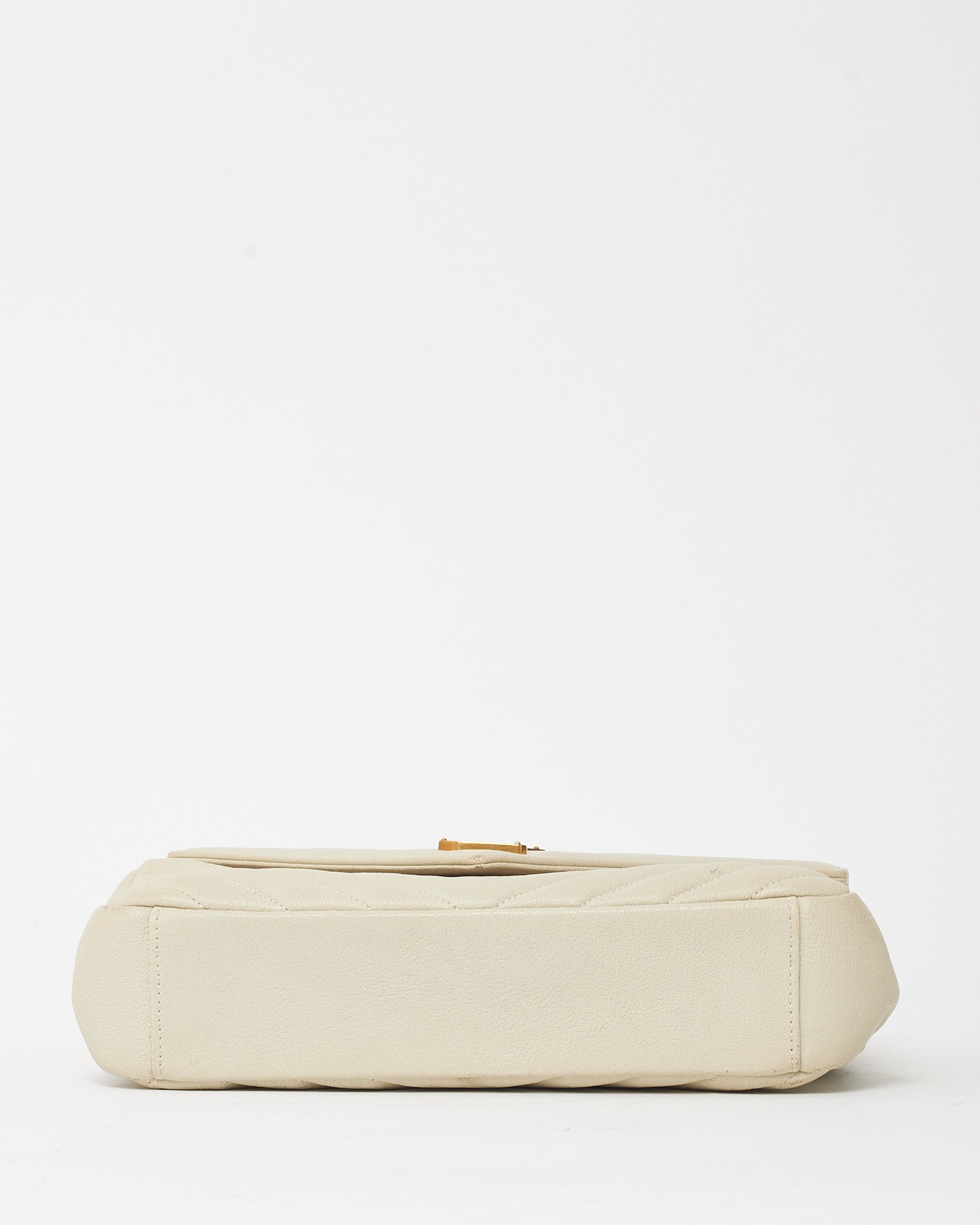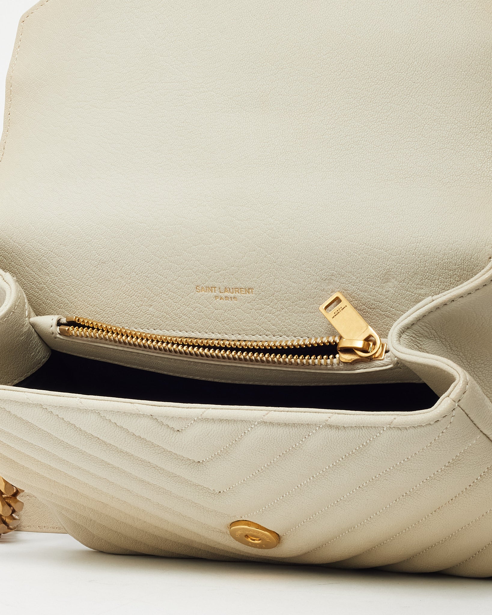 Add refined texture to your everyday lineup with this pre-loved authentic Saint Laurent Off-White Quilted Chevron Leather Medium College Bag with gold-tone hardware. Crafted from supple leather in a soft off-white hue, this structured silhouette features chevron quilting, a top handle, and the iconic YSL monogram on the front flap. The detachable chain and leather strap offers versatile carry options, while the divided interior keeps essentials organized. Polished and practical, this piece delivers effortless sophistication with signature Saint Laurent edge.