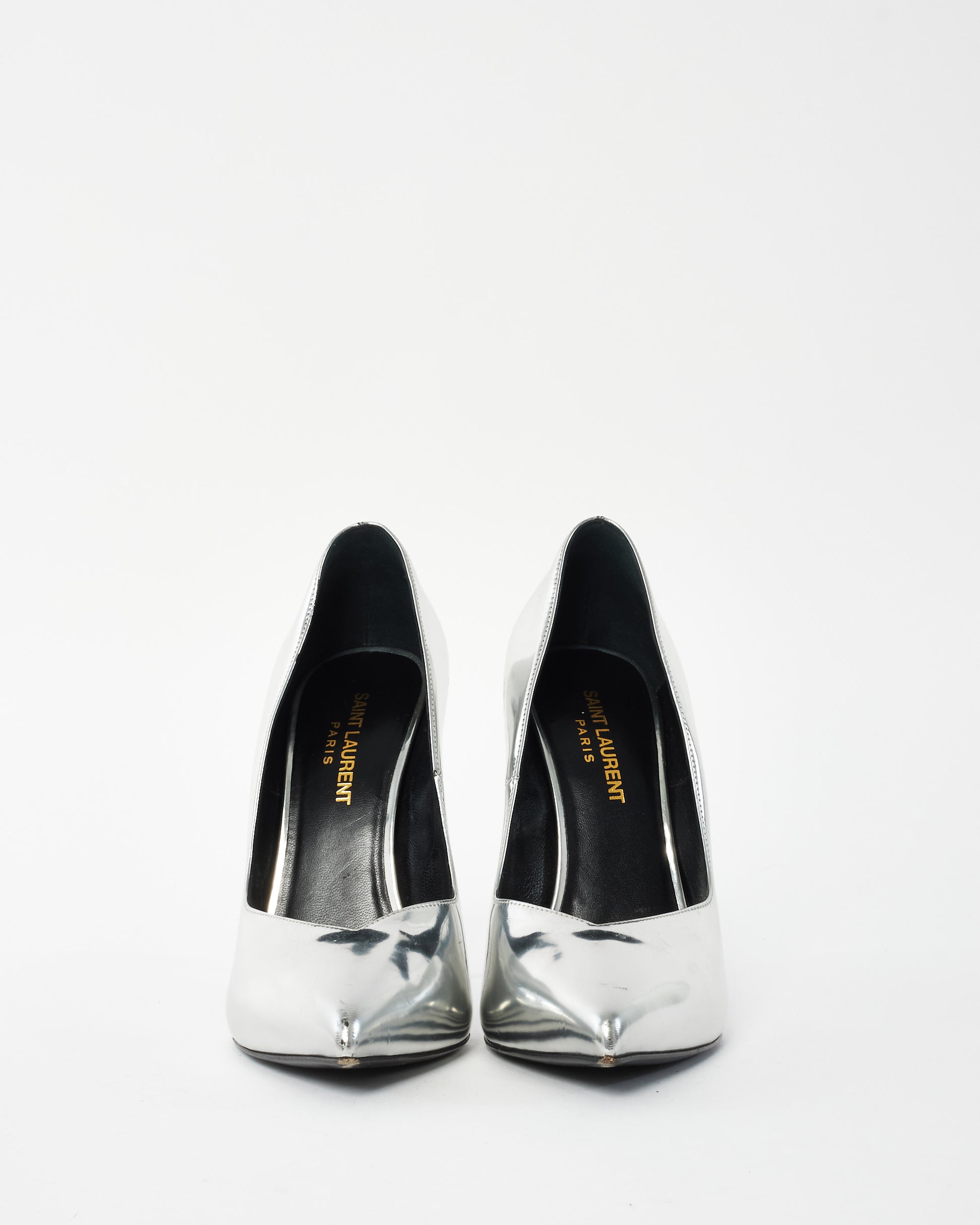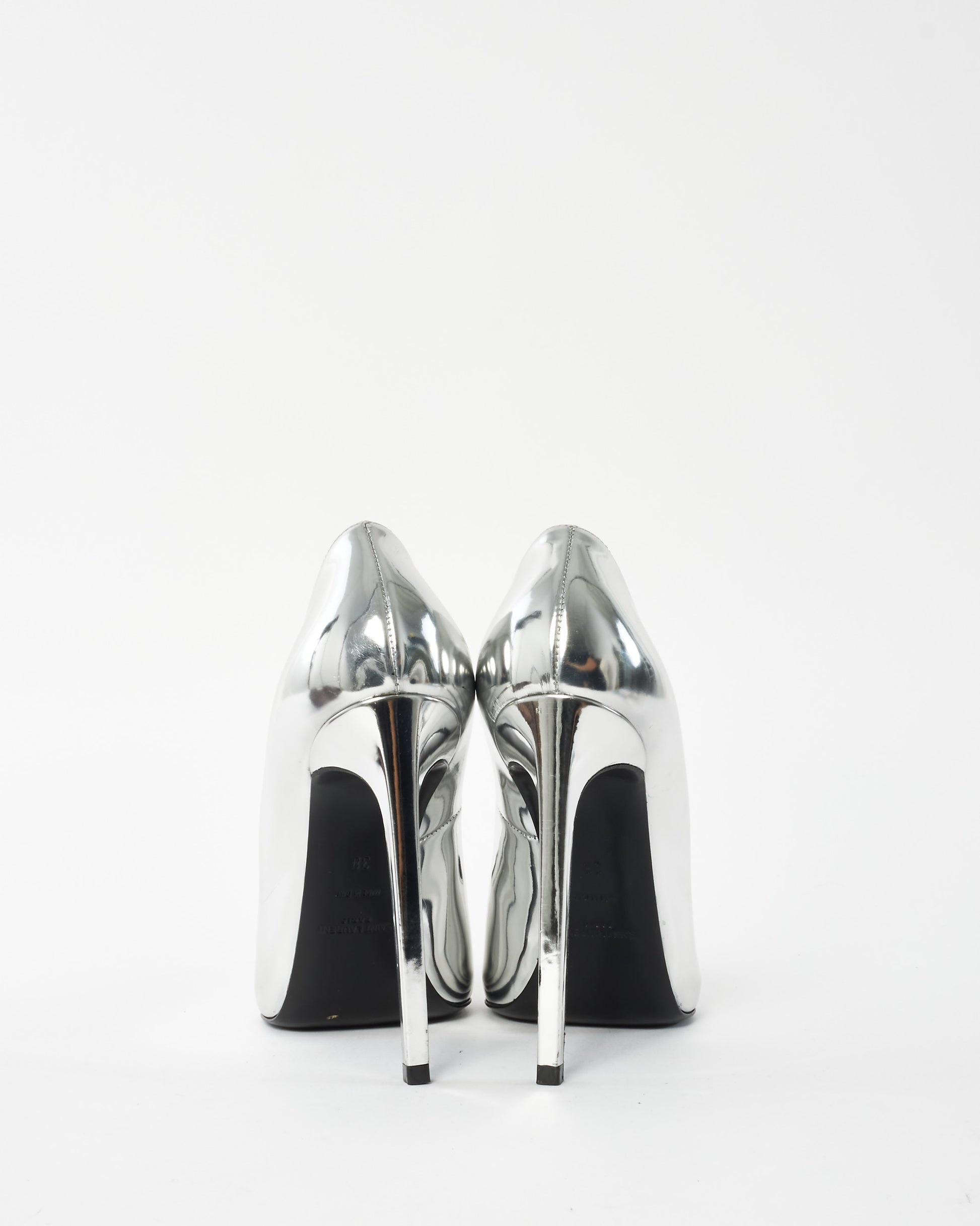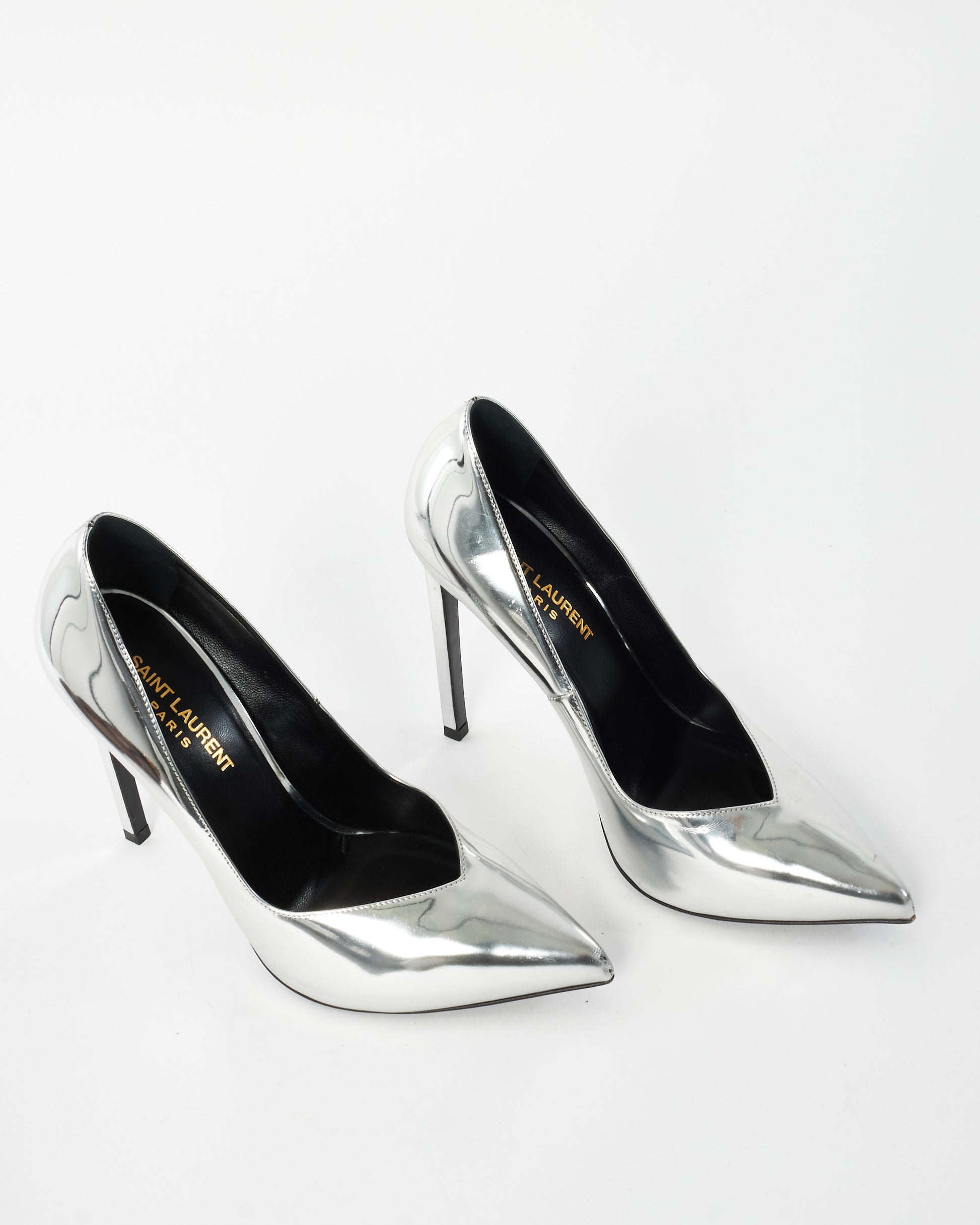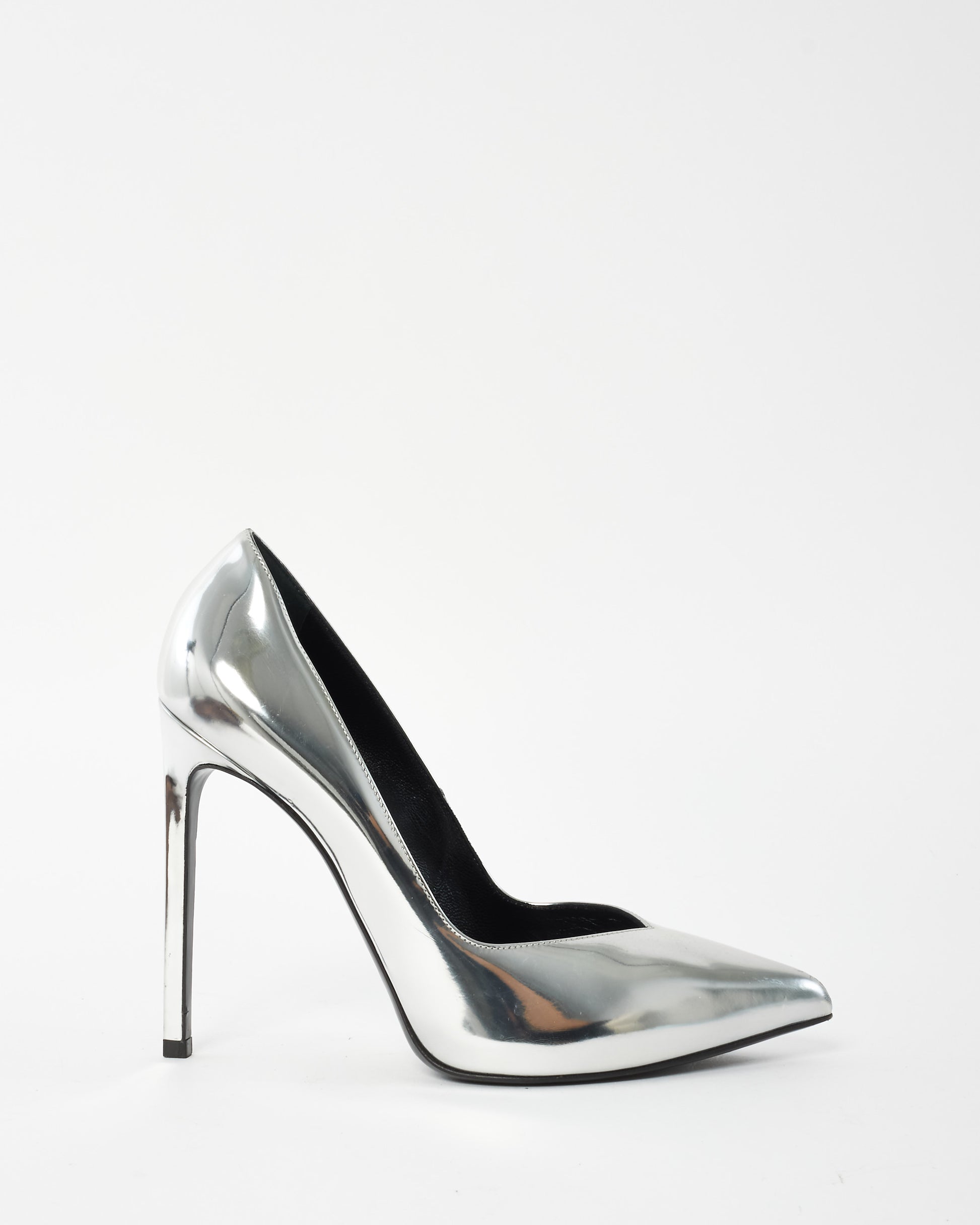 Explore Saint Laurent's exquisite collection of shoes, featuring this certified pre-owned Silver Mirror Pointed Toe Pumps - 38. Embodying timeless elegance and modern sustainability, each piece, including favorites like this, is authenticated by Retyche. Discover sustainable luxury — shop our current treasures or find inspiration for your next coveted find.