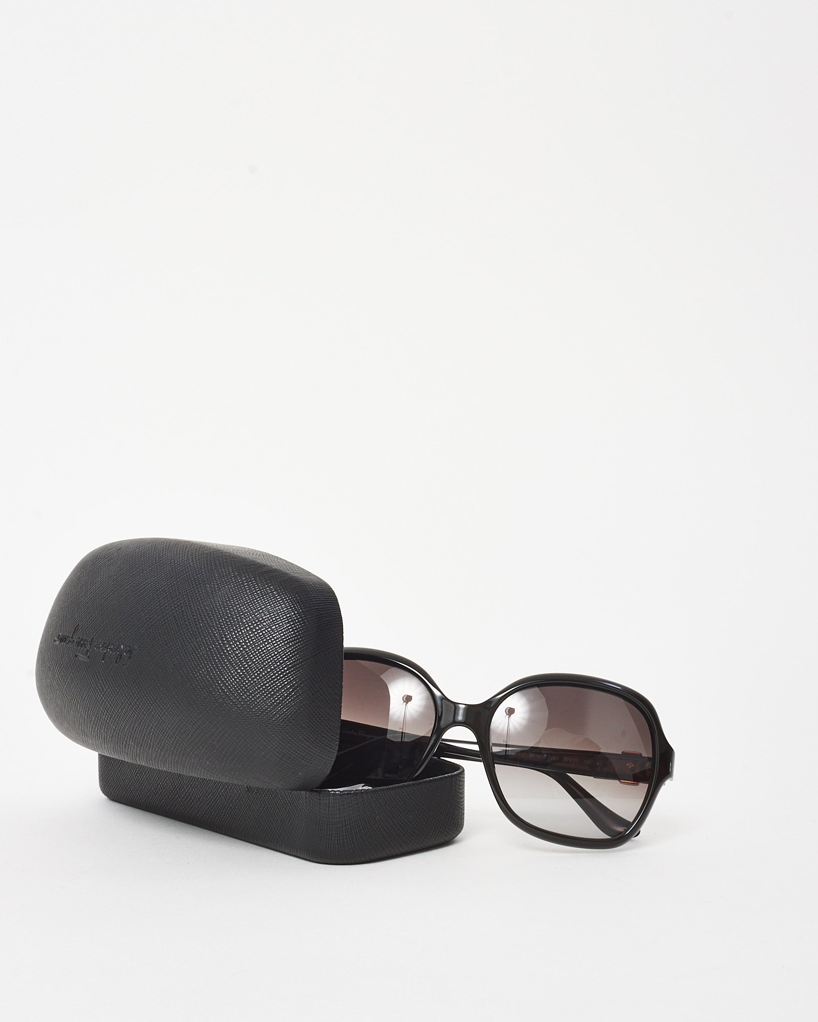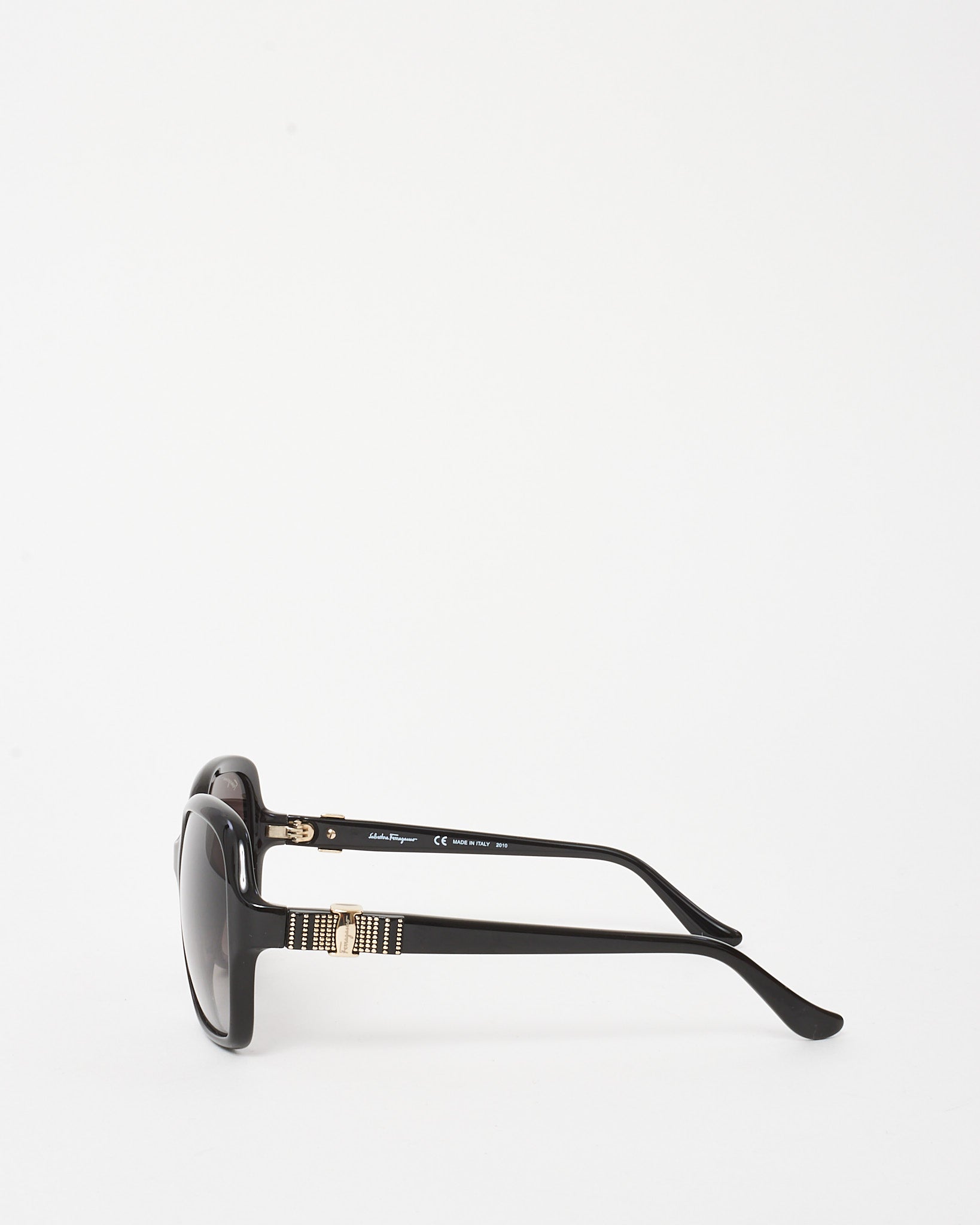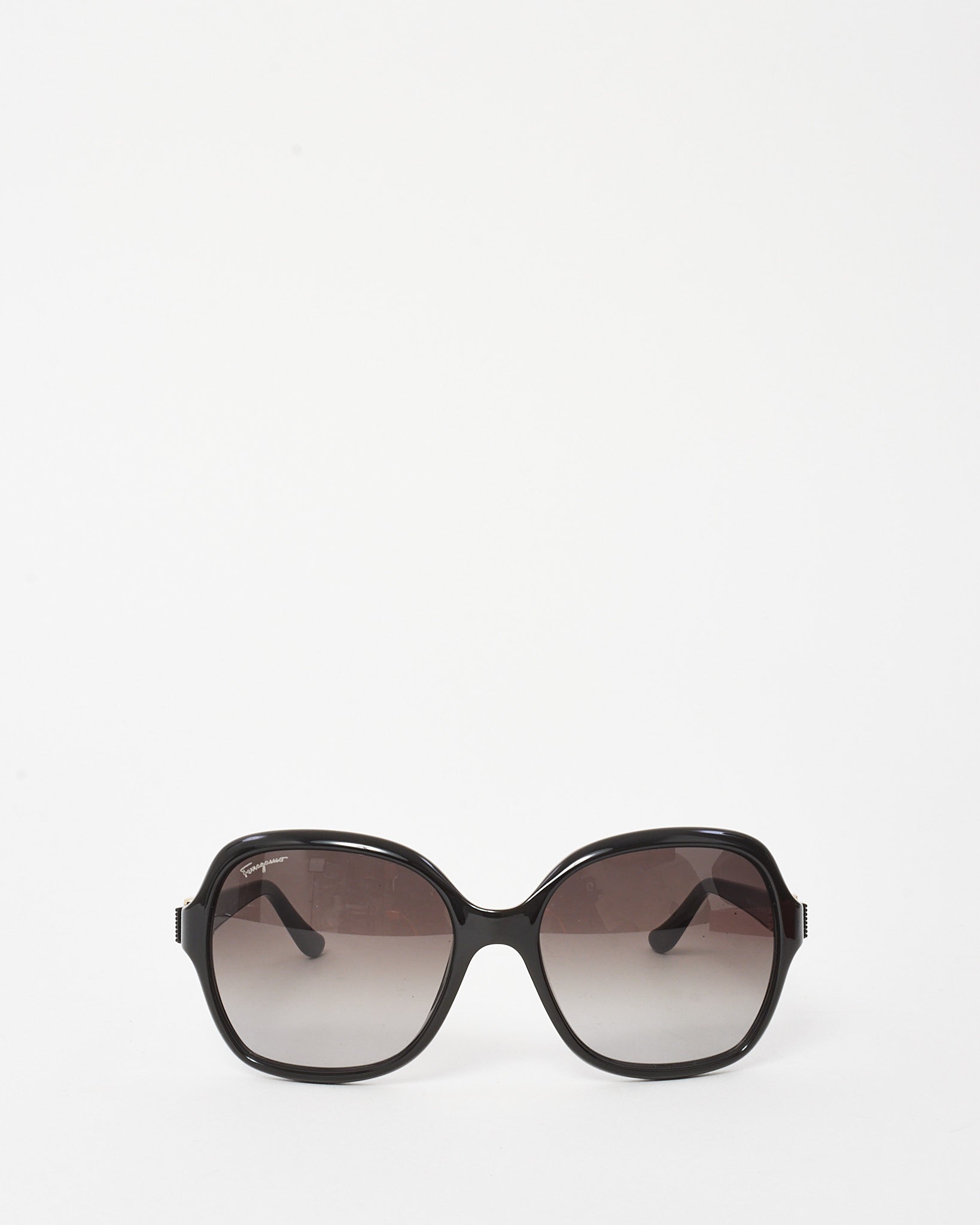 A bold expression of Italian sophistication, these pre-loved authentic Salvatore Ferragamo SF761S sunglasses feature oversized round frames in glossy black acetate. Silver-tone stud embellishments along the temples add a striking edge, while gradient lenses ensure refined sun protection. A perfect blend of classic glamour and modern flair, this pair is a standout accessory in any luxury wardrobe.