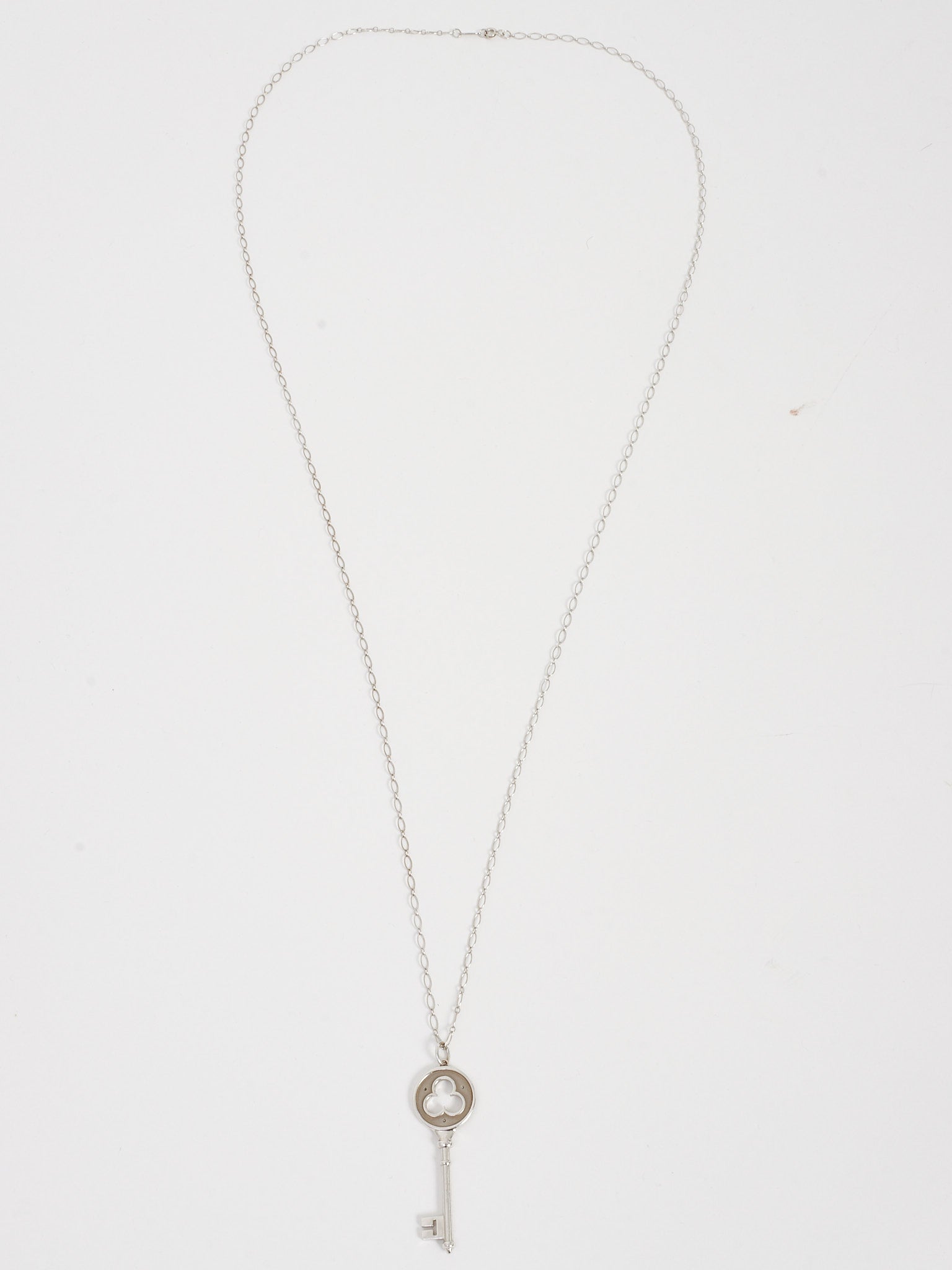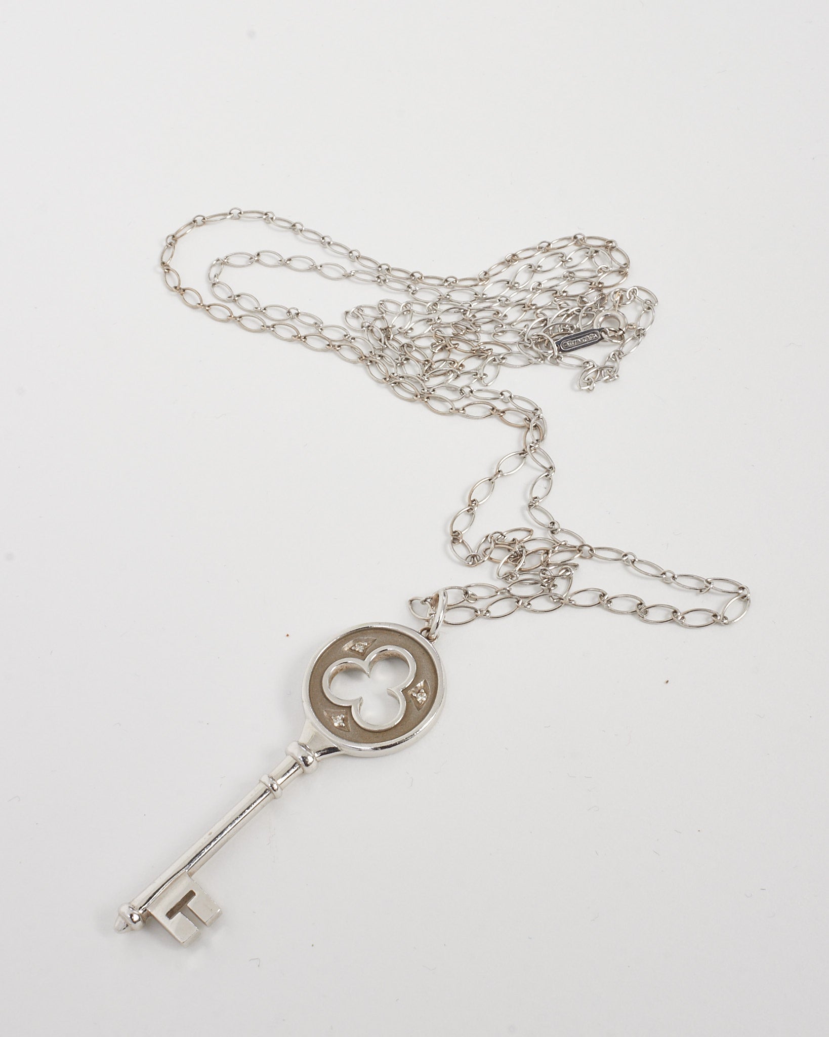 A symbol of elegance and new beginnings, this pre-loved authentic Tiffany & Co. Clover Key Pendant Necklace is crafted from luminous 750 18K white gold and suspended from a refined marquis link chain. The intricately detailed clover key is adorned with brilliant-cut diamonds, offering a timeless expression of hope, luck, and luxury. With its delicate yet striking silhouette, this necklace is ideal for layering or wearing as a meaningful standalone statement—an enduring piece that reflects Tiffany & Co.’s heritage of craftsmanship and charm.