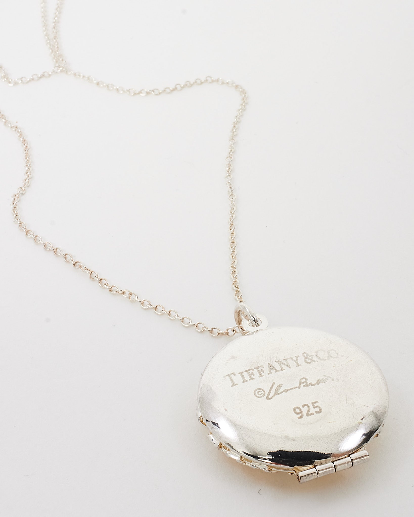 A timeless expression of craftsmanship and design, this pre-loved authentic Tiffany & Co. Paloma Picasso locket necklace features a delicately crafted filigree pendant in sterling silver with elegant 18k gold accents. The intricate starburst motif opens to reveal a hidden compartment, adding both sentiment and sophistication. Suspended from a classic silver chain, this piece blends vintage charm with modern elegance—an heirloom-worthy addition to any fine jewelry collection.