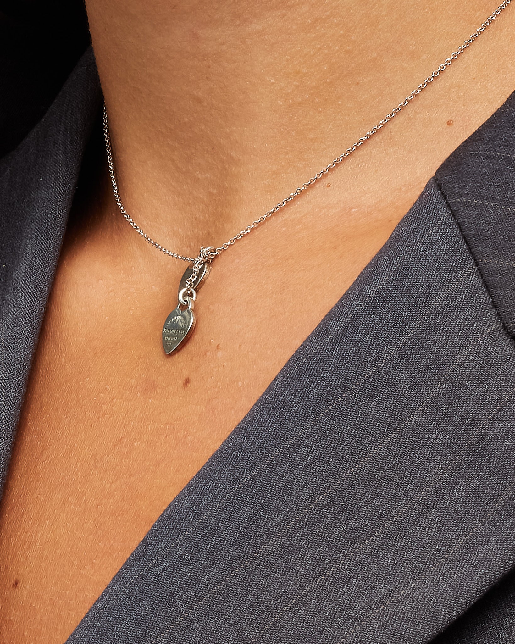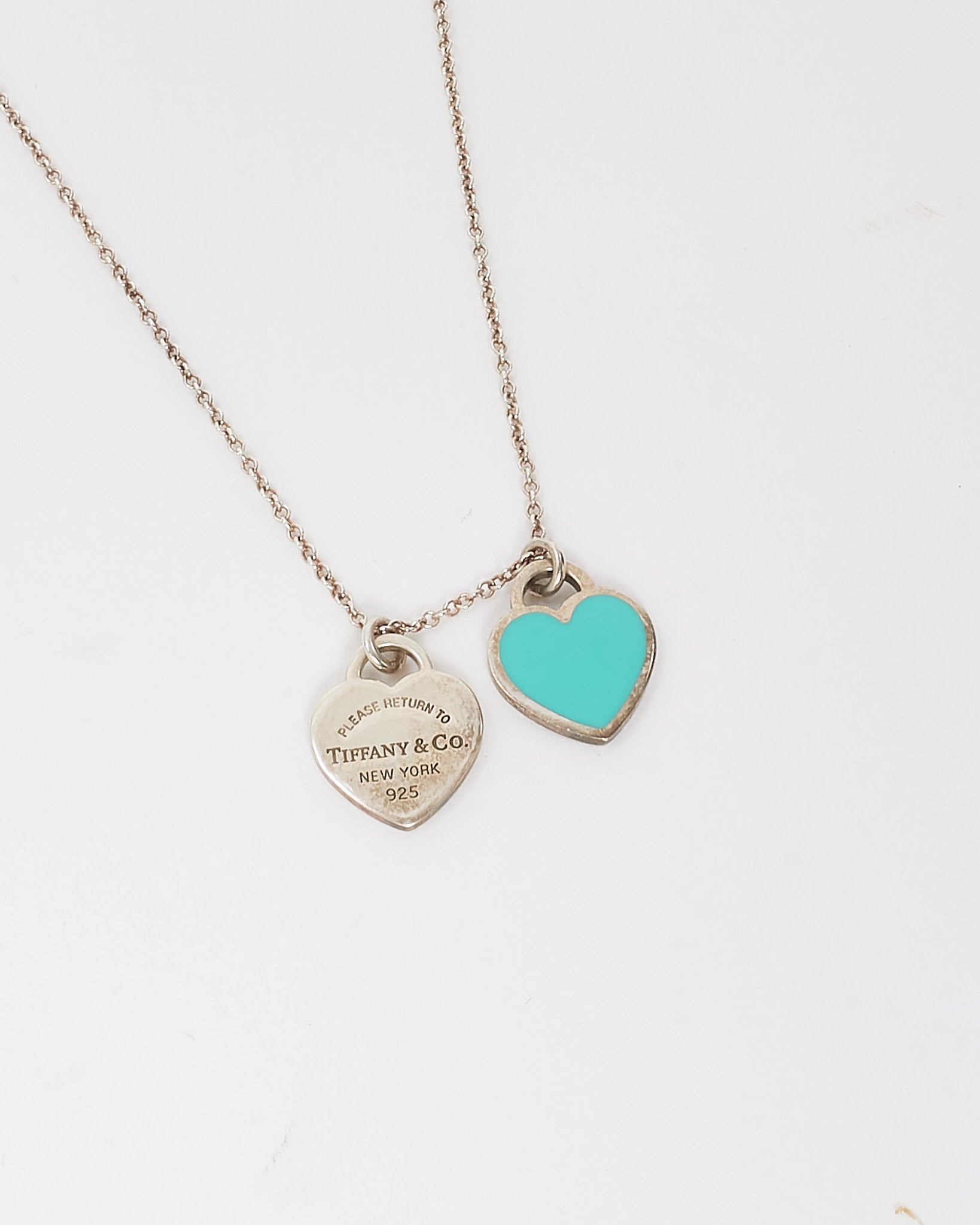 A charming take on a Tiffany classic, this pre-loved mini pendant necklace features two heart tags—one in polished sterling silver and the other in signature Tiffany Blue® enamel. Suspended from a delicate silver chain, the design is both playful and iconic, embodying the timeless elegance of the Return to Tiffany® collection. Perfect for everyday wear or gifting, this piece adds a subtle pop of color and sophistication to any jewelry stack.